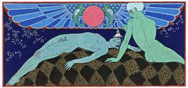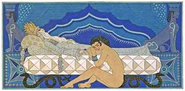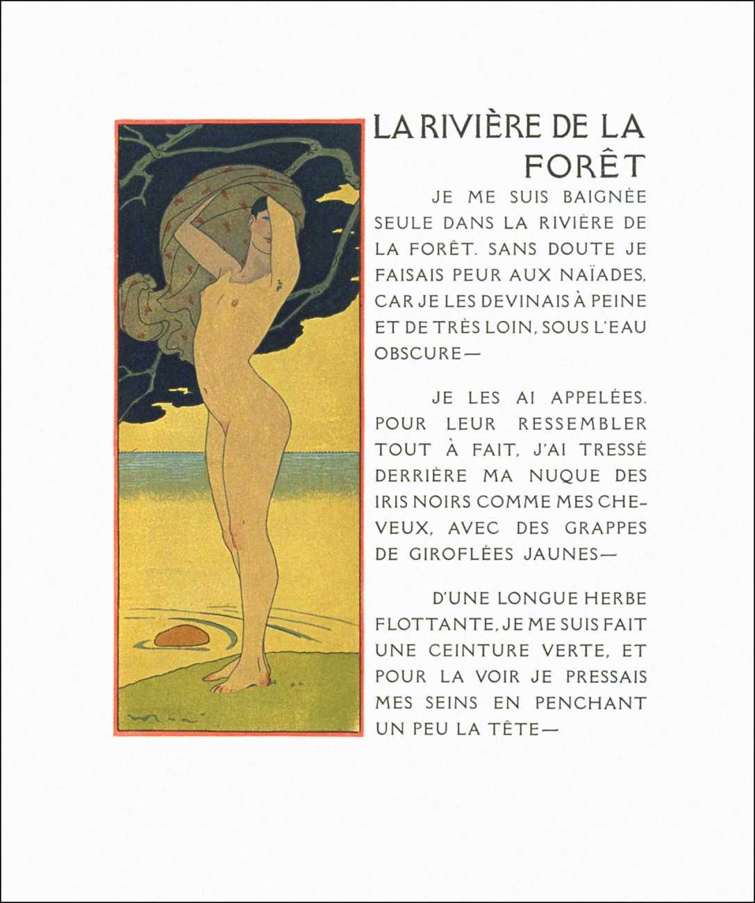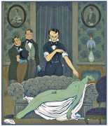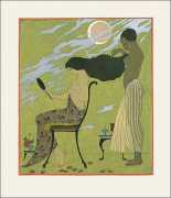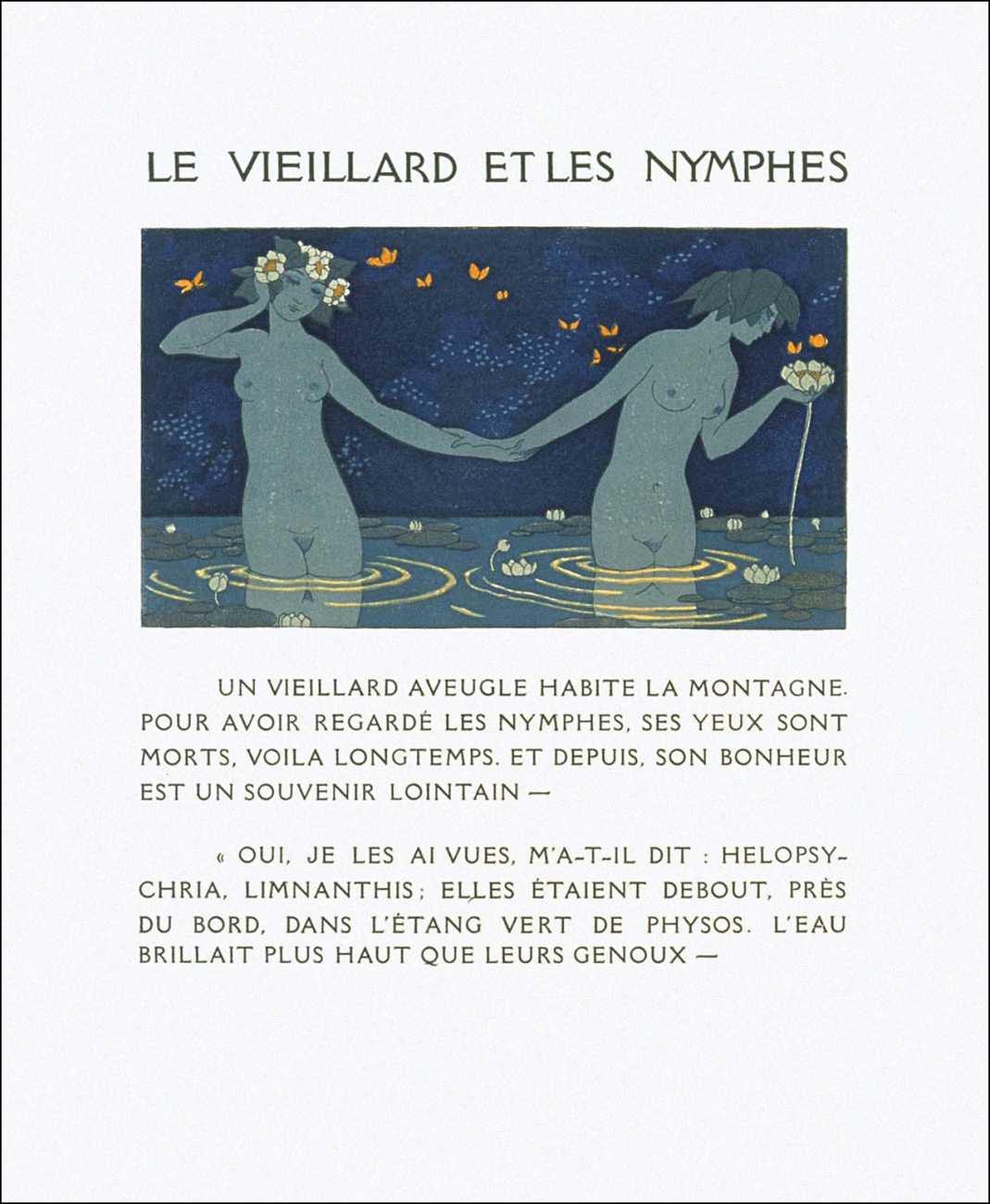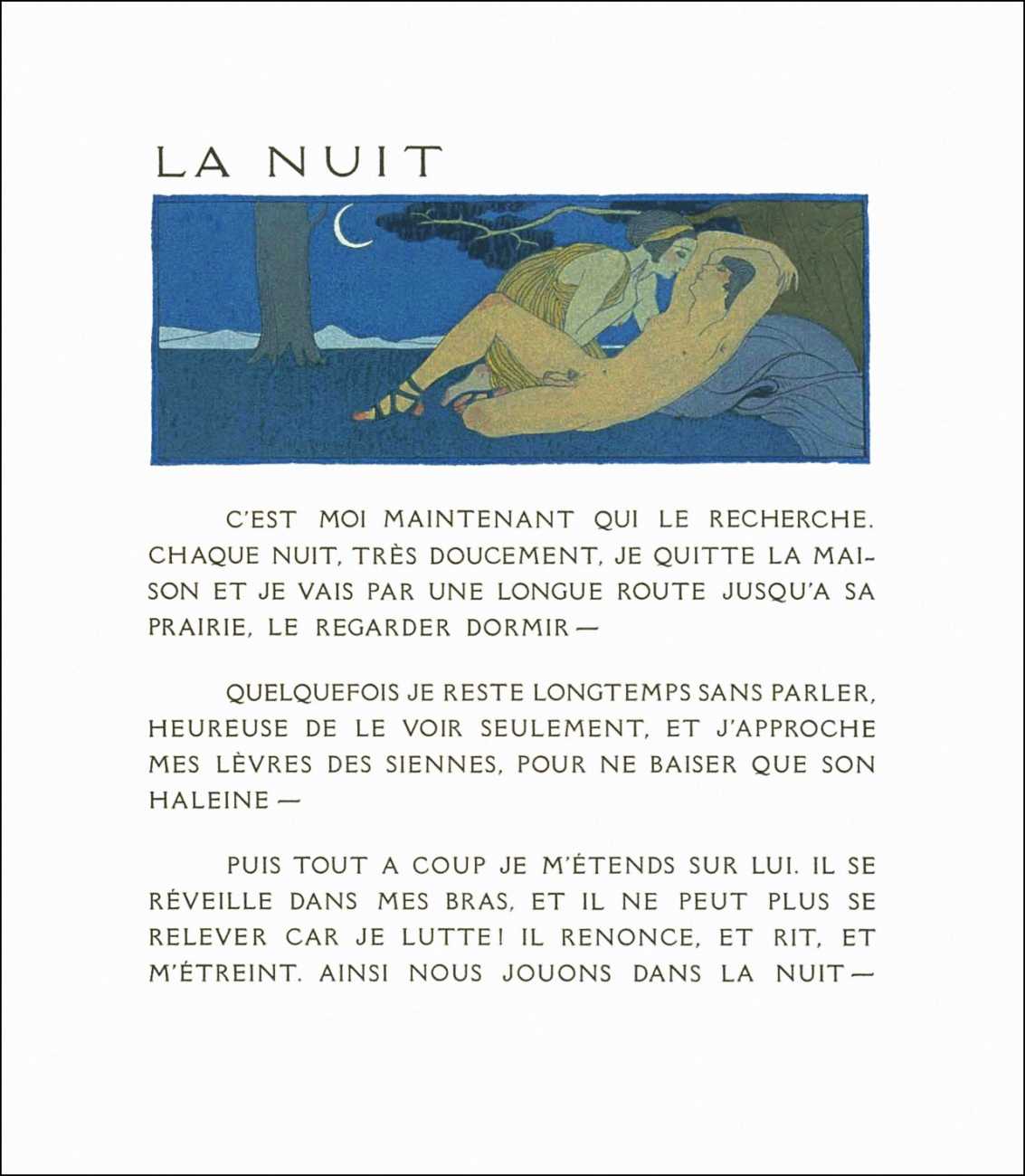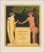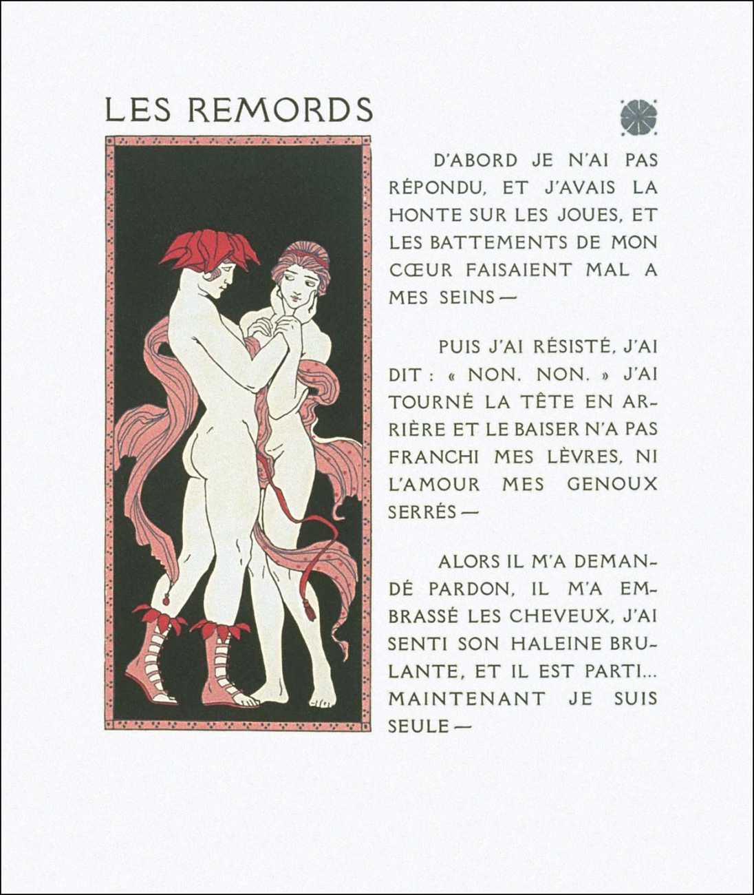 He was part of a group of talented French artists nicknamed by Vogue magazine ‘Les chevaliers du bracelet’ (Knights of the Bracelet) for their dandyish attire, flamboyant mannerisms, and their common practice of sporting a bracelet. Barbier was described by Vogue as ‘un élégant jeune homme blond, tranquille et réservé’. He was one of many artists of the period who made much of their living from illustrating limited ‘editions de luxe’ books, with high standards of printing and a small monied clientele. Classics and contemporary works illustrated by the leading artists of the day, often lavishly bound, were eagerly collected. Societies of bibliophiles were founded in many cities and towns, ensuring that subscribers could be sure of obtaining the latest publications, numerous enough to warrant a lengthy column in the magazine L’Amour de l’Art each month devoted entirely to the subject.