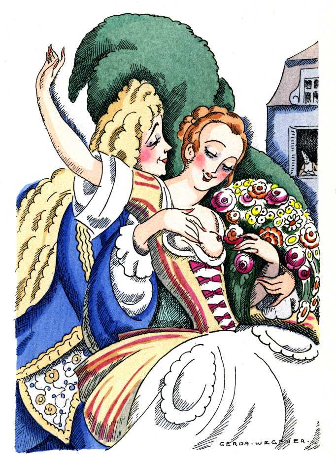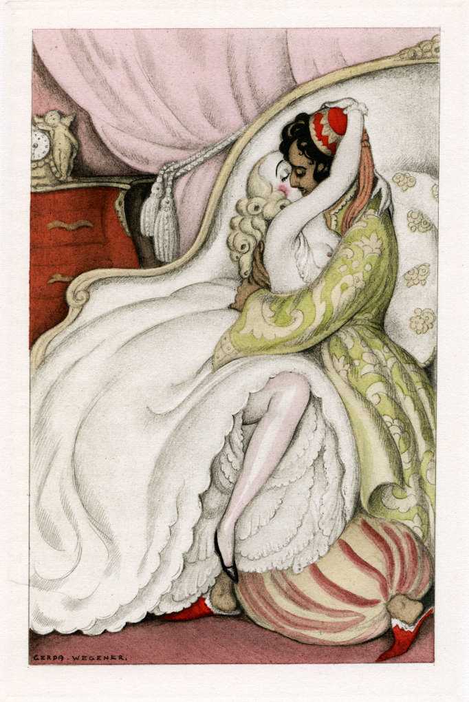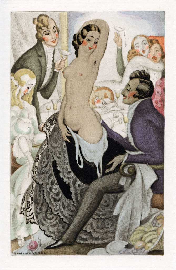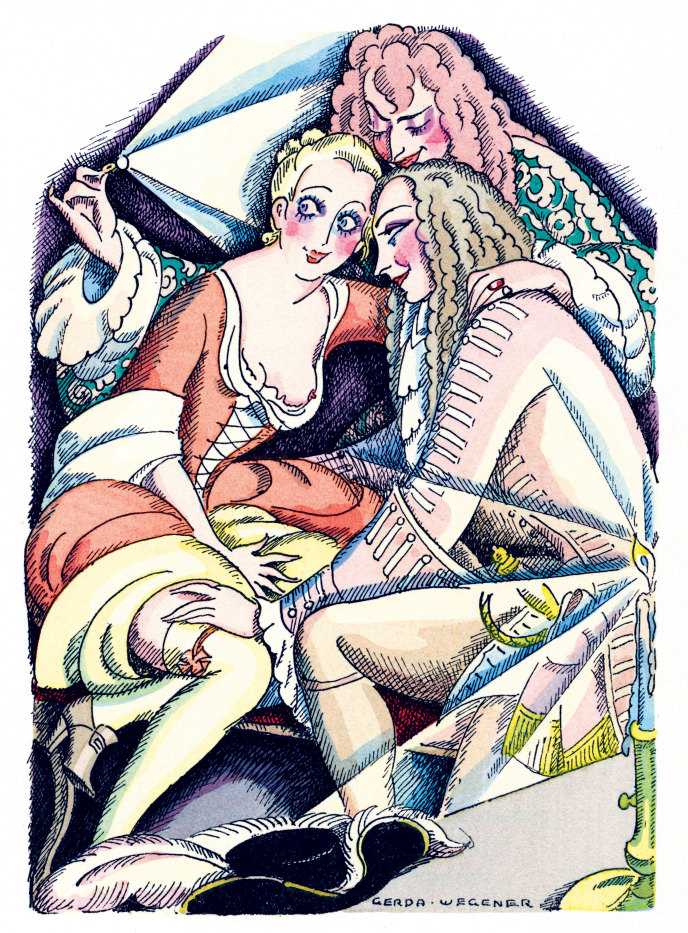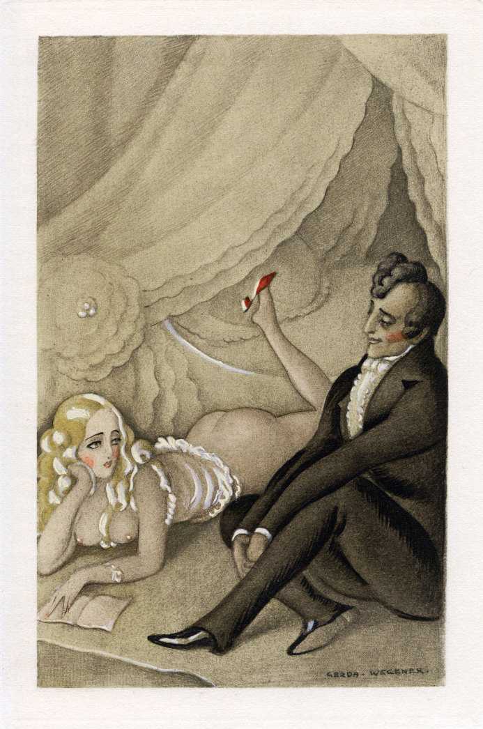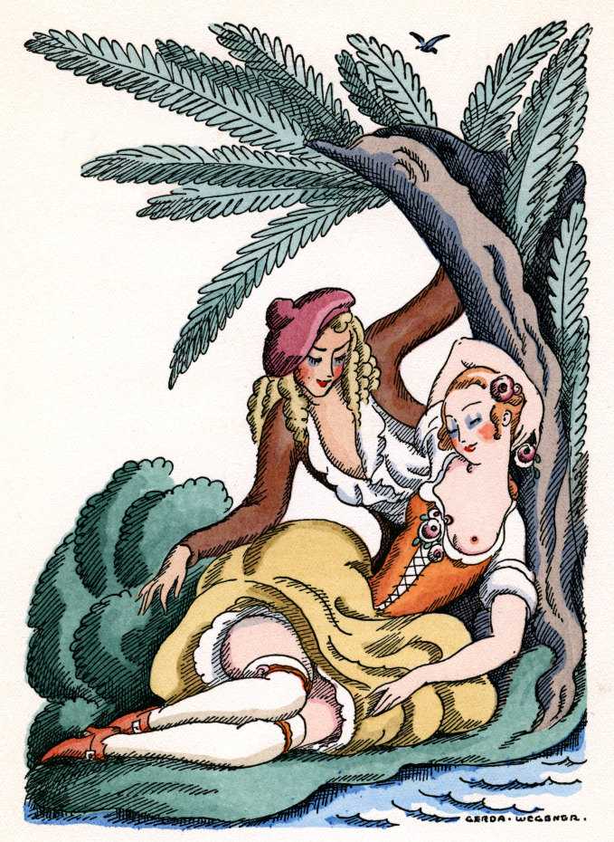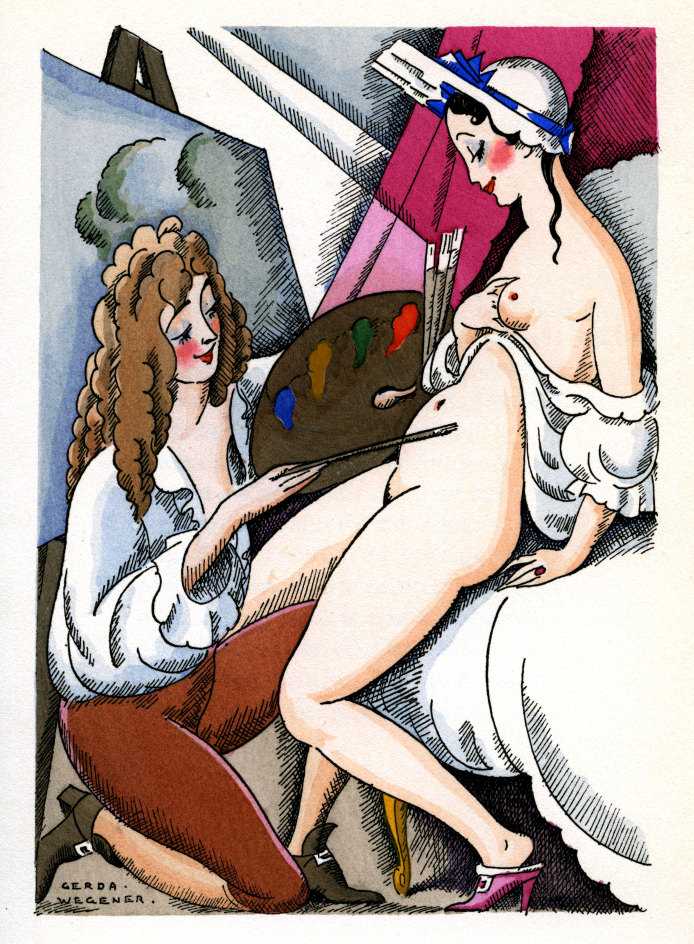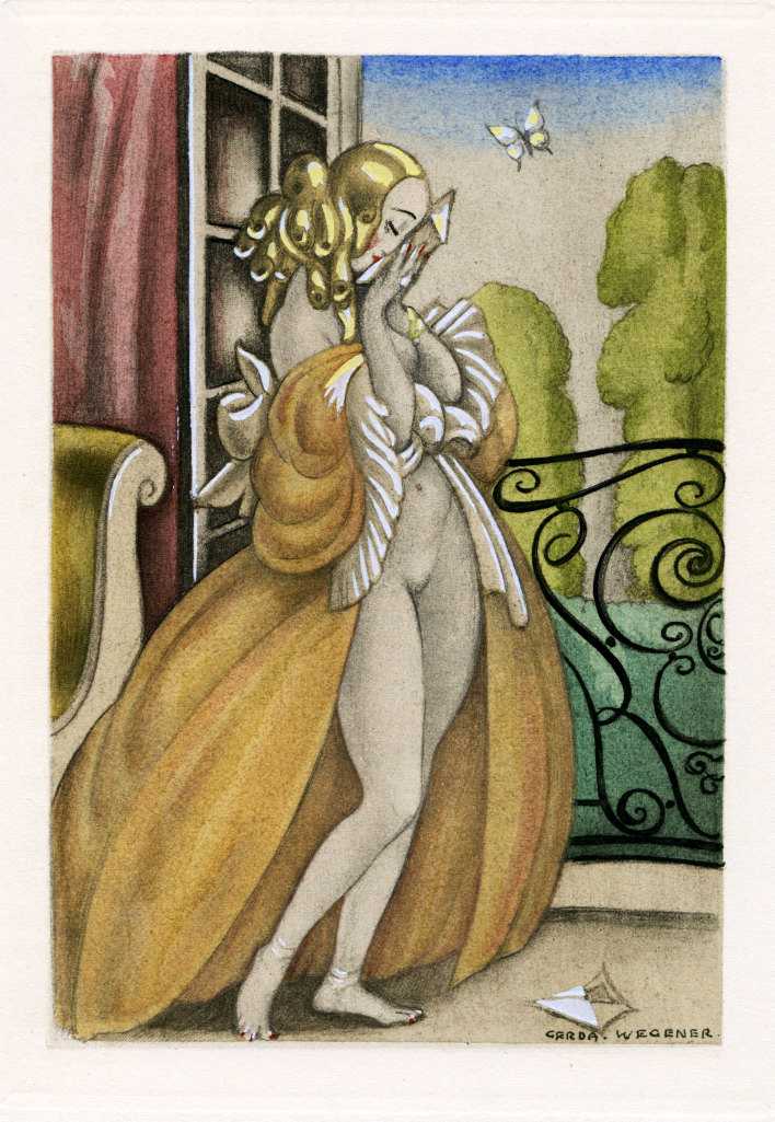To what extent Gerda Wegener’s art and her own sexuality were connected is a fascinating question. There is no doubt that sensual and sexual intimacy fascinated her, both same-sex and cross-gender, and the illustrations in Les délassements d’Eros hint strongly at personal lesbian experience. It has been suggested that Einar and Gerda both knew they were gay when they married and used their relationship as cover, but it is much more likely that they discovered they very much enjoyed exploring gender boundaries together, both with each other and within the libertine artistic setting of the Paris they came to call home. If there is a tragic aspect to their story, it is that they were born a century too early to be allowed to express themselves fully.
