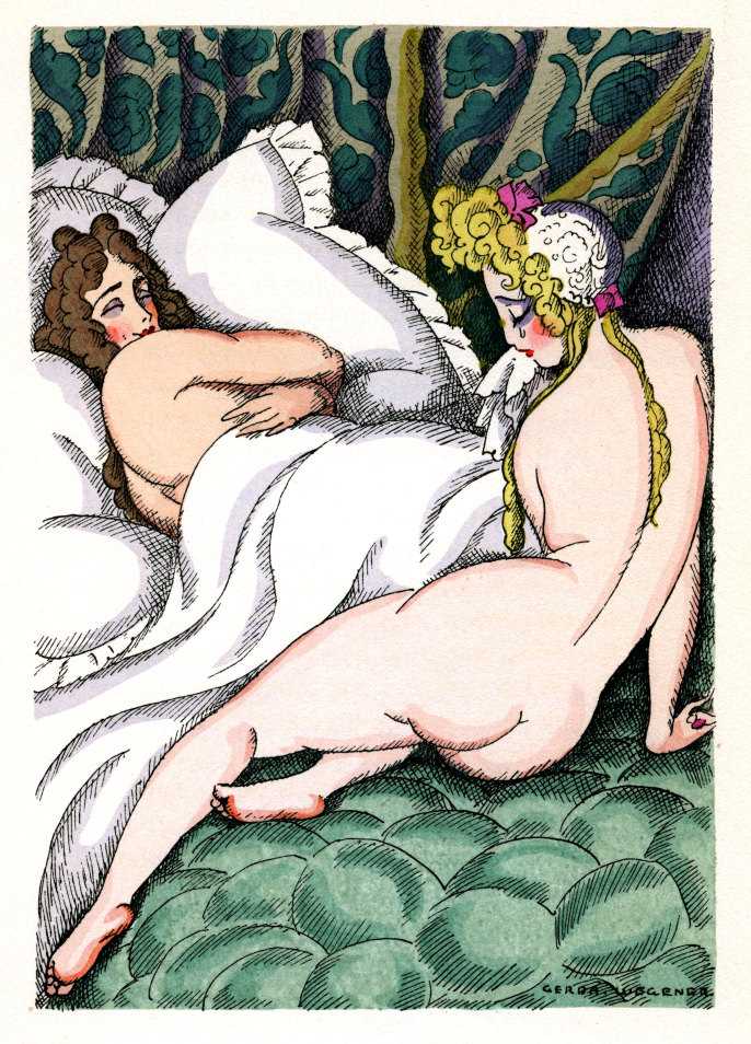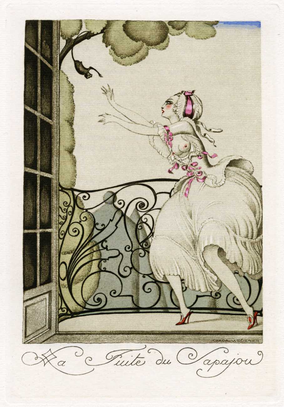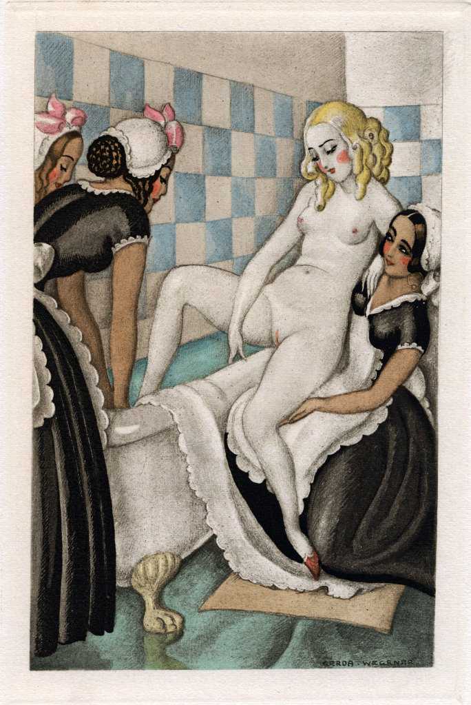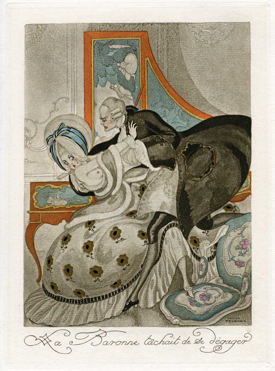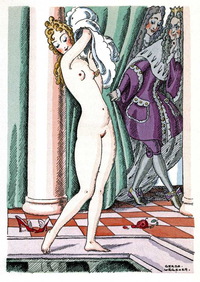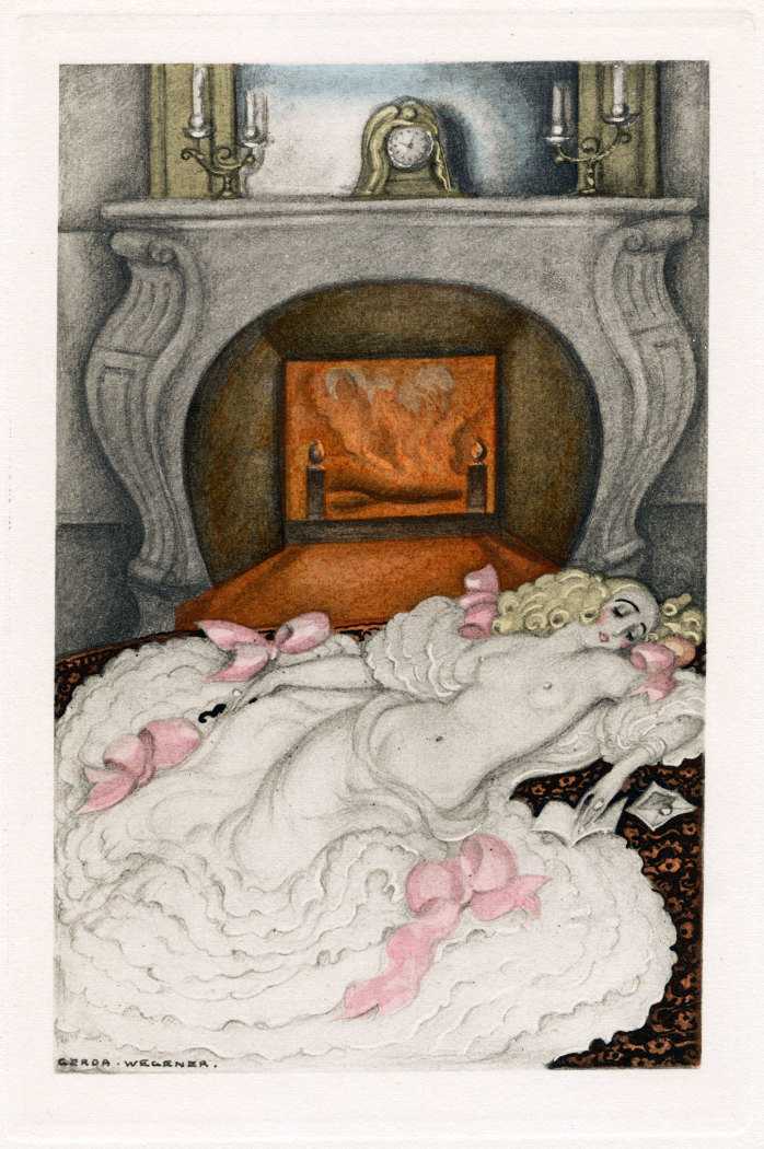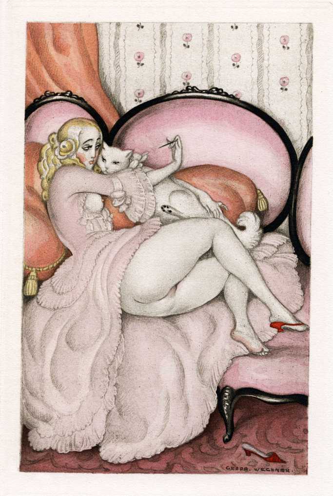 To what extent Gerda Wegener’s art and her own sexuality were connected is a fascinating question. There is no doubt that sensual and sexual intimacy fascinated her, both same-sex and cross-gender, and the illustrations in Les délassements d’Eros hint strongly at personal lesbian experience. It has been suggested that Einar and Gerda both knew they were gay when they married and used their relationship as cover, but it is much more likely that they discovered they very much enjoyed exploring gender boundaries together, both with each other and within the libertine artistic setting of the Paris they came to call home. If there is a tragic aspect to their story, it is that they were born a century too early to be allowed to express themselves fully.