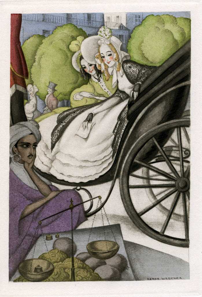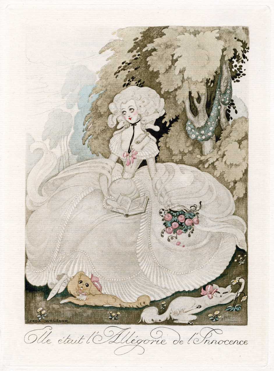By mid-1914 Gerda Wegener was firmly established in the Paris art scene, and the great Guillaume Apollinaire was singing her praises in Paris-Match, where he wrote ‘Mrs Wegener’s graceful and unprudish drawings have brought her great success and recognition as one of Paris’s own’. She continued to be highly regarded throughout the 1920s; the French state bought three of her paintings and she won two gold medals at the 1925 Exposition Internationale des Arts Décoratifs et Industriels Modernes for her book illustration and stained glass.