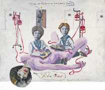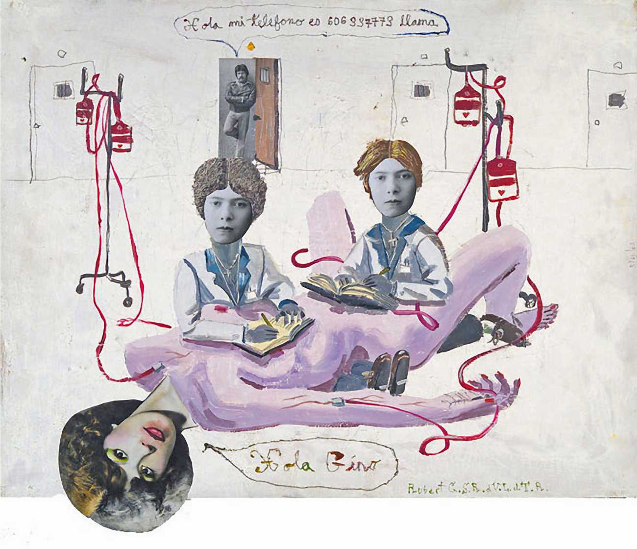 Since 1995 Gino Rubert, who grew up in Mexico City and now lives and works mostly in Barcelona, has incorporated collage into figurative painting in a highly personal style, part humorous, part spectral, especially in the grey, photographic faces of his characters, but also in other elements – clothes or interior décor, which combine the everyday and the bizarre, sometimes the psychedelic.