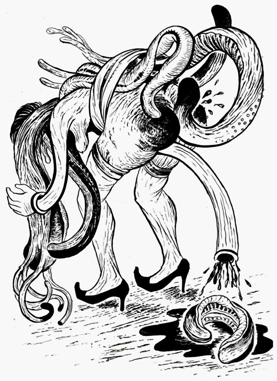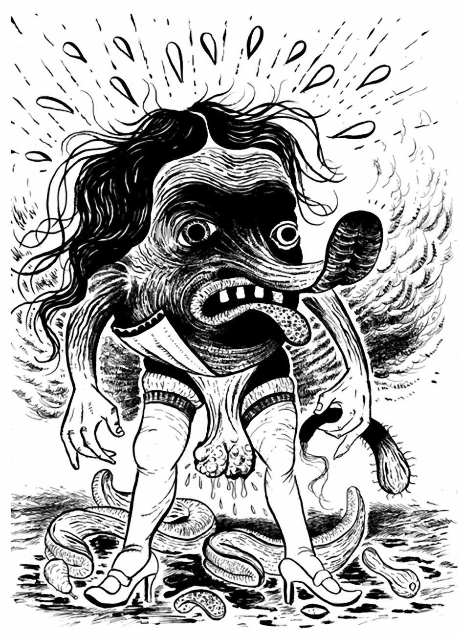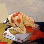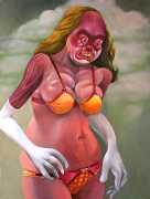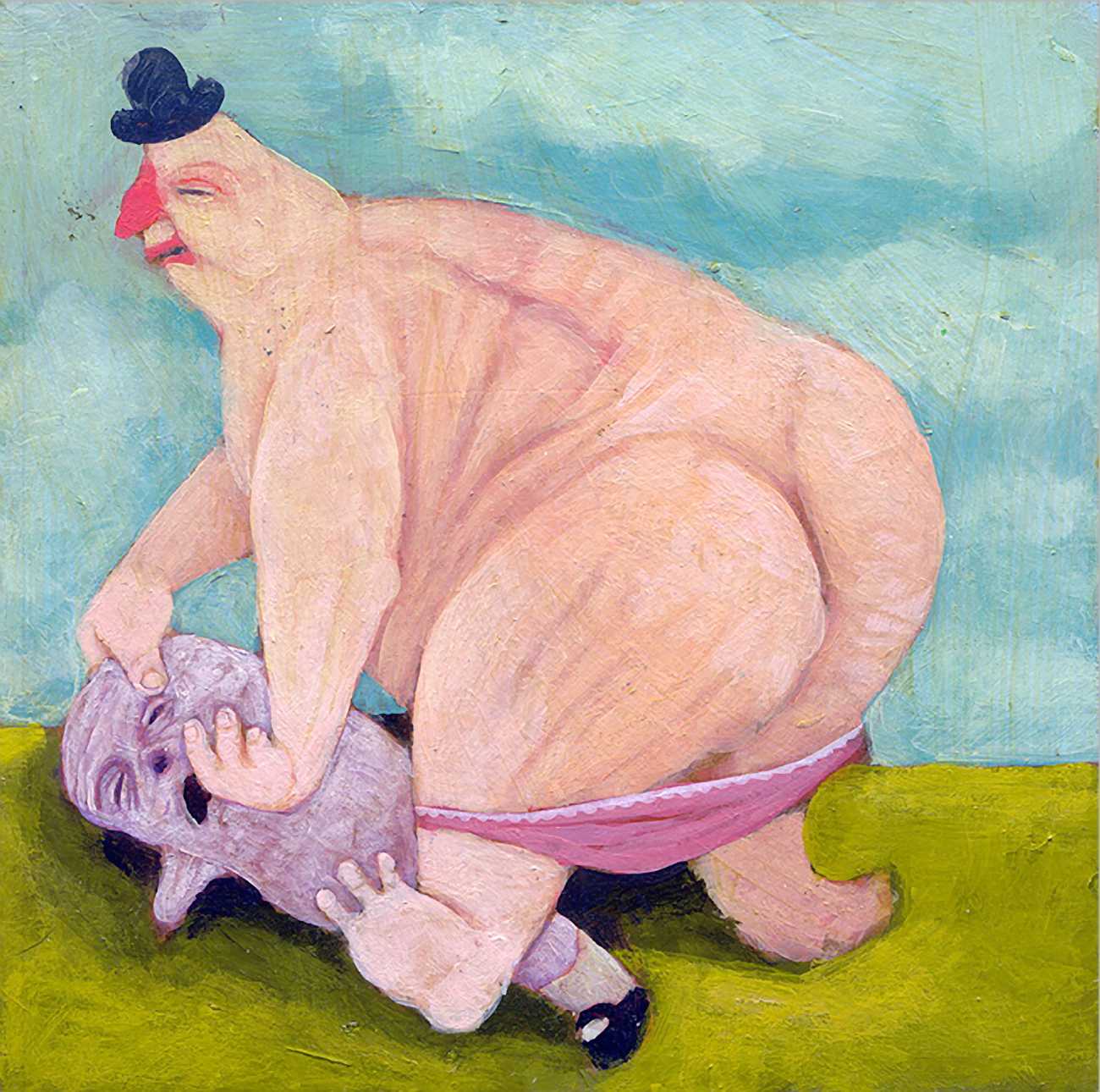 Sometimes a good way to understand an artist is through their own artist statement; here is Gregory Jacobsen’s from 2002: ‘Figures limp and hobble on and off the stage. Boils, pustules, bashed-in noses, big beefy hairy bodies flap. Visceral meat clumps, steaks sitting slightly soiled, deeply split, sprouting tiny hairs. The curtain rises to reveal palpitating gristle groaning a song of lost love. It performs a burlesque dance, gyrating hips, stumbling on high heels, finally flipping itself into a garbage can. A great big thick neck small head sweaty muscle man with a threatening posture exclaims to the audience, “Congratulations on fulfilling your useless existence! Please leave immediately or I will knock upon your heads with my immensely bloated meaty fists!”’