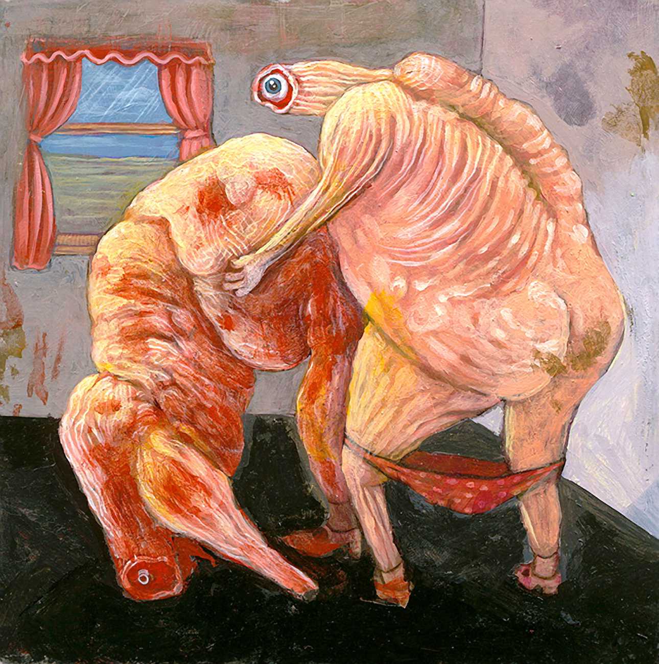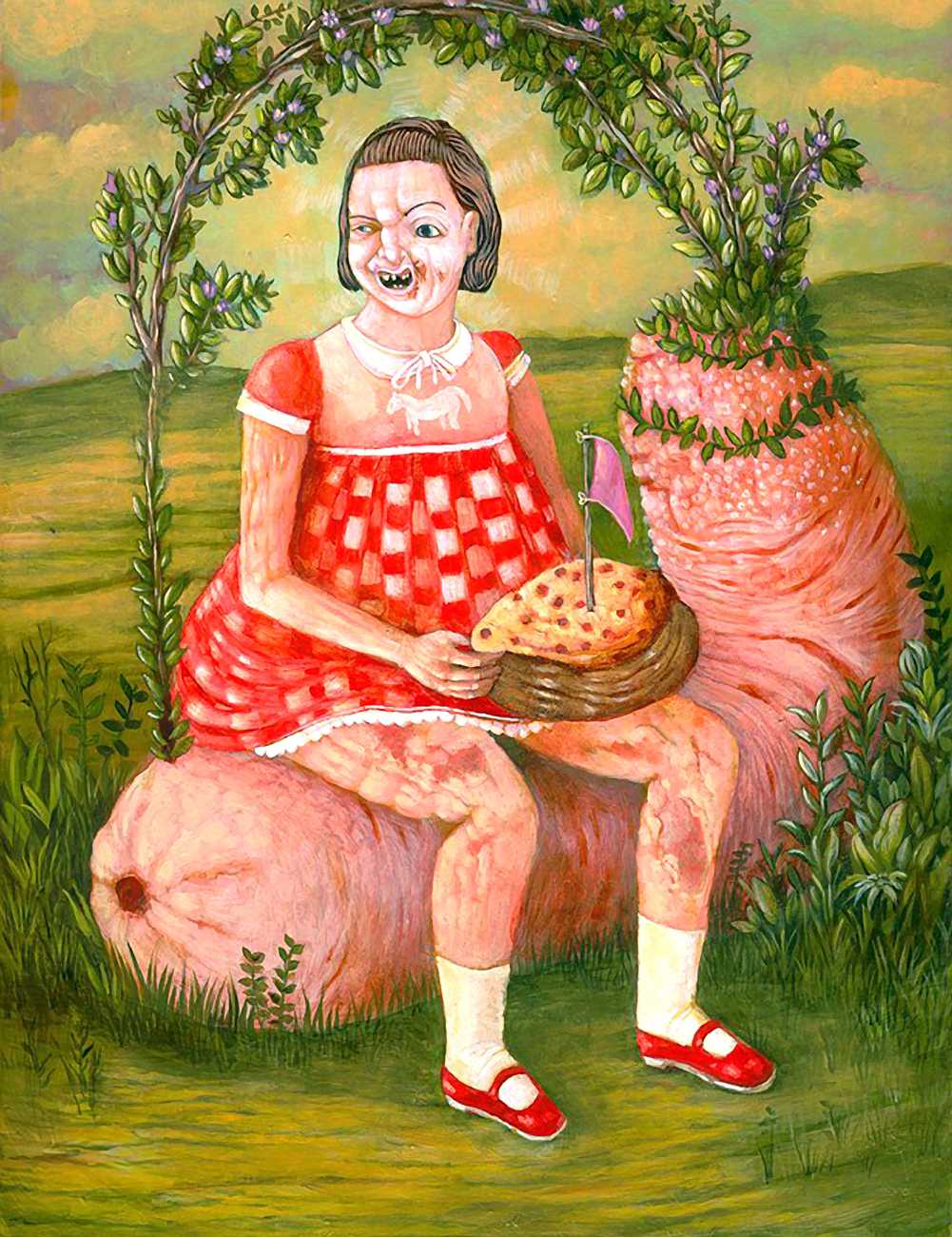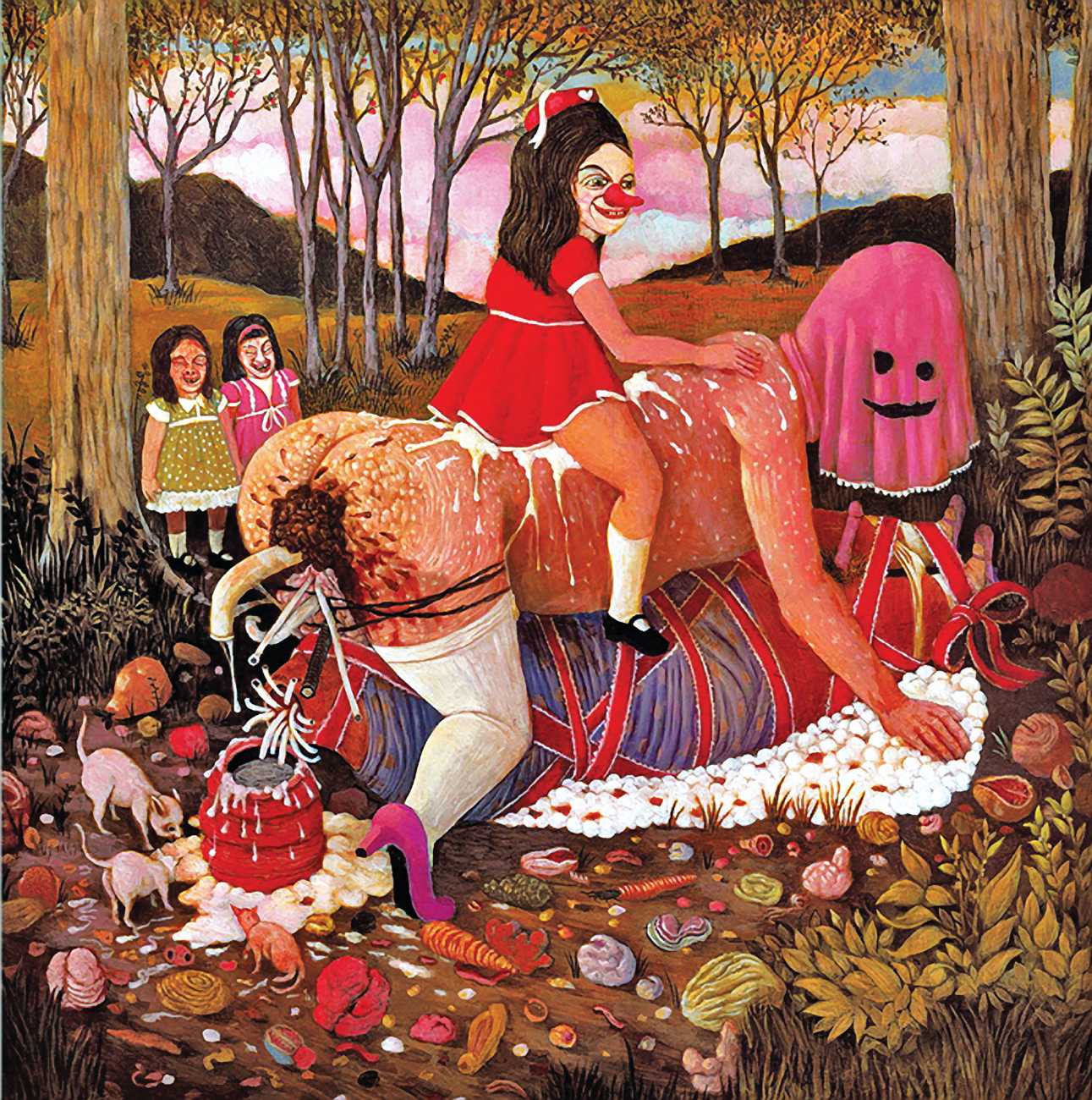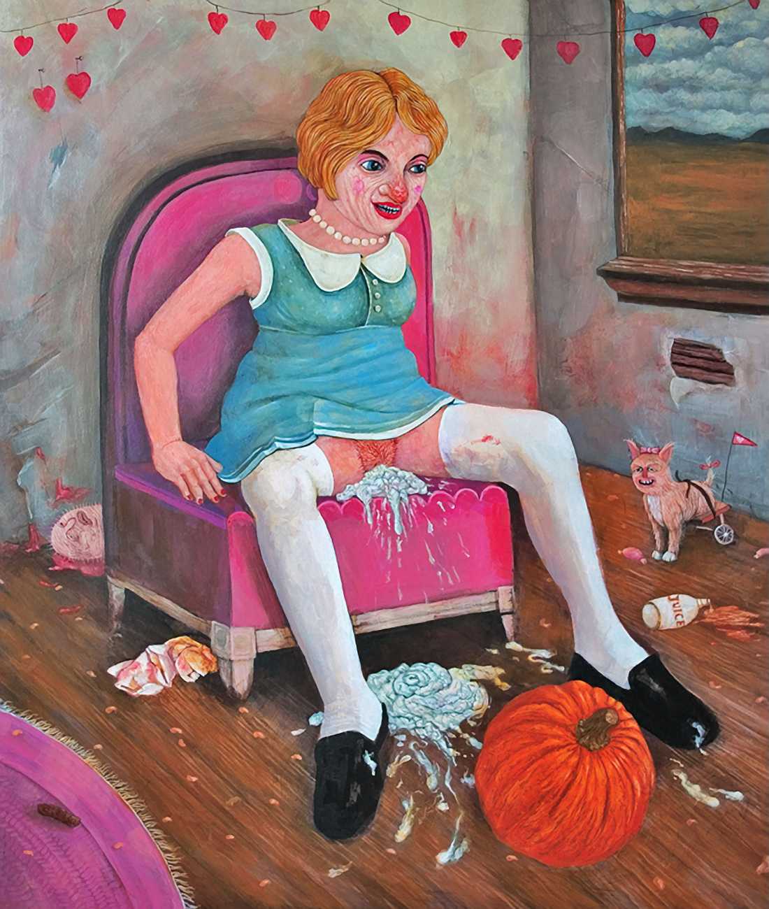 As well as painting, Jacobsen is very involved in performance art, including stage shows and song-writing. Like in his painting, where figures wear little-girl dresses and little-boy underwear, shows includes much exploration of gender and the oddness of sexual behaviour. He is part of a Chicago-based performance group called Lovely Little Girls, and often performs in dresses. But this isn’t about being ‘feminine’ or submissive; as he explains, ‘I want to explode all that male versus female, aggressive/submissive shit. I once had this nitwit assume that I would be a submissive partner because I was a boy wearing a dress, even though the performance was very angular, off-putting, and aggressive. People cling to these old values and stereotypes. I’ve always related most to androgyny, and I really like strong sexuality in people, but I also don’t like the extreme postures of being macho or ladylike. Both have always irritated the hell out of me; they’ve always seemed to be a pose so that people can more easily fuck each other.’