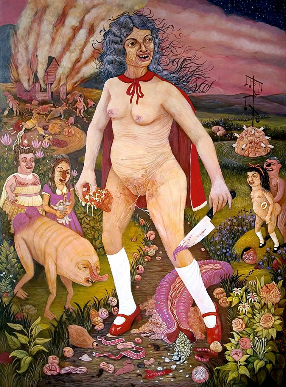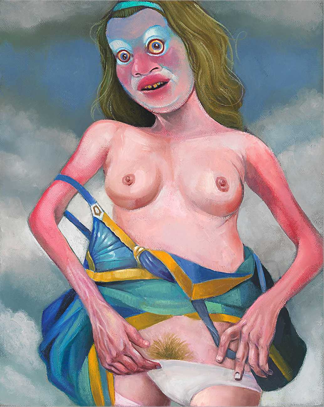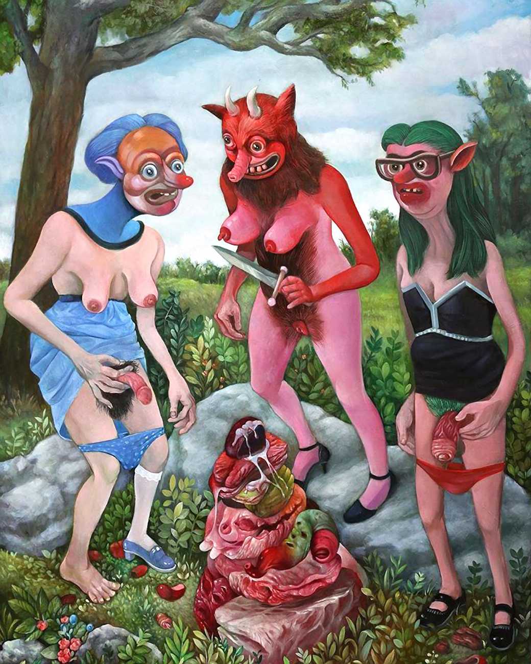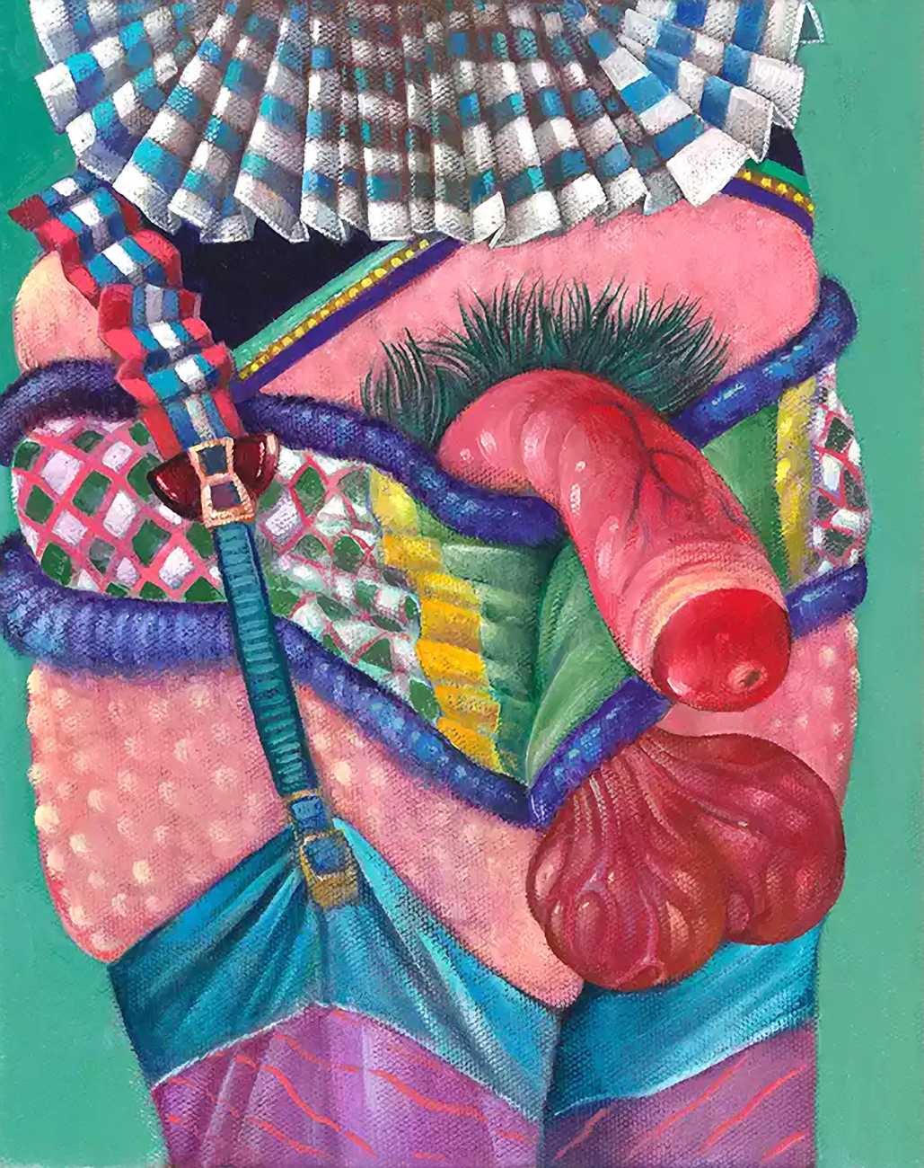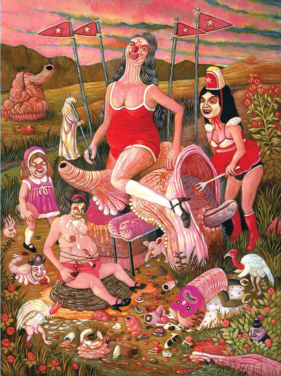 As well as painting, Jacobsen is very involved in performance art, including stage shows and song-writing. Like in his painting, where figures wear little-girl dresses and little-boy underwear, shows includes much exploration of gender and the oddness of sexual behaviour. He is part of a Chicago-based performance group called Lovely Little Girls, and often performs in dresses. But this isn’t about being ‘feminine’ or submissive; as he explains, ‘I want to explode all that male versus female, aggressive/submissive shit. I once had this nitwit assume that I would be a submissive partner because I was a boy wearing a dress, even though the performance was very angular, off-putting, and aggressive. People cling to these old values and stereotypes. I’ve always related most to androgyny, and I really like strong sexuality in people, but I also don’t like the extreme postures of being macho or ladylike. Both have always irritated the hell out of me; they’ve always seemed to be a pose so that people can more easily fuck each other.’