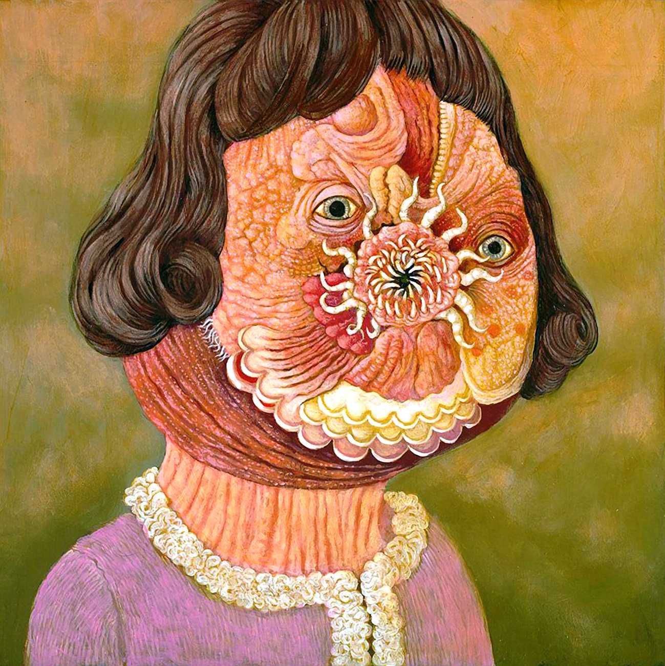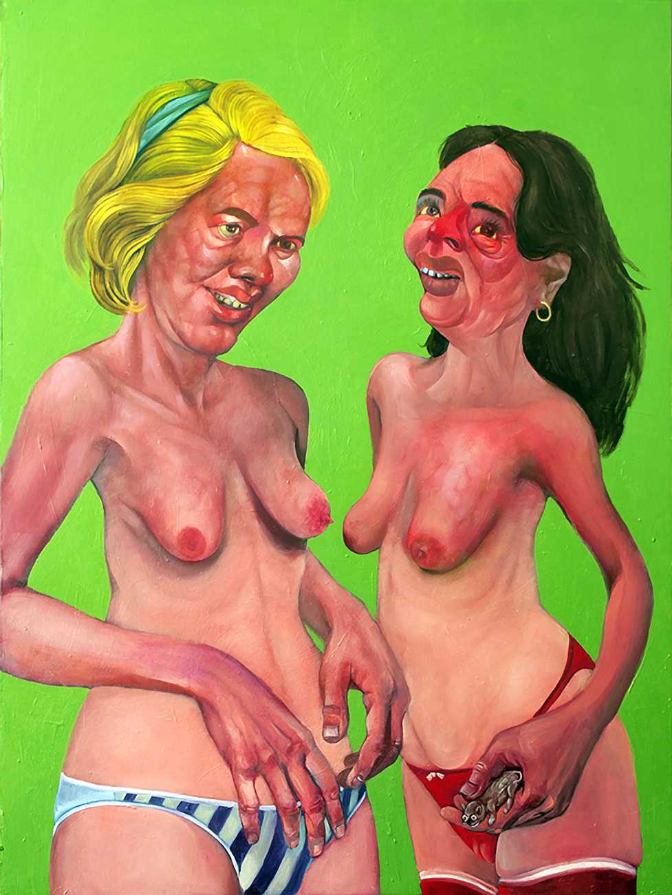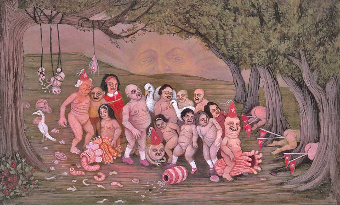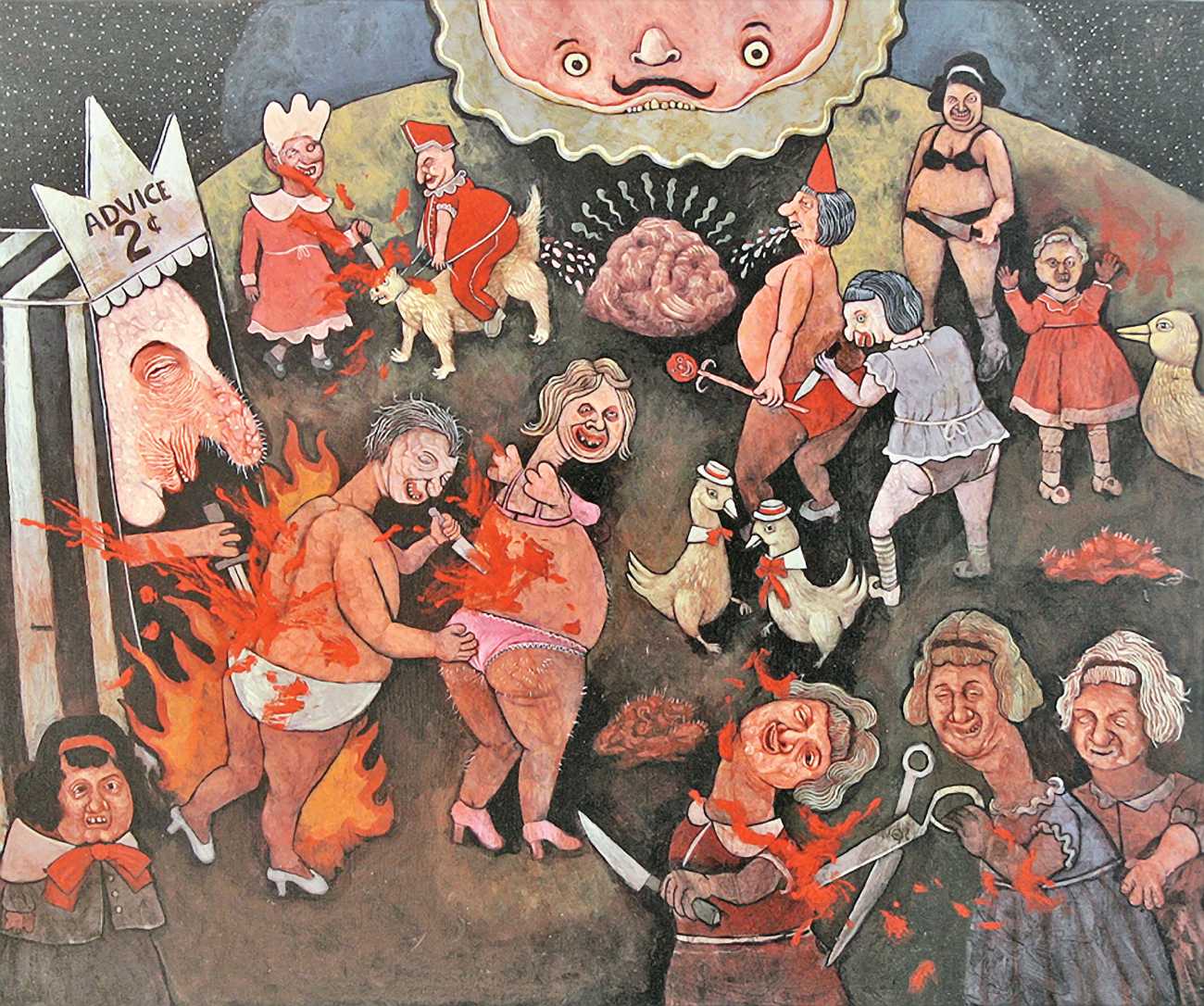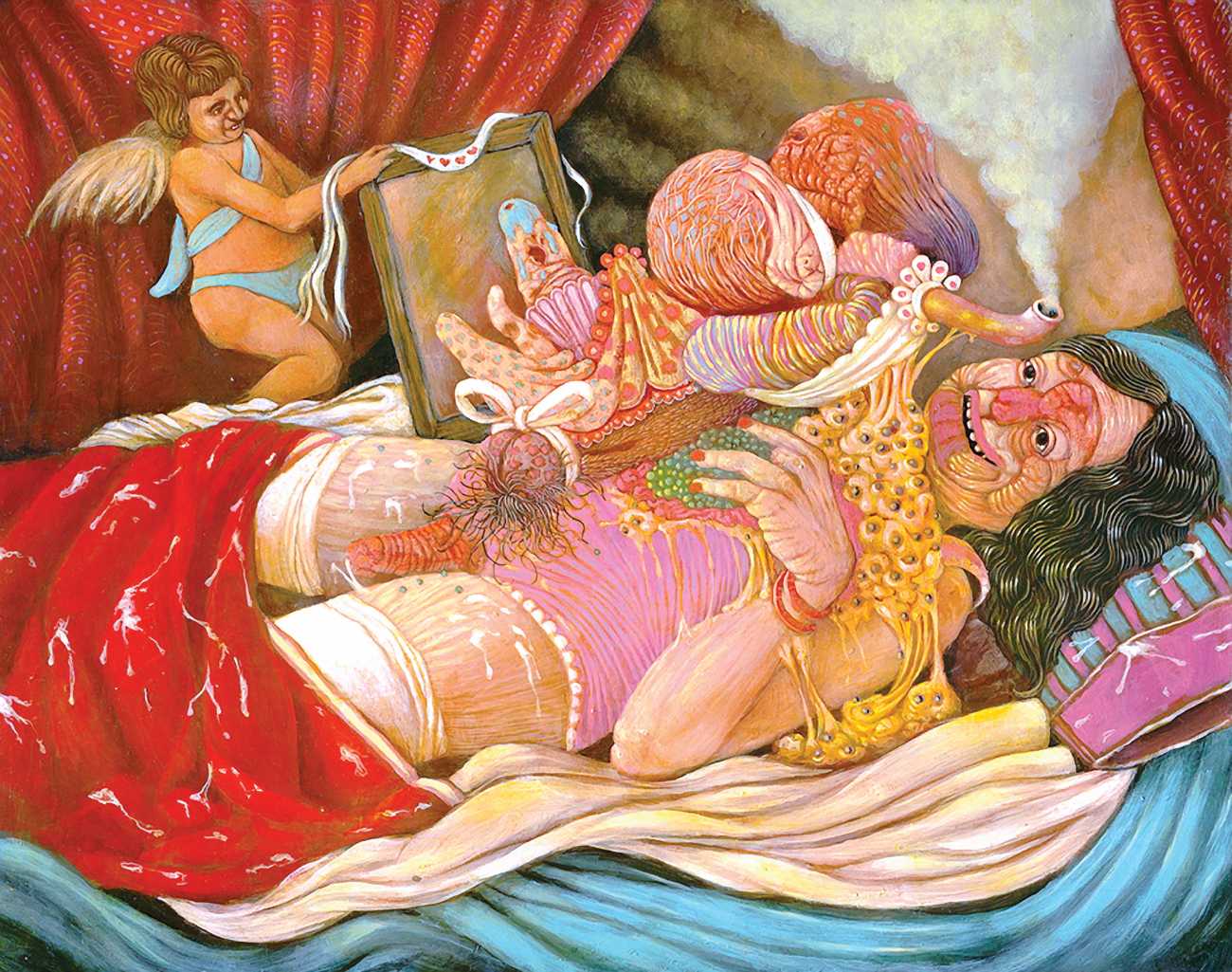 As well as painting, Jacobsen is very involved in performance art, including stage shows and song-writing. Like in his painting, where figures wear little-girl dresses and little-boy underwear, shows includes much exploration of gender and the oddness of sexual behaviour. He is part of a Chicago-based performance group called Lovely Little Girls, and often performs in dresses. But this isn’t about being ‘feminine’ or submissive; as he explains, ‘I want to explode all that male versus female, aggressive/submissive shit. I once had this nitwit assume that I would be a submissive partner because I was a boy wearing a dress, even though the performance was very angular, off-putting, and aggressive. People cling to these old values and stereotypes. I’ve always related most to androgyny, and I really like strong sexuality in people, but I also don’t like the extreme postures of being macho or ladylike. Both have always irritated the hell out of me; they’ve always seemed to be a pose so that people can more easily fuck each other.’