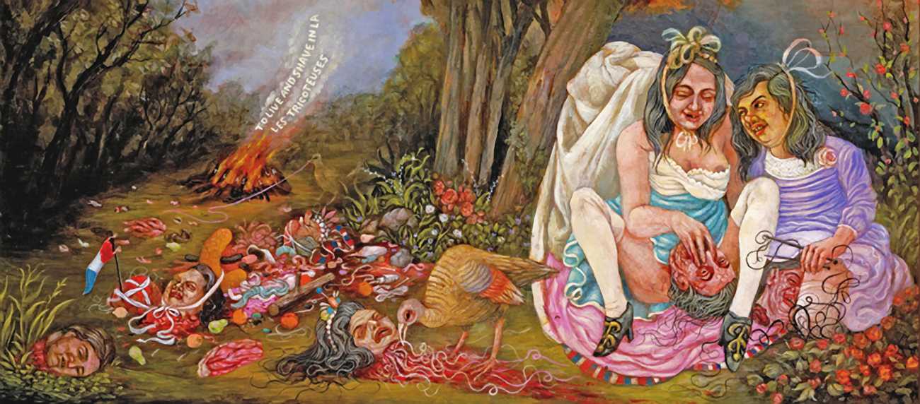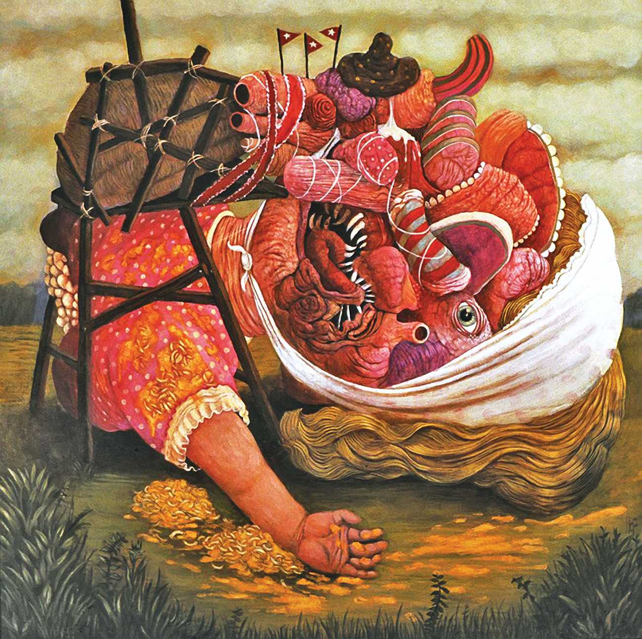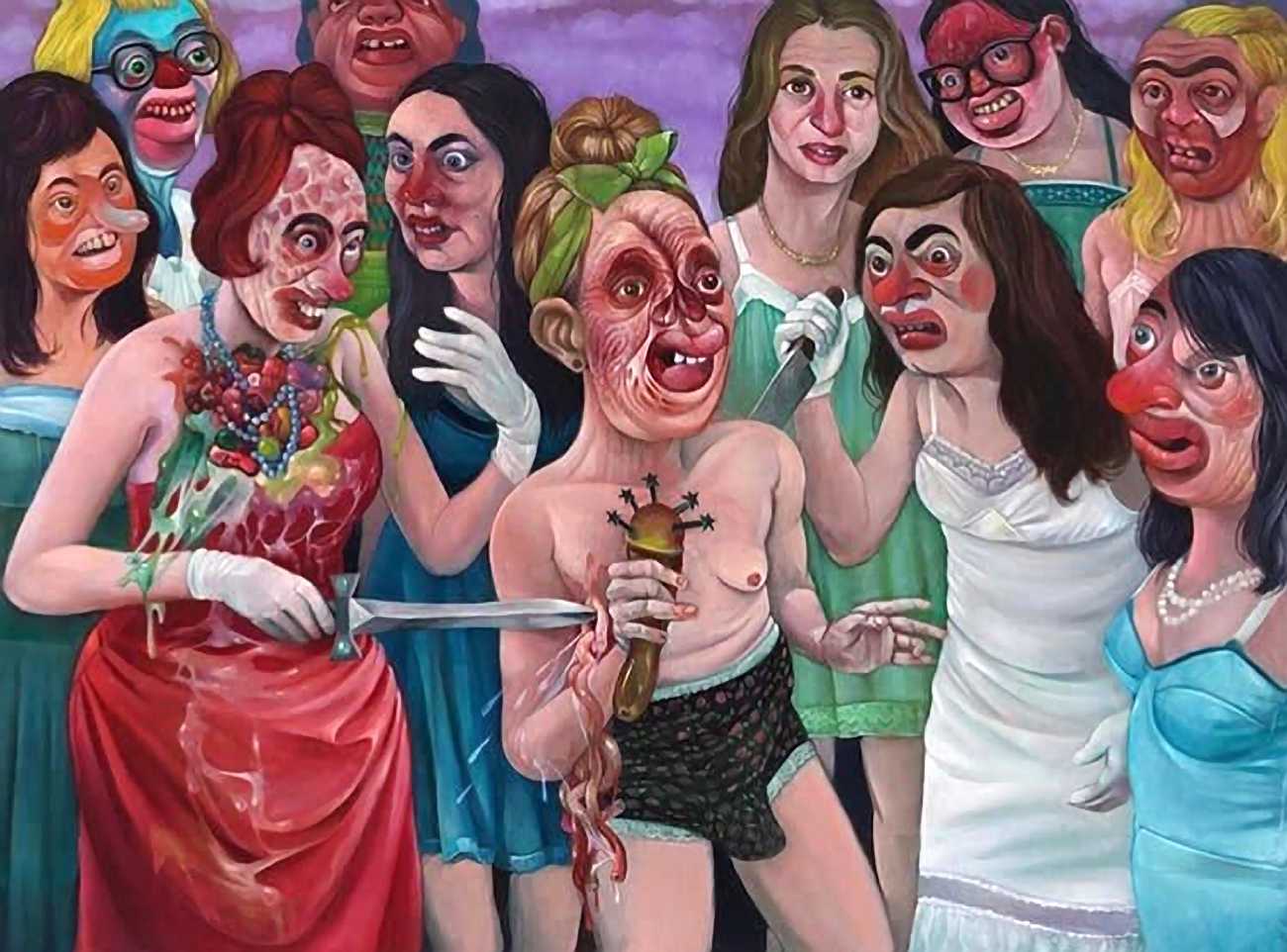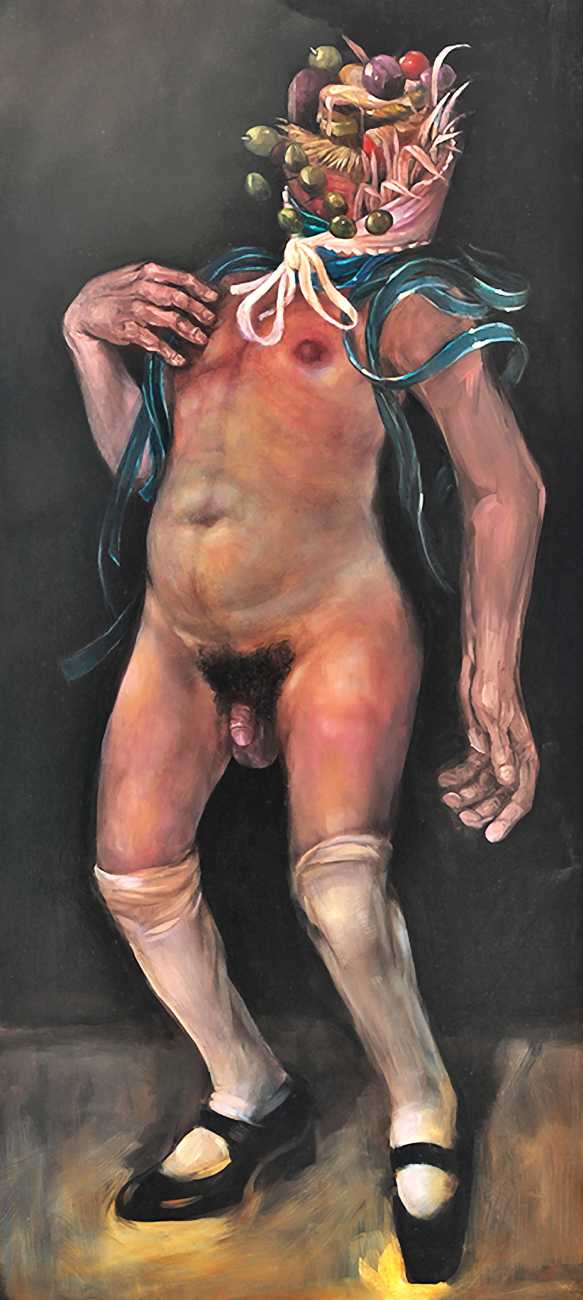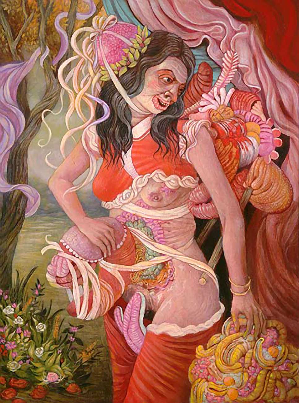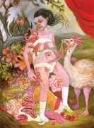 As well as painting, Jacobsen is very involved in performance art, including stage shows and song-writing. Like in his painting, where figures wear little-girl dresses and little-boy underwear, shows includes much exploration of gender and the oddness of sexual behaviour. He is part of a Chicago-based performance group called Lovely Little Girls, and often performs in dresses. But this isn’t about being ‘feminine’ or submissive; as he explains, ‘I want to explode all that male versus female, aggressive/submissive shit. I once had this nitwit assume that I would be a submissive partner because I was a boy wearing a dress, even though the performance was very angular, off-putting, and aggressive. People cling to these old values and stereotypes. I’ve always related most to androgyny, and I really like strong sexuality in people, but I also don’t like the extreme postures of being macho or ladylike. Both have always irritated the hell out of me; they’ve always seemed to be a pose so that people can more easily fuck each other.’