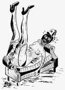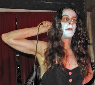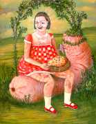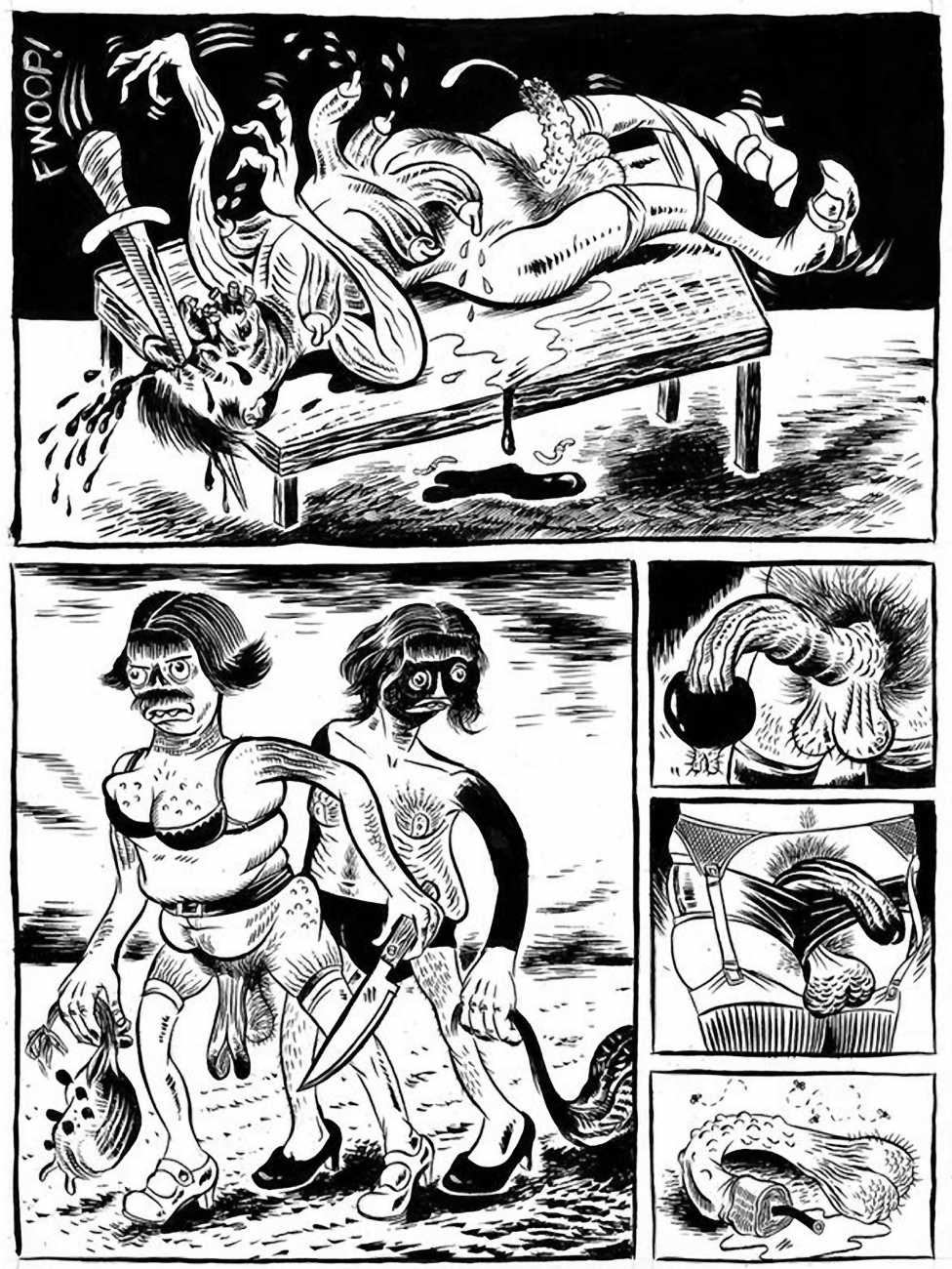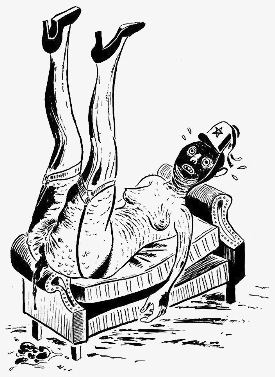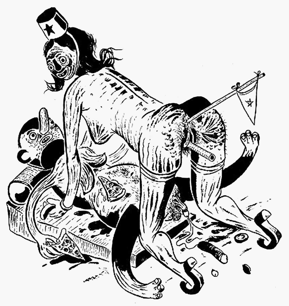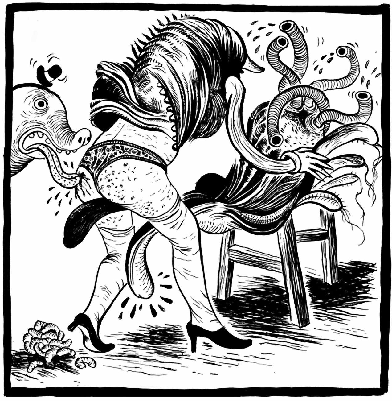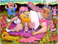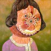 As well as painting, Jacobsen is very involved in performance art, including stage shows and song-writing. Like in his painting, where figures wear little-girl dresses and little-boy underwear, shows includes much exploration of gender and the oddness of sexual behaviour. He is part of a Chicago-based performance group called Lovely Little Girls, and often performs in dresses. But this isn’t about being ‘feminine’ or submissive; as he explains, ‘I want to explode all that male versus female, aggressive/submissive shit. I once had this nitwit assume that I would be a submissive partner because I was a boy wearing a dress, even though the performance was very angular, off-putting, and aggressive. People cling to these old values and stereotypes. I’ve always related most to androgyny, and I really like strong sexuality in people, but I also don’t like the extreme postures of being macho or ladylike. Both have always irritated the hell out of me; they’ve always seemed to be a pose so that people can more easily fuck each other.’