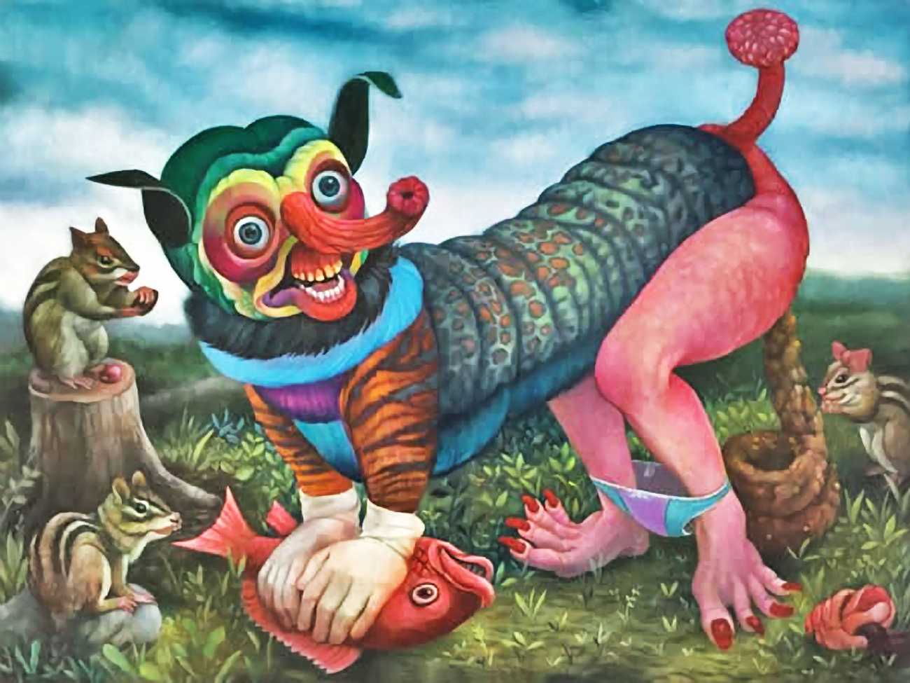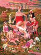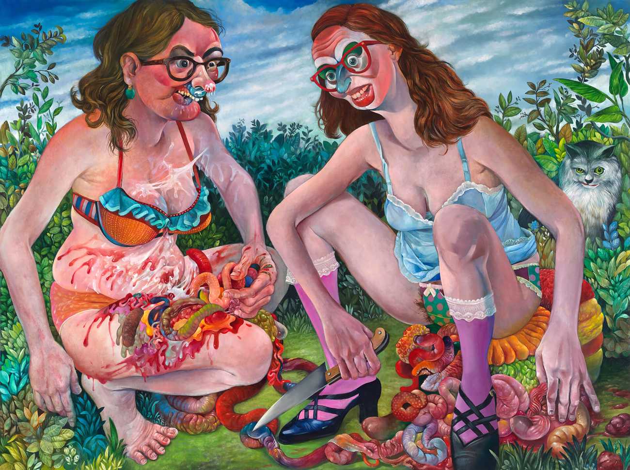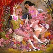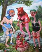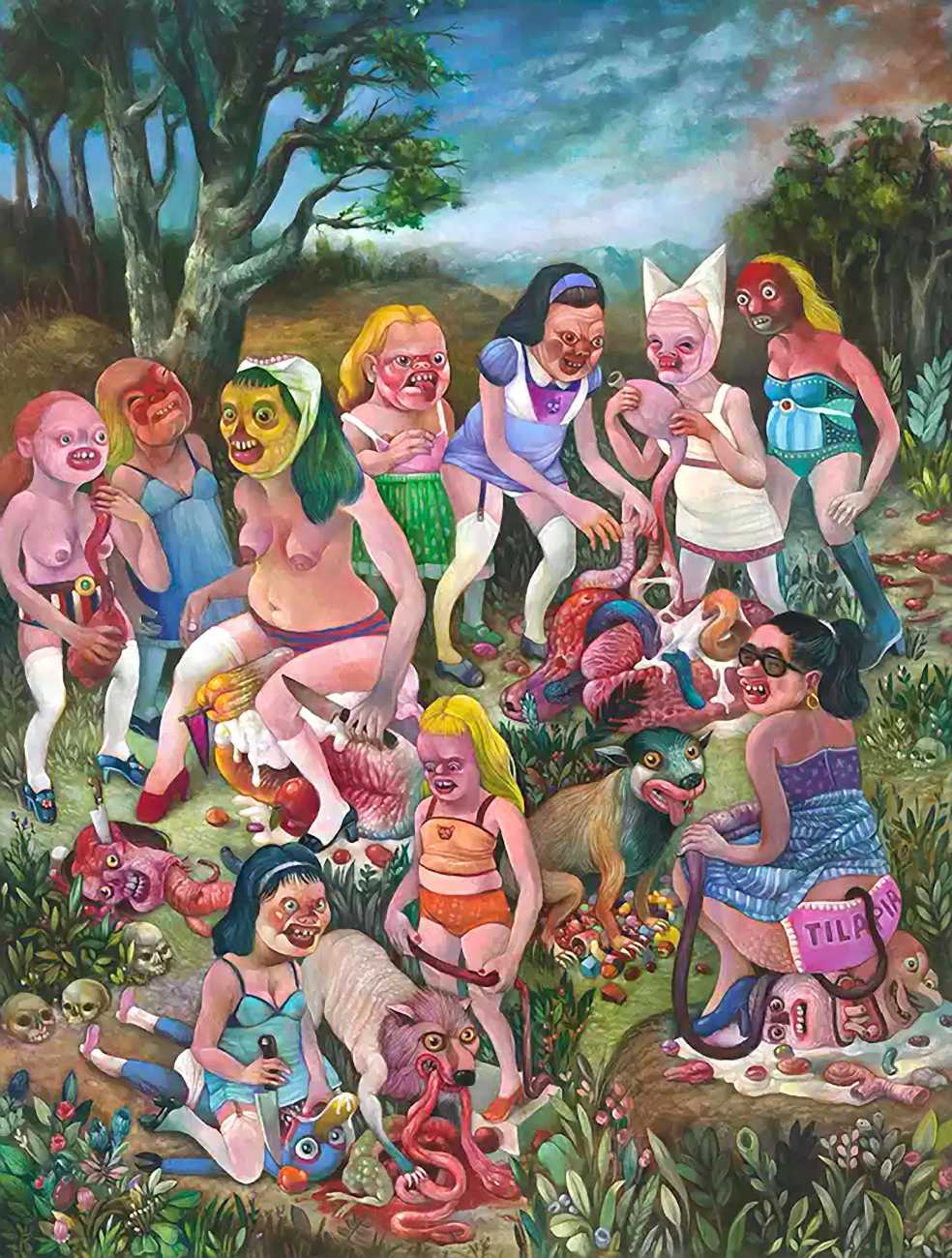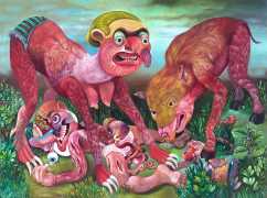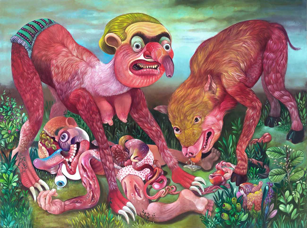 Many of Jacobsen’s paintings blend the boundaries between the human and the non-human – a strange middle ground emerges, where his lush backgrounds are populated by uncanny, hybrid beings possessed of vaguely human features, yet posturing themselves like animals, their clawed and furry appendages replacing their arms and legs. When they are joined by non-human entities, the members of Jacobsen’s troupe act not as predators or prey, but rather as enthusiastic participants within the brutal revelries, allowing themselves to be disembowelled and cannibalised. Jacobsen explains, ‘All the characters are me in a certain way. I am painting what I wish I was, but also what I obsess over in myself – bad and good, disgusting and sensual.’ Jacobsen’s work also contains elements of magical realism. ‘A lot of my early work was based on an Alice in Wonderland aesthetic,’ he says, ‘It's still there in my construction of an alternate reality, my own personal world that I would like to exist in.’