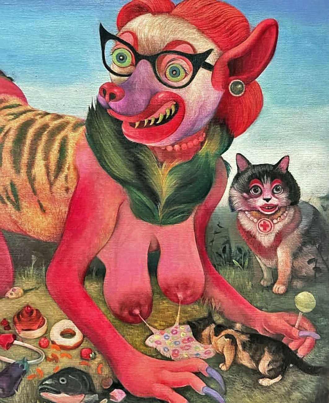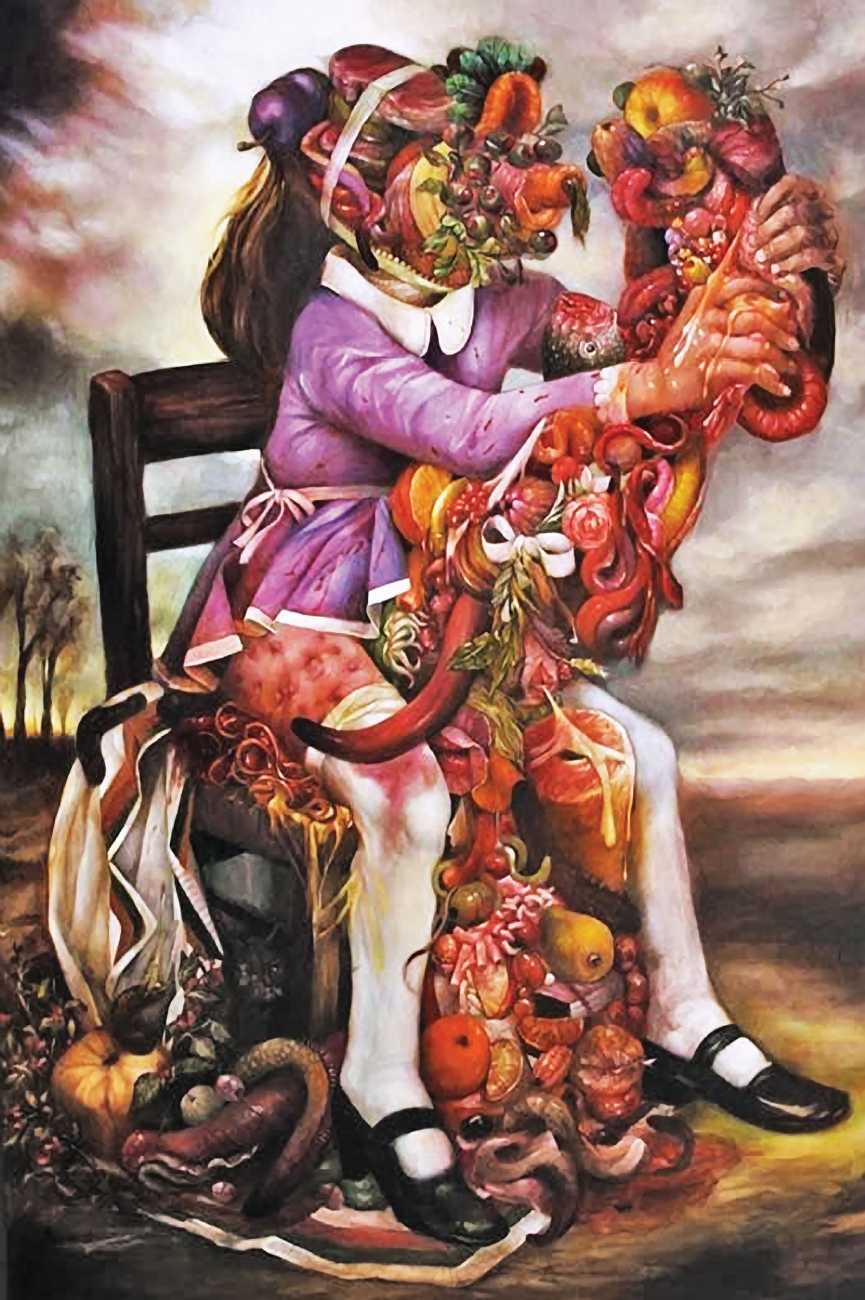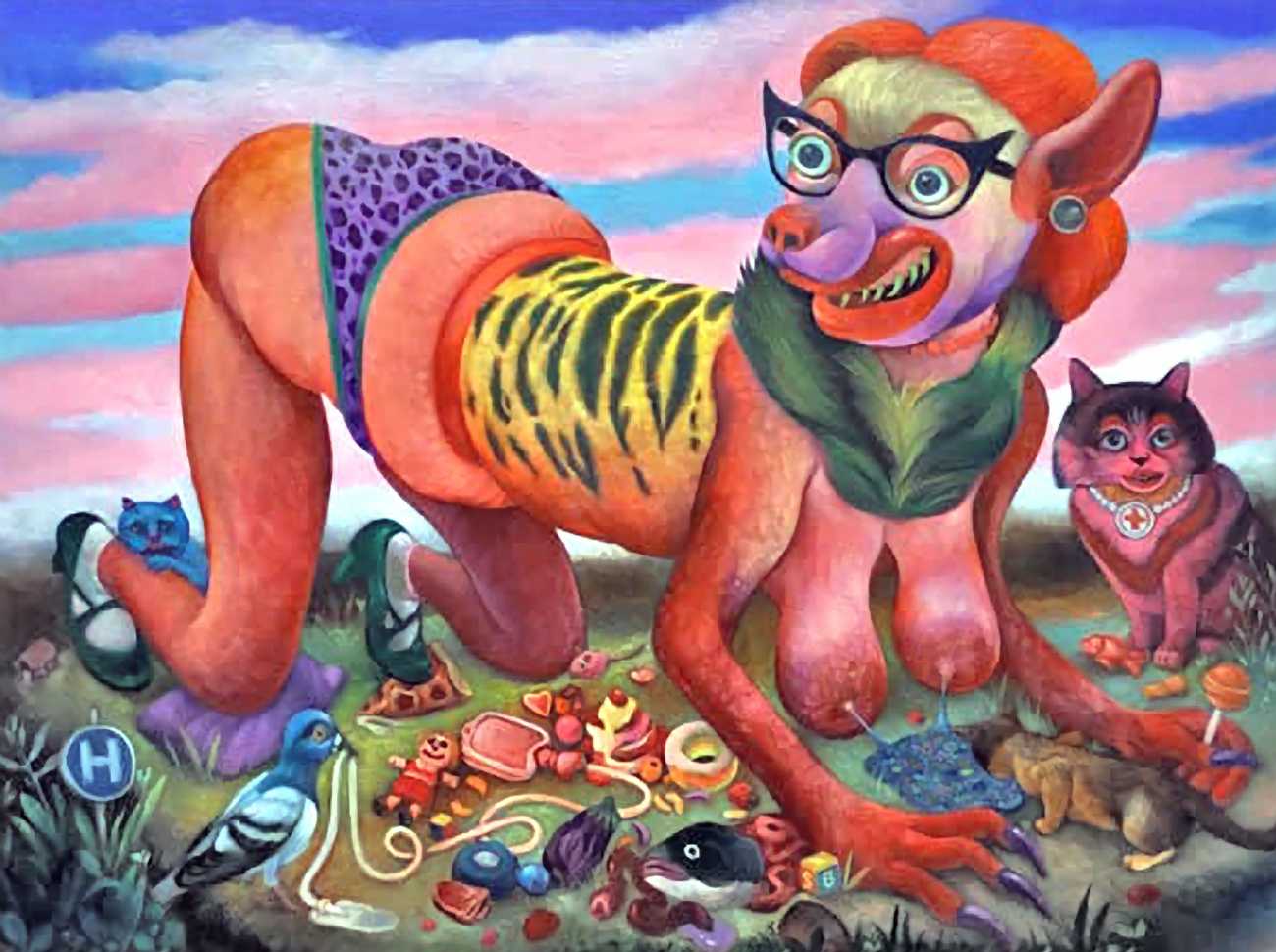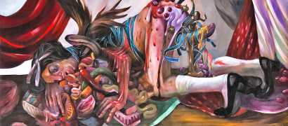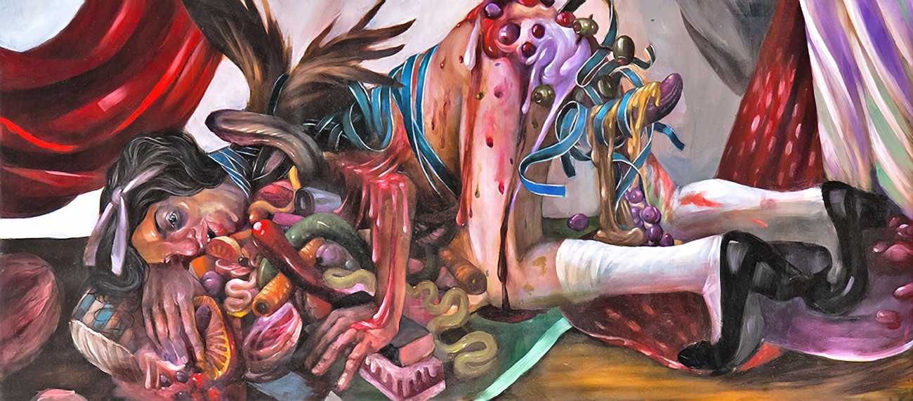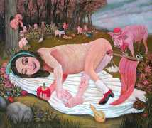 Many of Jacobsen’s paintings blend the boundaries between the human and the non-human – a strange middle ground emerges, where his lush backgrounds are populated by uncanny, hybrid beings possessed of vaguely human features, yet posturing themselves like animals, their clawed and furry appendages replacing their arms and legs. When they are joined by non-human entities, the members of Jacobsen’s troupe act not as predators or prey, but rather as enthusiastic participants within the brutal revelries, allowing themselves to be disembowelled and cannibalised. Jacobsen explains, ‘All the characters are me in a certain way. I am painting what I wish I was, but also what I obsess over in myself – bad and good, disgusting and sensual.’ Jacobsen’s work also contains elements of magical realism. ‘A lot of my early work was based on an Alice in Wonderland aesthetic,’ he says, ‘It's still there in my construction of an alternate reality, my own personal world that I would like to exist in.’