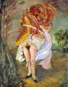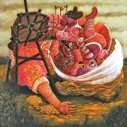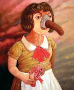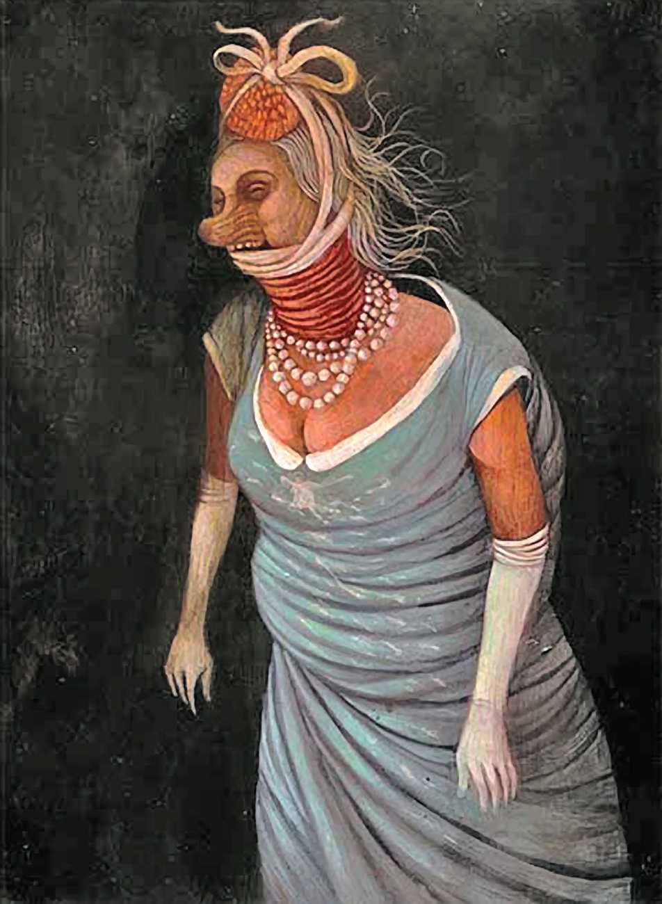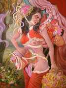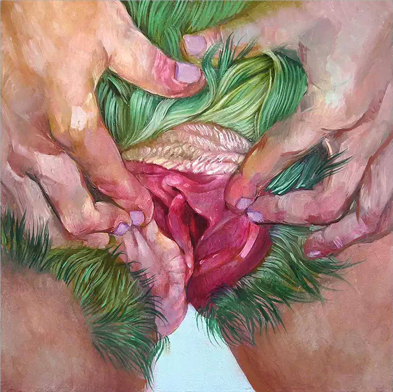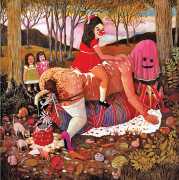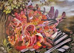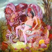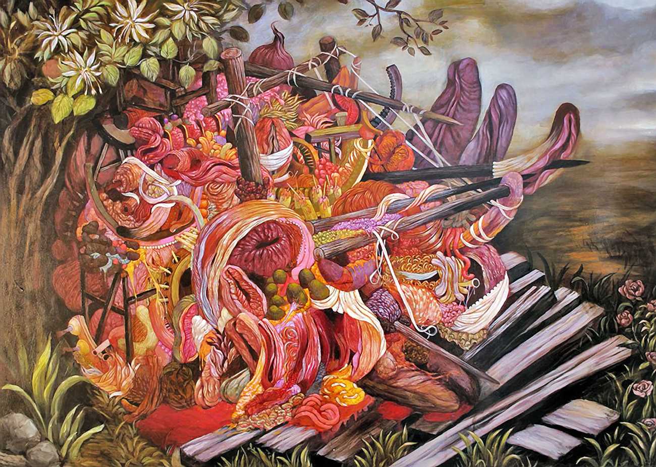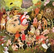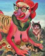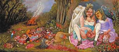 Many of Jacobsen’s paintings blend the boundaries between the human and the non-human – a strange middle ground emerges, where his lush backgrounds are populated by uncanny, hybrid beings possessed of vaguely human features, yet posturing themselves like animals, their clawed and furry appendages replacing their arms and legs. When they are joined by non-human entities, the members of Jacobsen’s troupe act not as predators or prey, but rather as enthusiastic participants within the brutal revelries, allowing themselves to be disembowelled and cannibalised. Jacobsen explains, ‘All the characters are me in a certain way. I am painting what I wish I was, but also what I obsess over in myself – bad and good, disgusting and sensual.’ Jacobsen’s work also contains elements of magical realism. ‘A lot of my early work was based on an Alice in Wonderland aesthetic,’ he says, ‘It's still there in my construction of an alternate reality, my own personal world that I would like to exist in.’