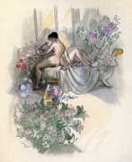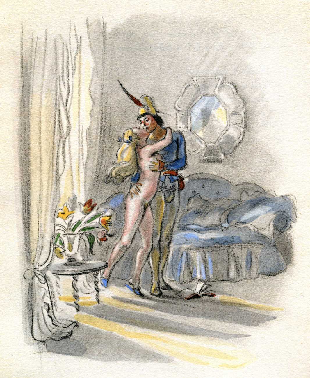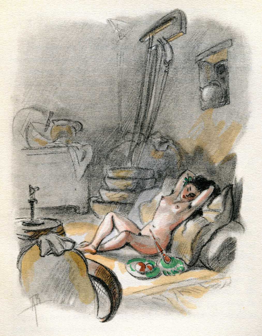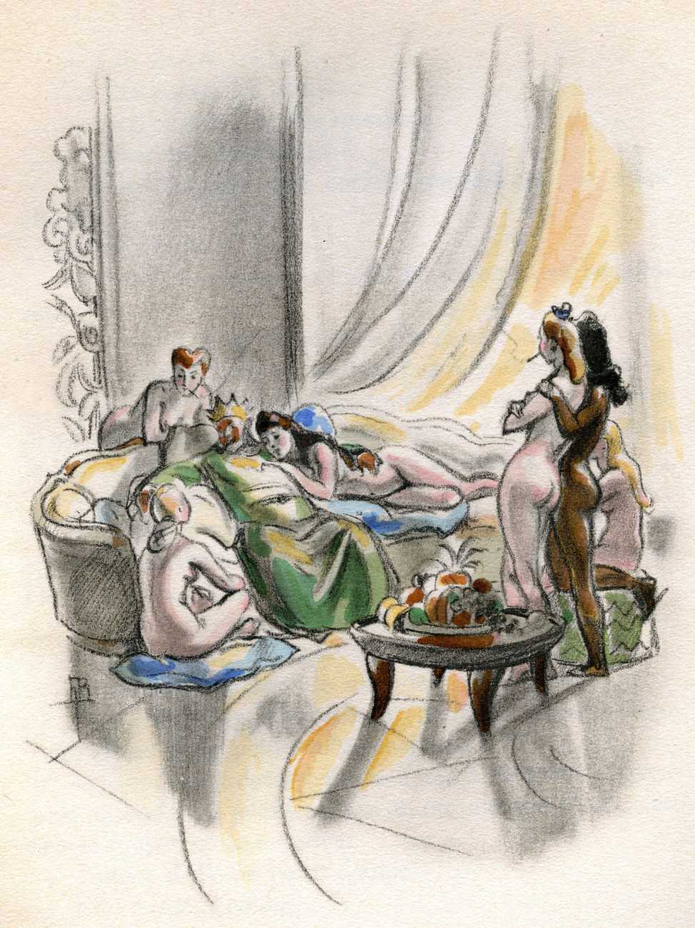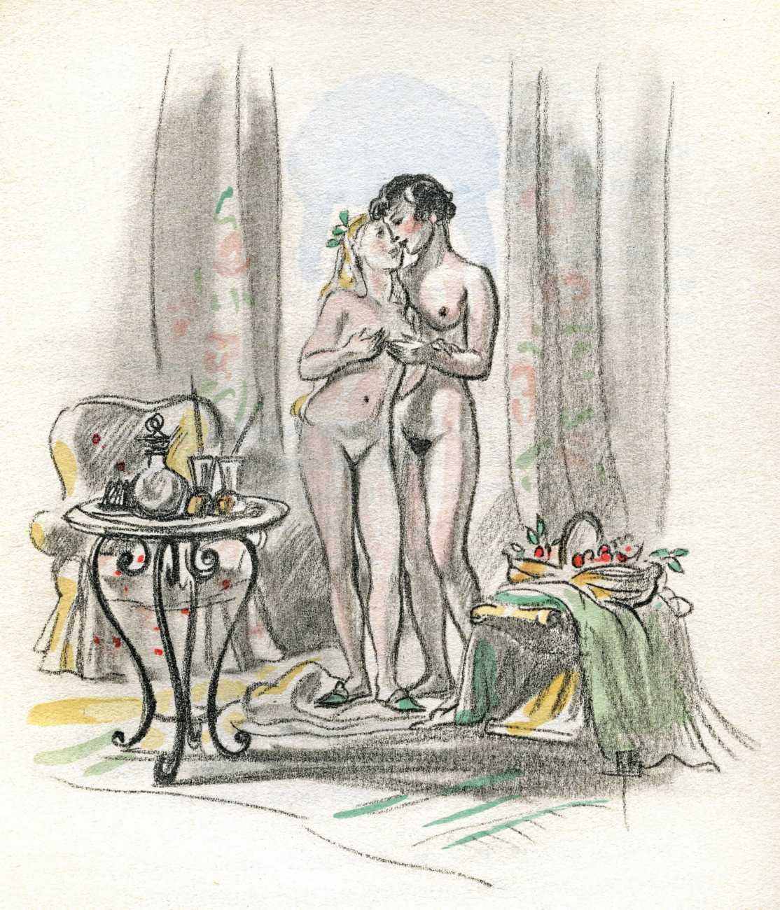 Bellair also illustrated some ten books, the earliest commission being in 1926 for fourteen plates to accompany an edition of the seventeenth-century satirical poetry collection Voyage de Chapelle et de Bachaumont, written by by the two eponymous poets during a trip through Provence and Languedoc. The first of several erotic classics for which she produced drawings was Hugues Rebell’s Les nuits chaudes du Cap Français, and it would appear that her skill and reliability in the genre attracted the attention of other Paris publishers, resulting in commissions for Andréa de Nerciat’s Félicia, Pierre Louÿs’ Roi Pausole, and Théophile Gautier’s Fortunio.