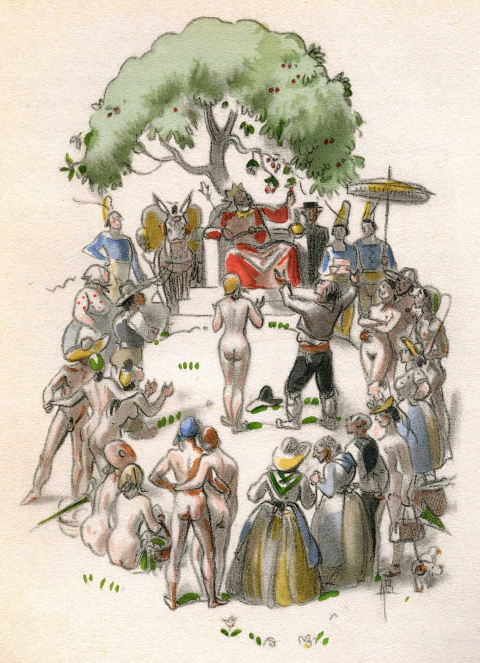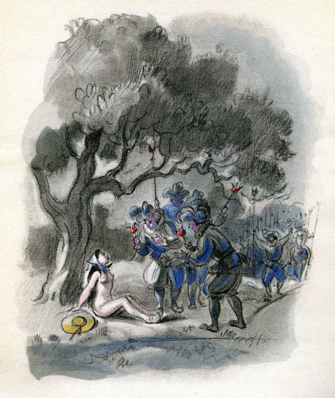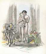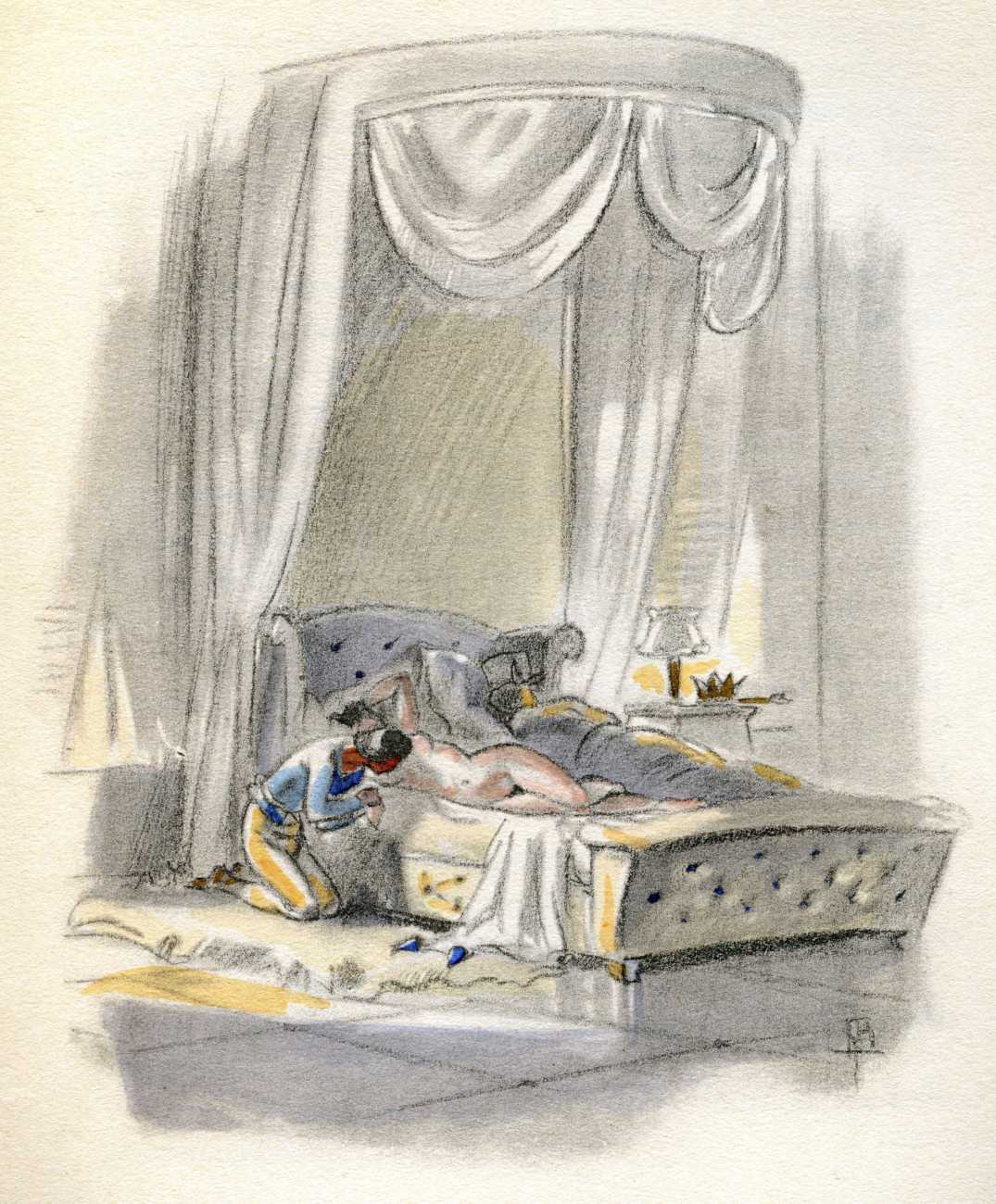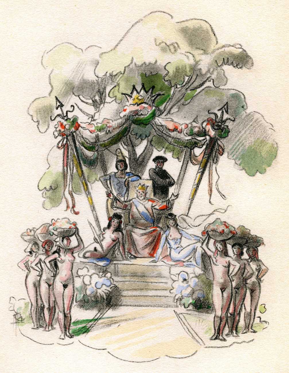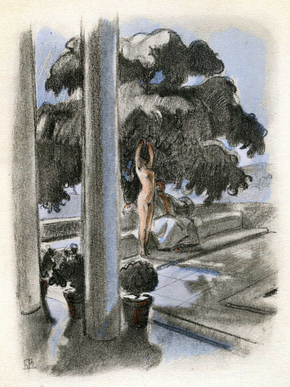 Bellair also illustrated some ten books, the earliest commission being in 1926 for fourteen plates to accompany an edition of the seventeenth-century satirical poetry collection Voyage de Chapelle et de Bachaumont, written by by the two eponymous poets during a trip through Provence and Languedoc. The first of several erotic classics for which she produced drawings was Hugues Rebell’s Les nuits chaudes du Cap Français, and it would appear that her skill and reliability in the genre attracted the attention of other Paris publishers, resulting in commissions for Andréa de Nerciat’s Félicia, Pierre Louÿs’ Roi Pausole, and Théophile Gautier’s Fortunio.