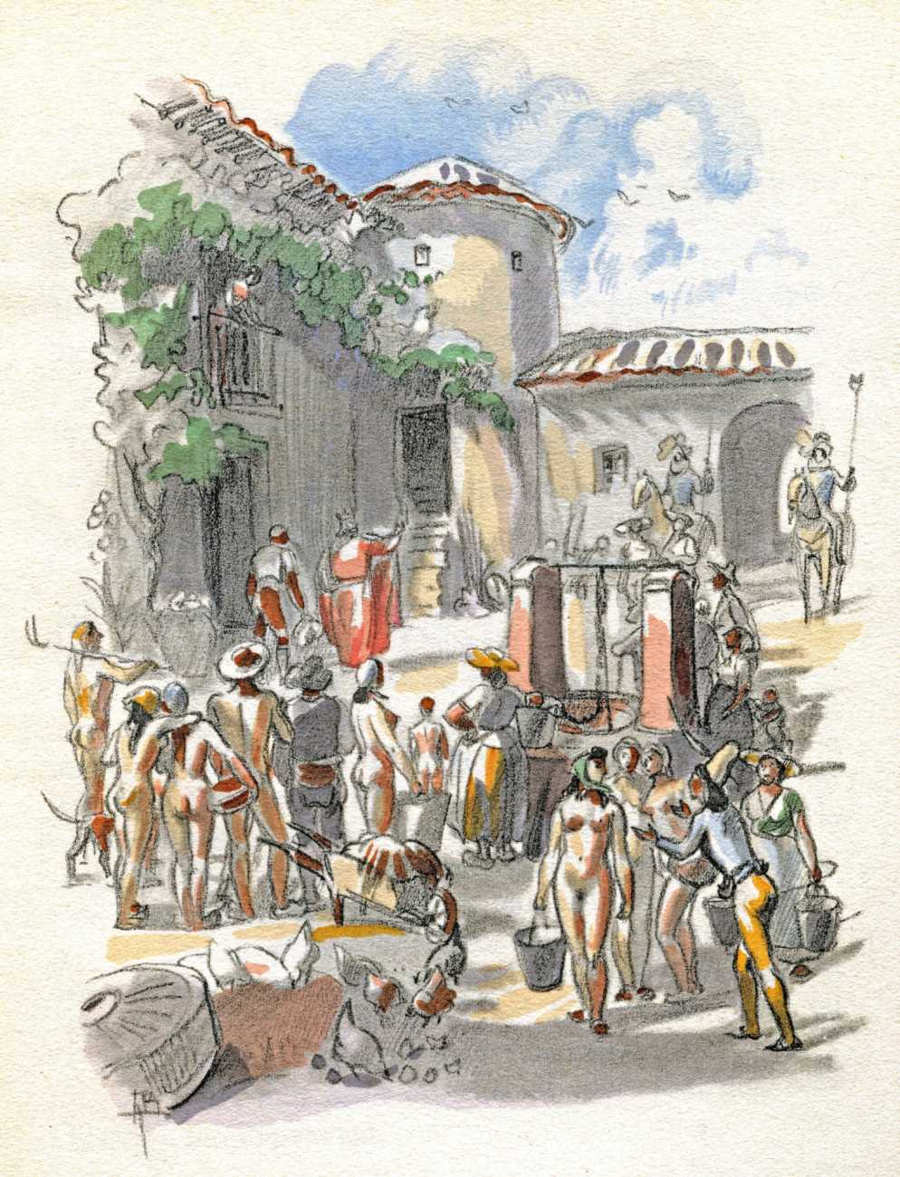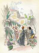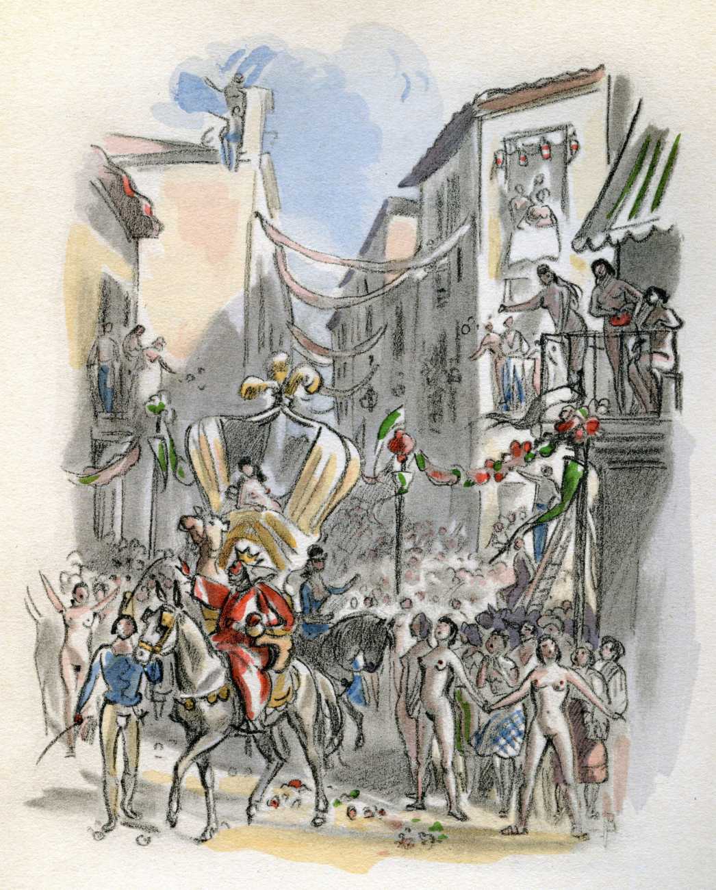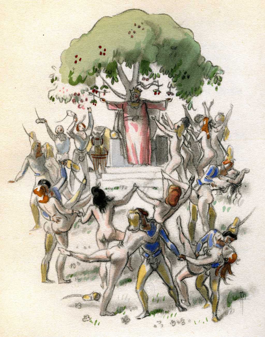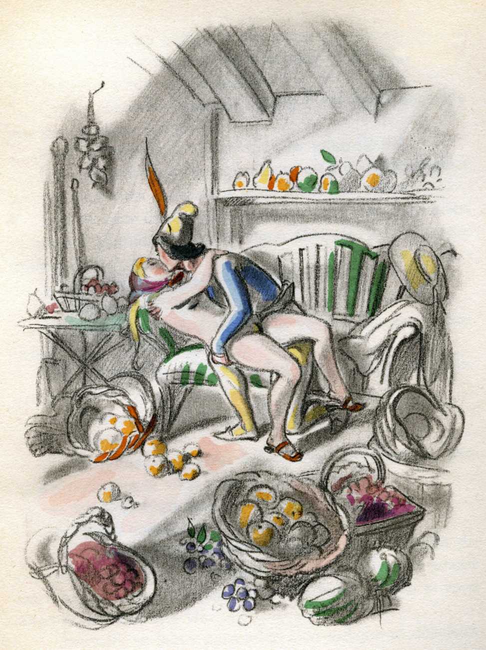 Bellair also illustrated some ten books, the earliest commission being in 1926 for fourteen plates to accompany an edition of the seventeenth-century satirical poetry collection Voyage de Chapelle et de Bachaumont, written by by the two eponymous poets during a trip through Provence and Languedoc. The first of several erotic classics for which she produced drawings was Hugues Rebell’s Les nuits chaudes du Cap Français, and it would appear that her skill and reliability in the genre attracted the attention of other Paris publishers, resulting in commissions for Andréa de Nerciat’s Félicia, Pierre Louÿs’ Roi Pausole, and Théophile Gautier’s Fortunio.