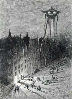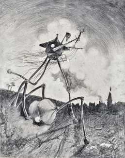 In 1903 he read The War of the Worlds in English, and was inspired to draw his vision of Wells’ Martians. Entirely unsolicited, Corrêa took his drawings to London and showed them to Wells, who was so impressed with the artwork that he invited Corrêa to illustrate the upcoming French edition of The War of Worlds being produced by Belgian publisher L. Vandamme. He spent two years working on the illustrations; Wells loved them and when in 1906 Vandamme published the large-format luxury illustrated French edition, each of the 500 copies was signed by Corrêa. Wells would say of the illustrations, ‘Alvim Corrêa did more for my work with his brush than I with my pen’.