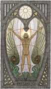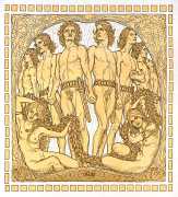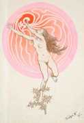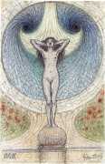 Hugo Höppener held mystical Theosophical beliefs, and became fascinated by German mythology. His early illustrations contained dream-like abstractions, while his later work was characterised by motifs such as peasants, warriors, and other naked human figures in natural settings. He often combined mysticism, eroticism, and symbolism, in Art Nouveau and Secessionist styles. By 1900 he was one of the best known painters in Germany, and had come under the influence of writers such as Arthur Moeller van den Bruck, Heinrich and Julius Hart, and the anti-materialist garden city and Wandervogel movements. In 1912 he designed a famous poster for a congress on ‘biological hygiene’ in Hamburg, showing a man in the process of breaking his bonds and rising up to the stars.