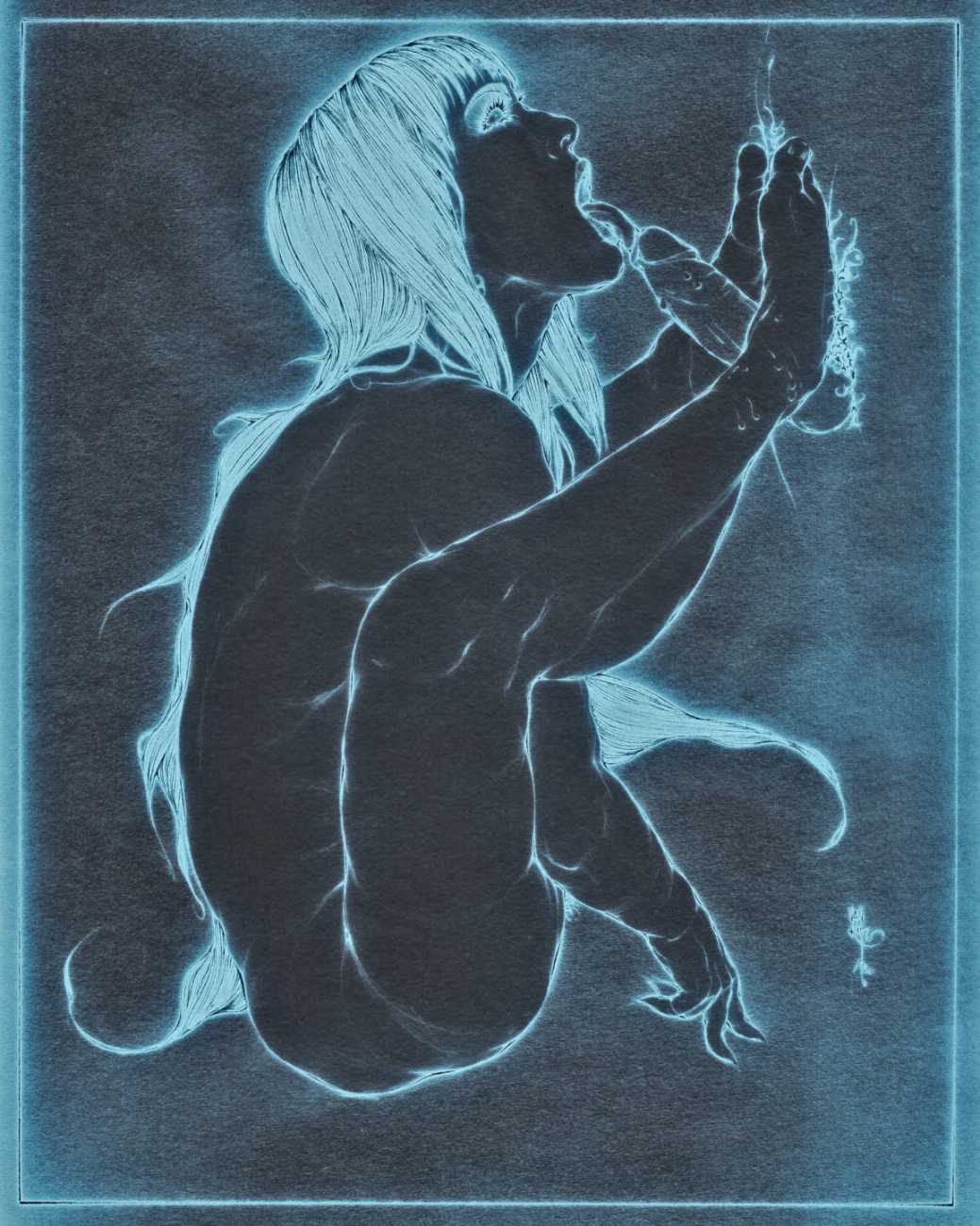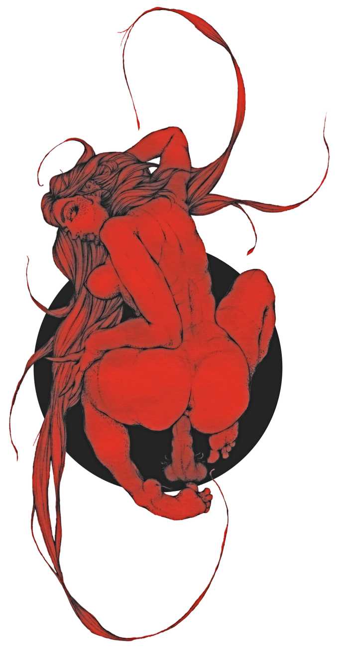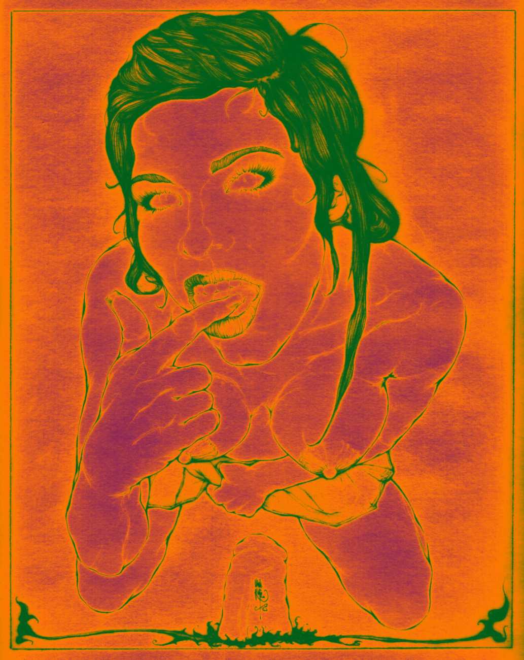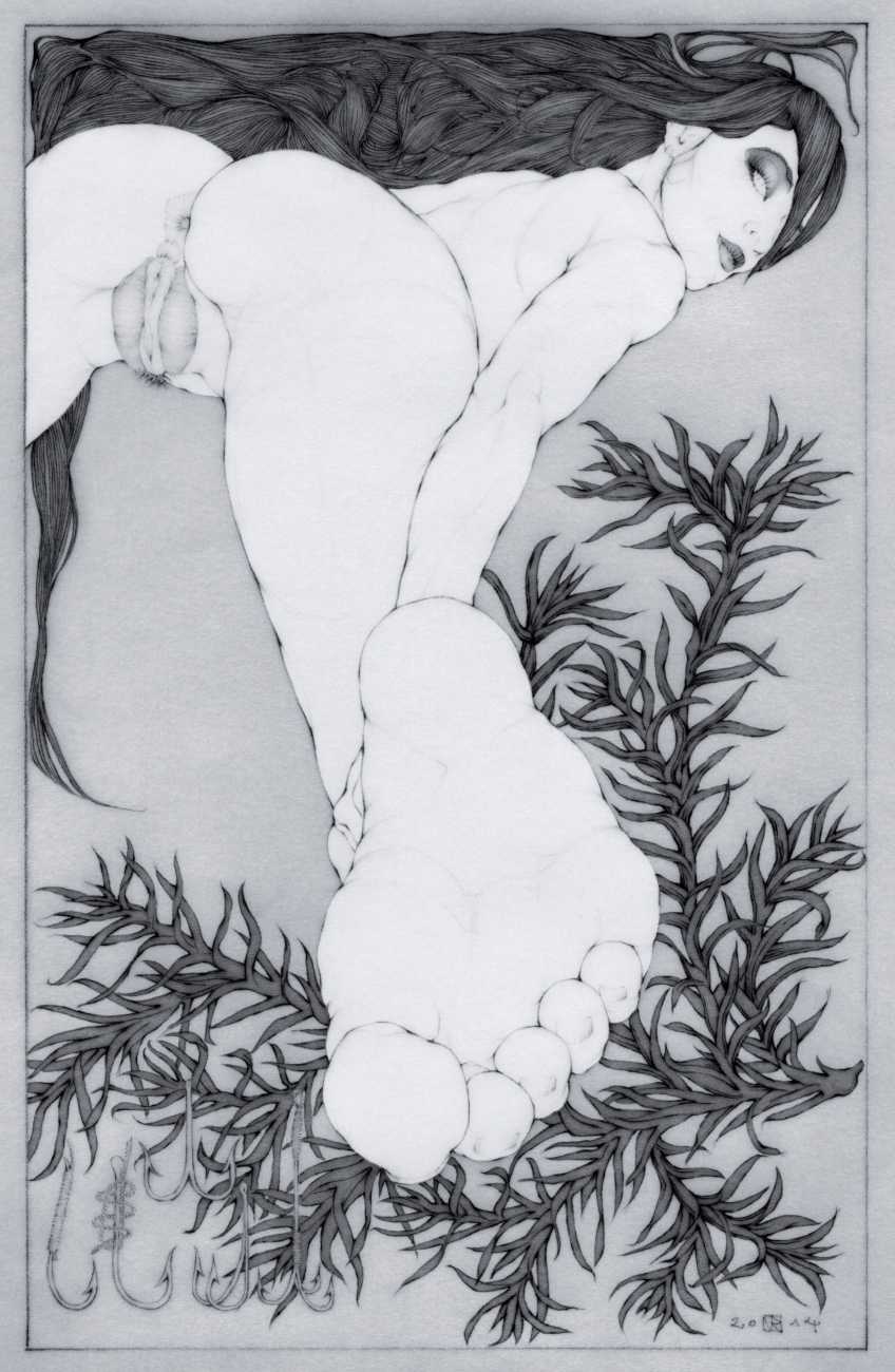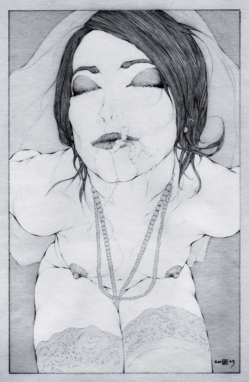 He started sharing his work online in 2005, and his first illustrated book, The Book of Hours, was published in 2010. Most of his recent work is scanned and then enhanced digitally. Much of his material originates from mainstream porn sites, though more as an inspiration than any sort of direct copy. As he explains, ‘I mainly work with these images because I am looking for an idealising effect. If everything goes well, the original imagery is elevated to an ethereal level, contrasting with the bluntness of the original photograph, visualising the shifts between object and desire, and revealing the fact that phoniness often holds an essential truth. Though a figure may be recognised as being in a “porn pose”, the authenticity of my interpretation is essential. My interpretation is not meant to be a portrait, more an expression of adoration, an inscrutable quality which affects the viewer, and which might even carry traces of religious faith and divinity.’