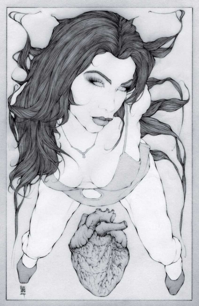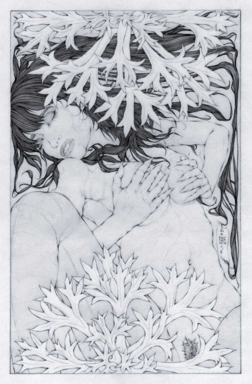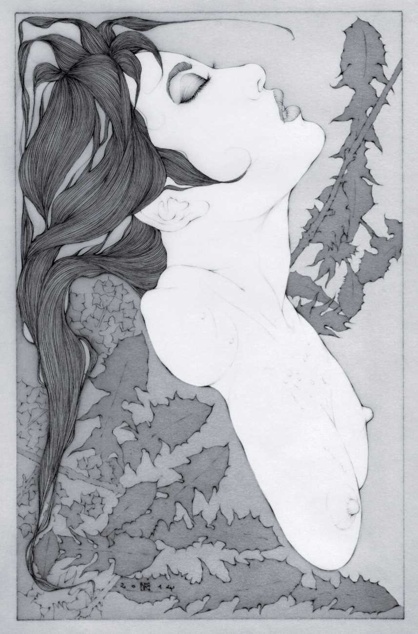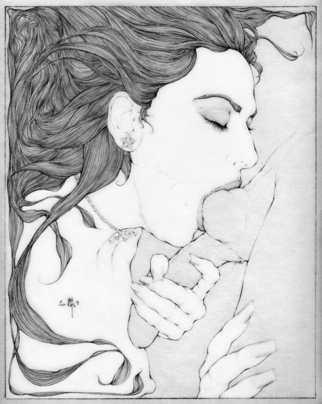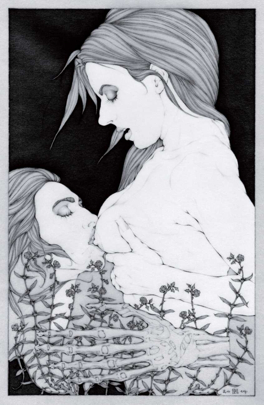 He started sharing his work online in 2005, and his first illustrated book, The Book of Hours, was published in 2010. Most of his recent work is scanned and then enhanced digitally. Much of his material originates from mainstream porn sites, though more as an inspiration than any sort of direct copy. As he explains, ‘I mainly work with these images because I am looking for an idealising effect. If everything goes well, the original imagery is elevated to an ethereal level, contrasting with the bluntness of the original photograph, visualising the shifts between object and desire, and revealing the fact that phoniness often holds an essential truth. Though a figure may be recognised as being in a “porn pose”, the authenticity of my interpretation is essential. My interpretation is not meant to be a portrait, more an expression of adoration, an inscrutable quality which affects the viewer, and which might even carry traces of religious faith and divinity.’