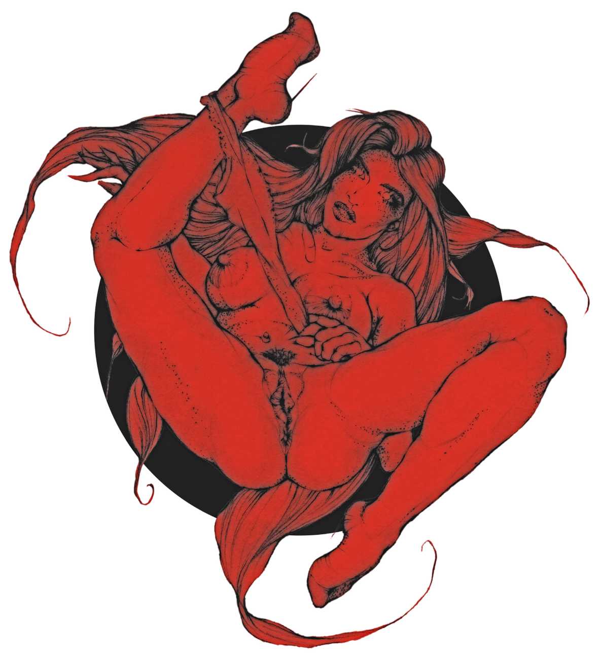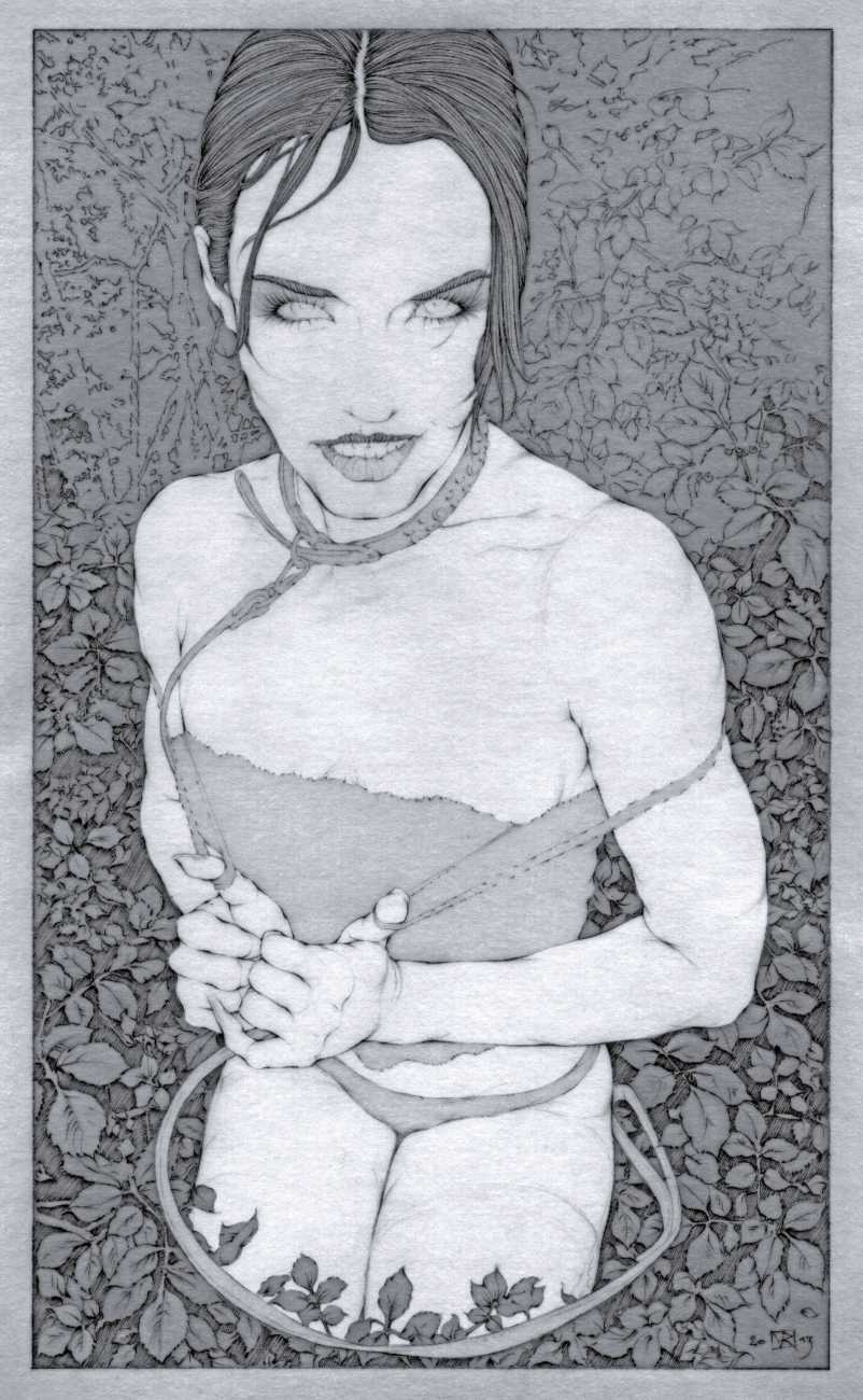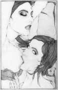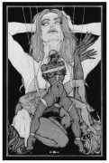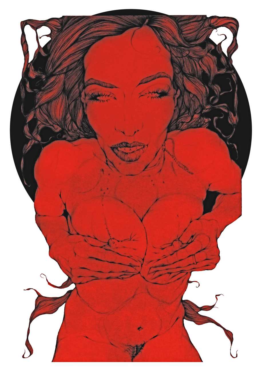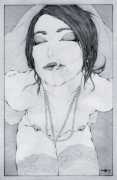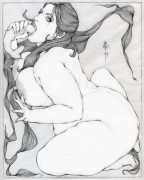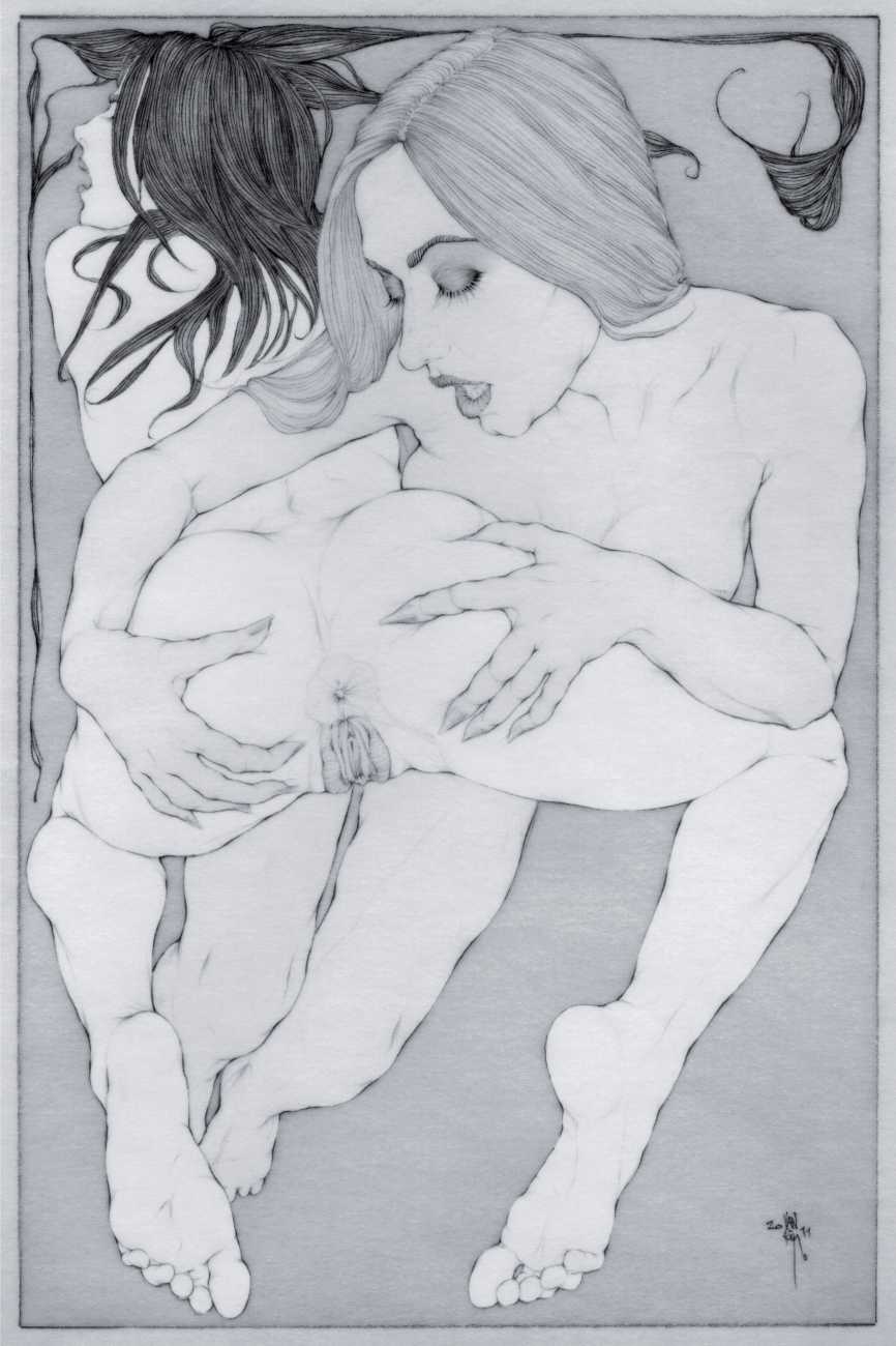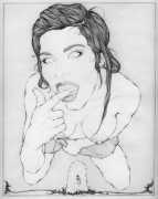 Fellow artist Kayla Freedman has written of his work, ‘Jan van Rijn has a very distinctive style, taking more standard erotic model poses and rendering them in an exaggerated and sexually corpulent fashion. There are no anorexic waifs – the bodies are fleshy and unashamedly sexual. His figures seem to revel in their exhibitionism and wantonness. His erotic drawings cover straight aspects of sexuality, but then also stray into more fetishistic iconography – high heels, long nails, lingerie, bondage, piercing and transsexuals. The style of van Rijn’s erotic art is very simple, just black, white and grey, but while these images may at first seem bold and simple they are anything but. The quality of the lines and shading is deliberate, the detailed layering of fine lines in the hair, the lips, the nipples, but also the careful rendering of the delicate folds. And the drawings which push the distortion of angle and view, or where the body seems to expand to fill every crevice of the canvas – it is this attention to detail where the work becomes art.’