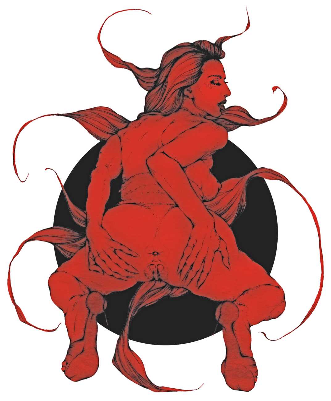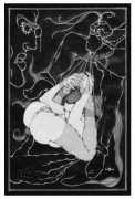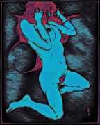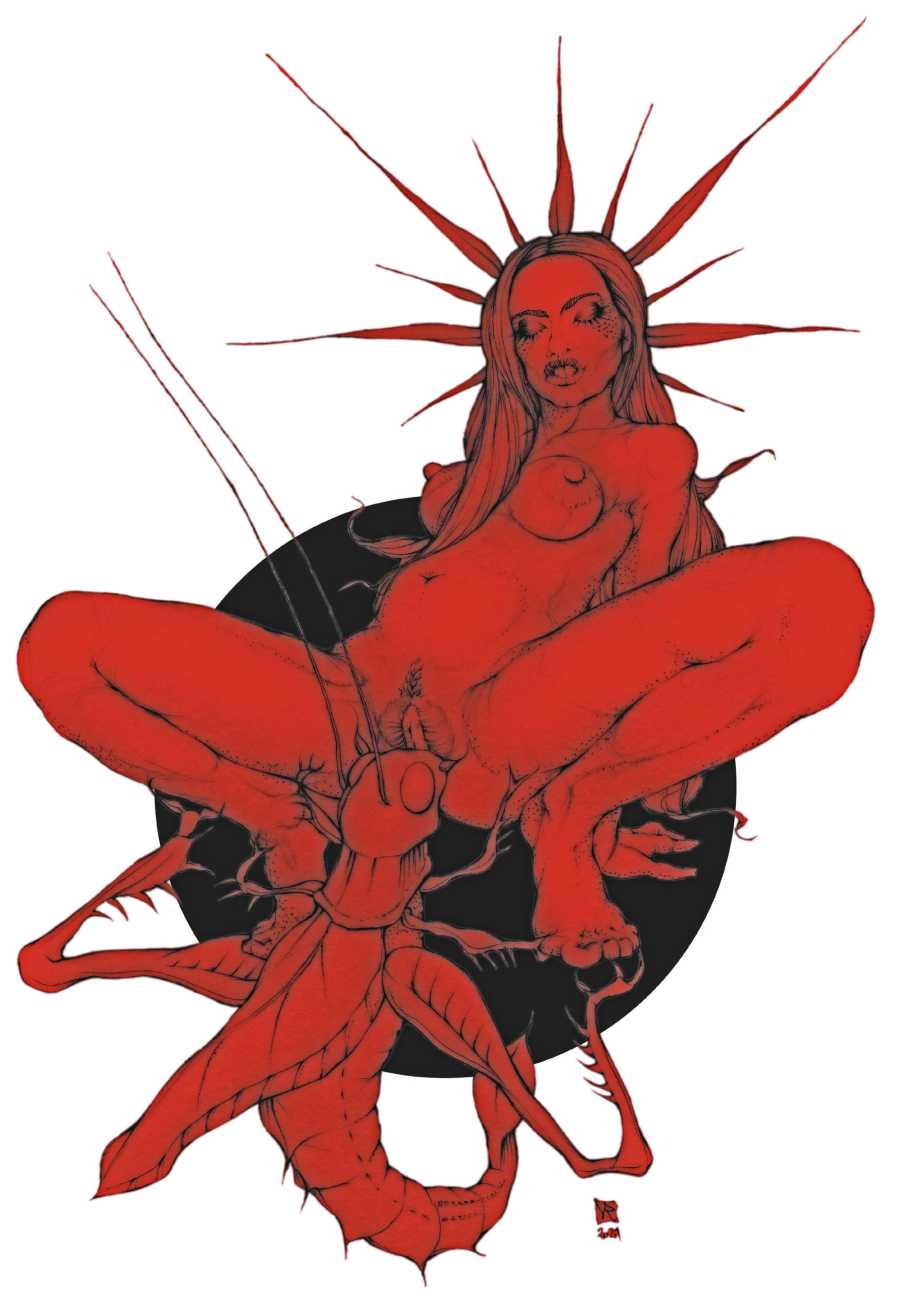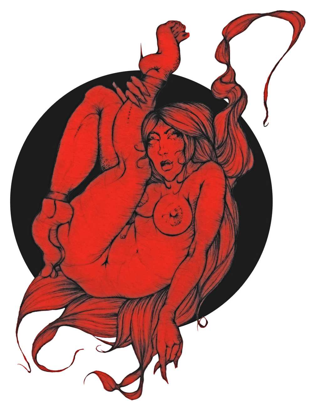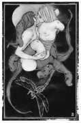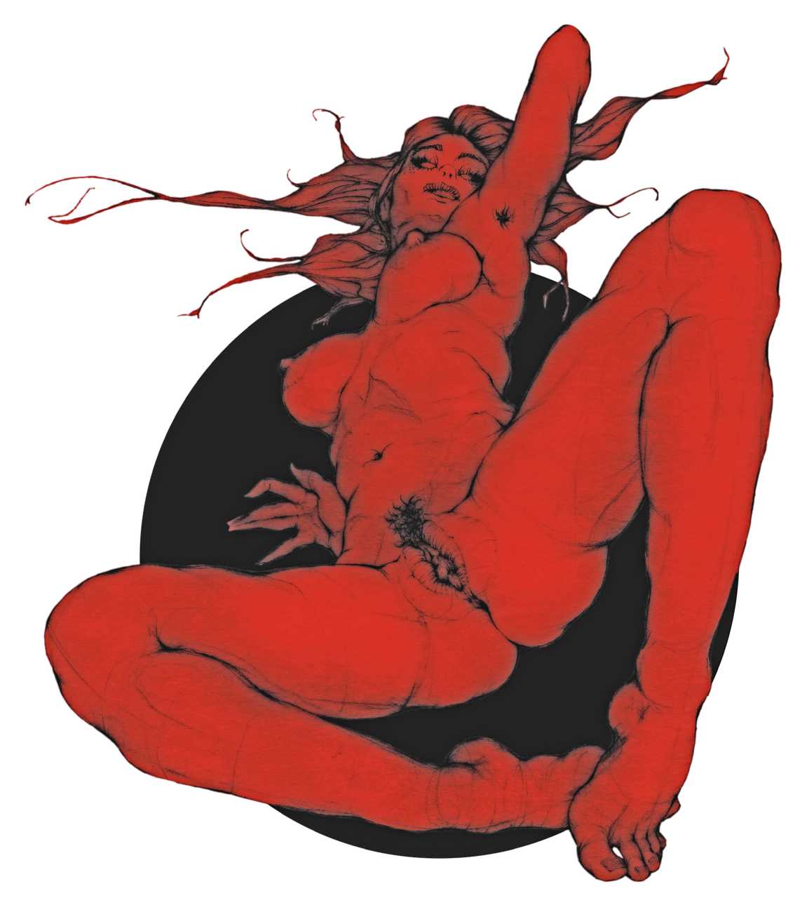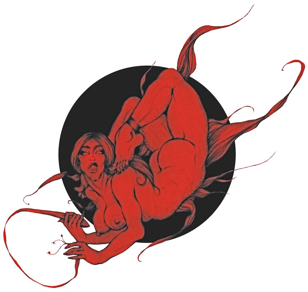 Fellow artist Kayla Freedman has written of his work, ‘Jan van Rijn has a very distinctive style, taking more standard erotic model poses and rendering them in an exaggerated and sexually corpulent fashion. There are no anorexic waifs – the bodies are fleshy and unashamedly sexual. His figures seem to revel in their exhibitionism and wantonness. His erotic drawings cover straight aspects of sexuality, but then also stray into more fetishistic iconography – high heels, long nails, lingerie, bondage, piercing and transsexuals. The style of van Rijn’s erotic art is very simple, just black, white and grey, but while these images may at first seem bold and simple they are anything but. The quality of the lines and shading is deliberate, the detailed layering of fine lines in the hair, the lips, the nipples, but also the careful rendering of the delicate folds. And the drawings which push the distortion of angle and view, or where the body seems to expand to fill every crevice of the canvas – it is this attention to detail where the work becomes art.’
