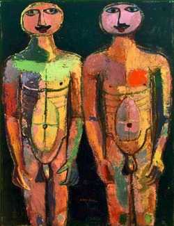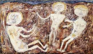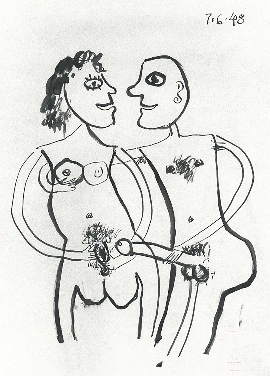 Dubuffet’s return to art was accompanied by a passion for primitive and naive art forms, as well as for paintings made by the psychologically disturbed. By 1945 he had started to collect so called Art Brut (‘raw art’), and in 1948 he founded a society, La Compagnie de l’Art Brut, to promote this type of work. He also wrote some important statements criticising the cultural aims of Western art, advocating a more spontaneous, non-verbal, and spiritually potent qualities of primitive cultural expression. This resulted in a totemic approach to image making which soon revealed itself in his first exhibition, where city life and images of men and women were presented with an aggressively simple and childish vigour. The paintings from this period often look like graffiti or tribal emblems. This is also the period when he produced a number of drawings featuring raw sex, which many viewers saw as crude and childish.