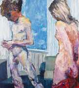 In a 2016 interview with Paul d’Agostino in Art Interviews NY, d’Agostina wrote ‘Jim is among the most prolific and existentially devoted artists I’ve ever known. His large, indeed mammoth paintings are manifestly gestural, chromatically invigorated portrayals of sexually exploratory intimacies on monumental scales. By blowing so far up and out such ostensibly private moments of variable ardour, discomfort or bliss, and by doing the thrust of the painting with his hands or improvised tools as opposed to brushes or knives, Jim mines the allegorical and titillatory potential of some of life’s most delicate details in a visceral, consummate manner.’