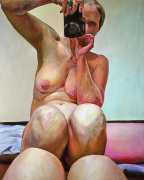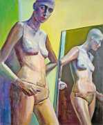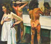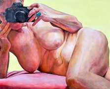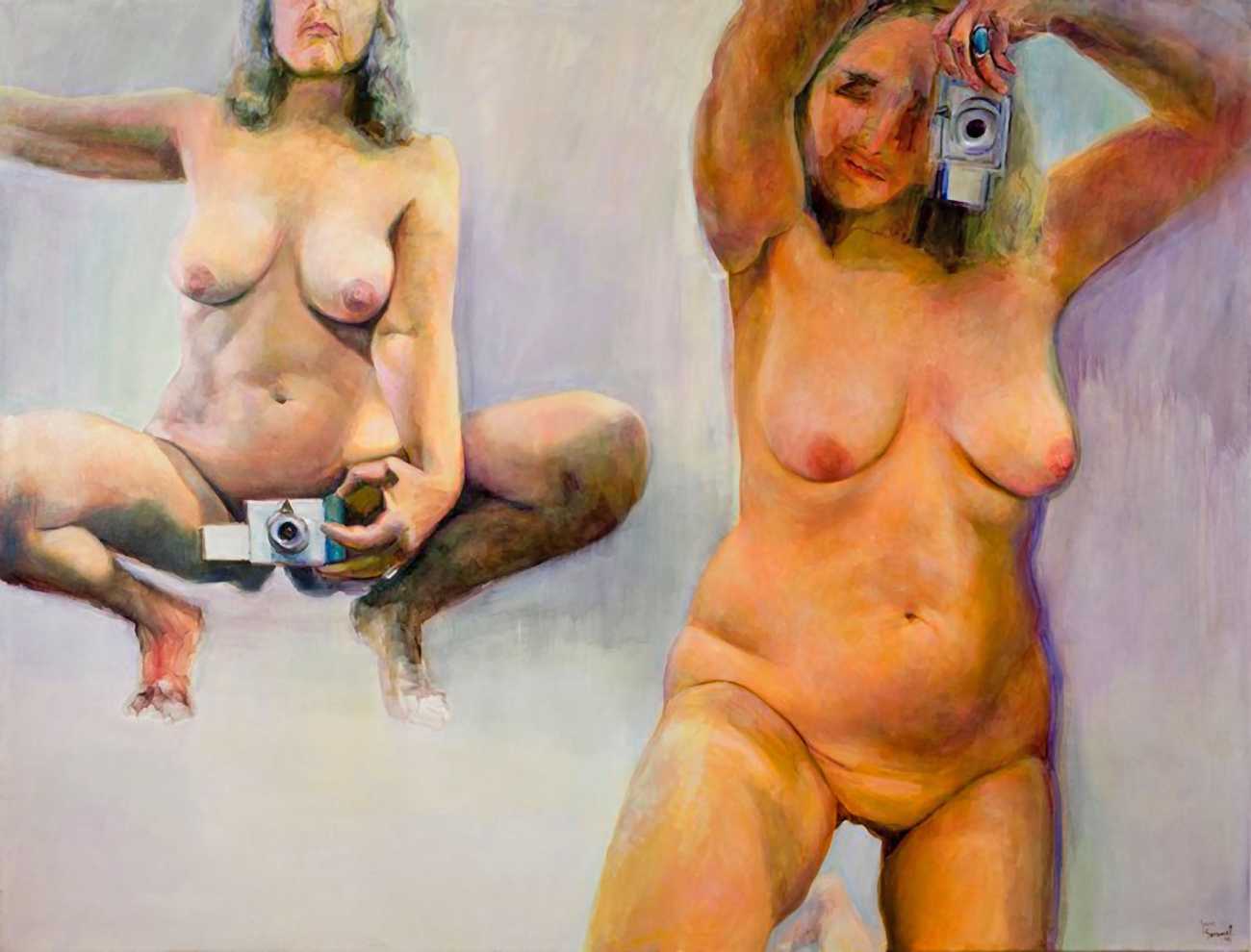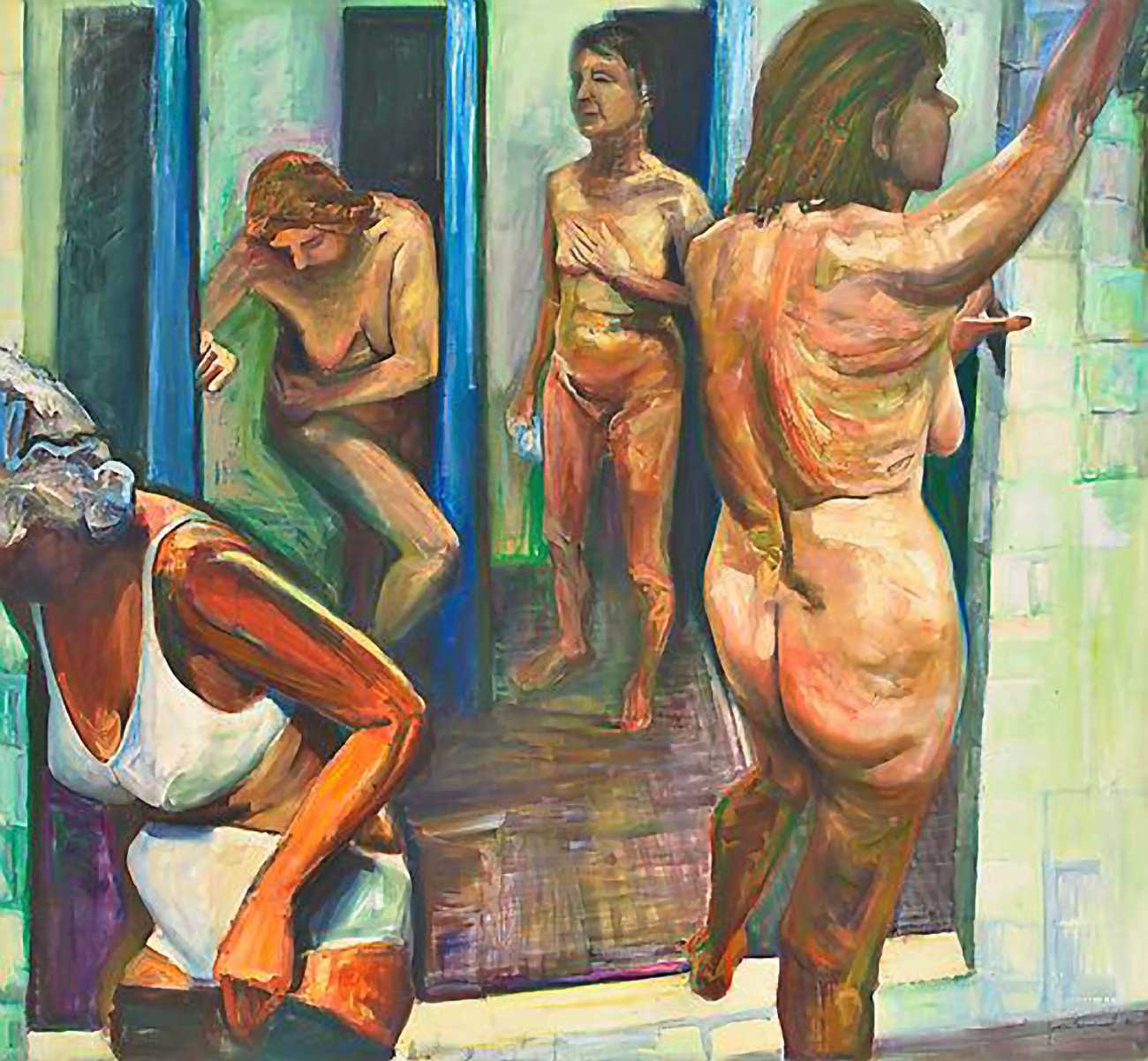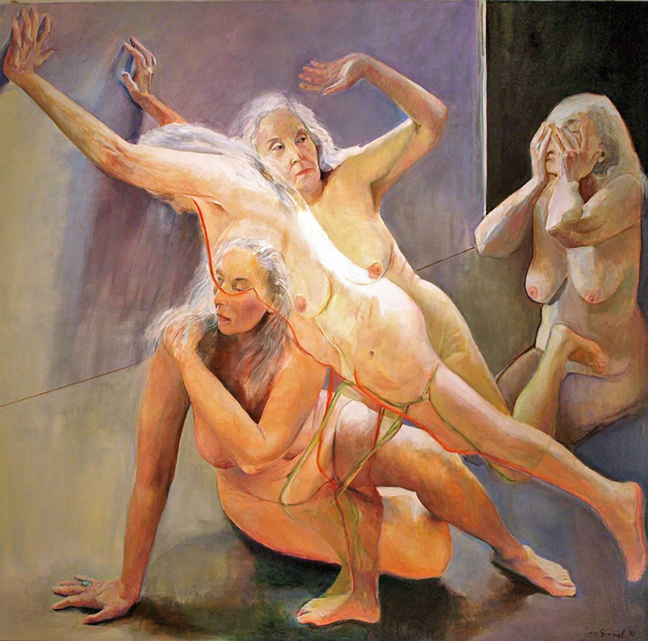 Starting in the 1980s she stopped painting men and started using herself as a model, reinventing her own naked body as she aged. She made a series of paintings in locker rooms and gymnasiums where people were looking at themselves in mirrors, and took pictures of herself in the mirror holding her camera. Years later she used drawings from the locker room series and superimposed them over earlier sex paintings, layering one image over the other. The figures seem to be in motion as if they are moving through time.