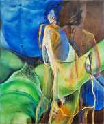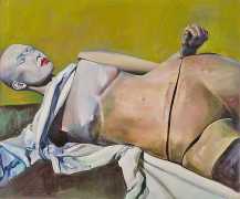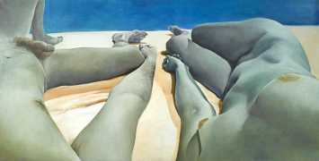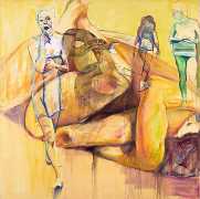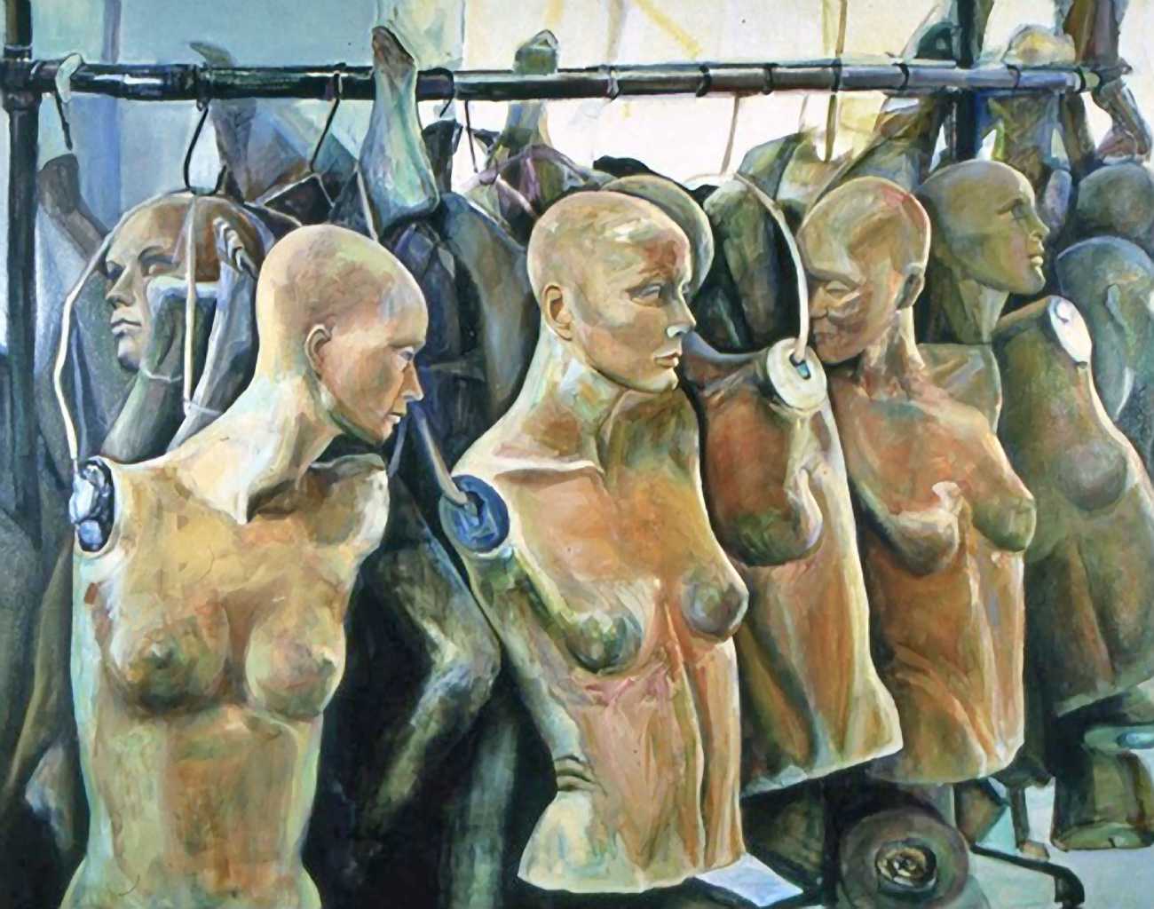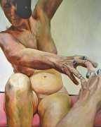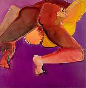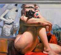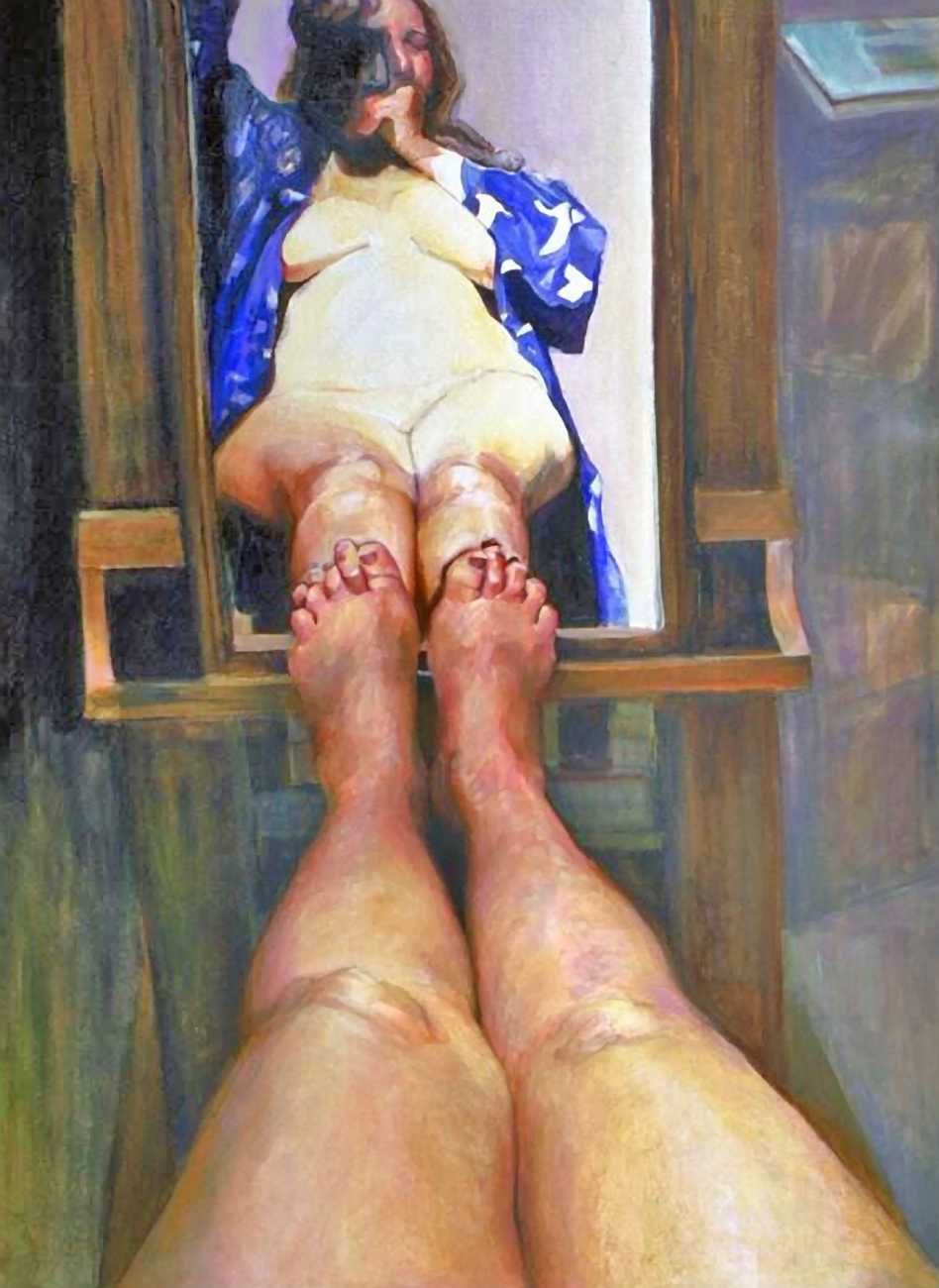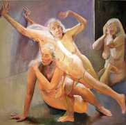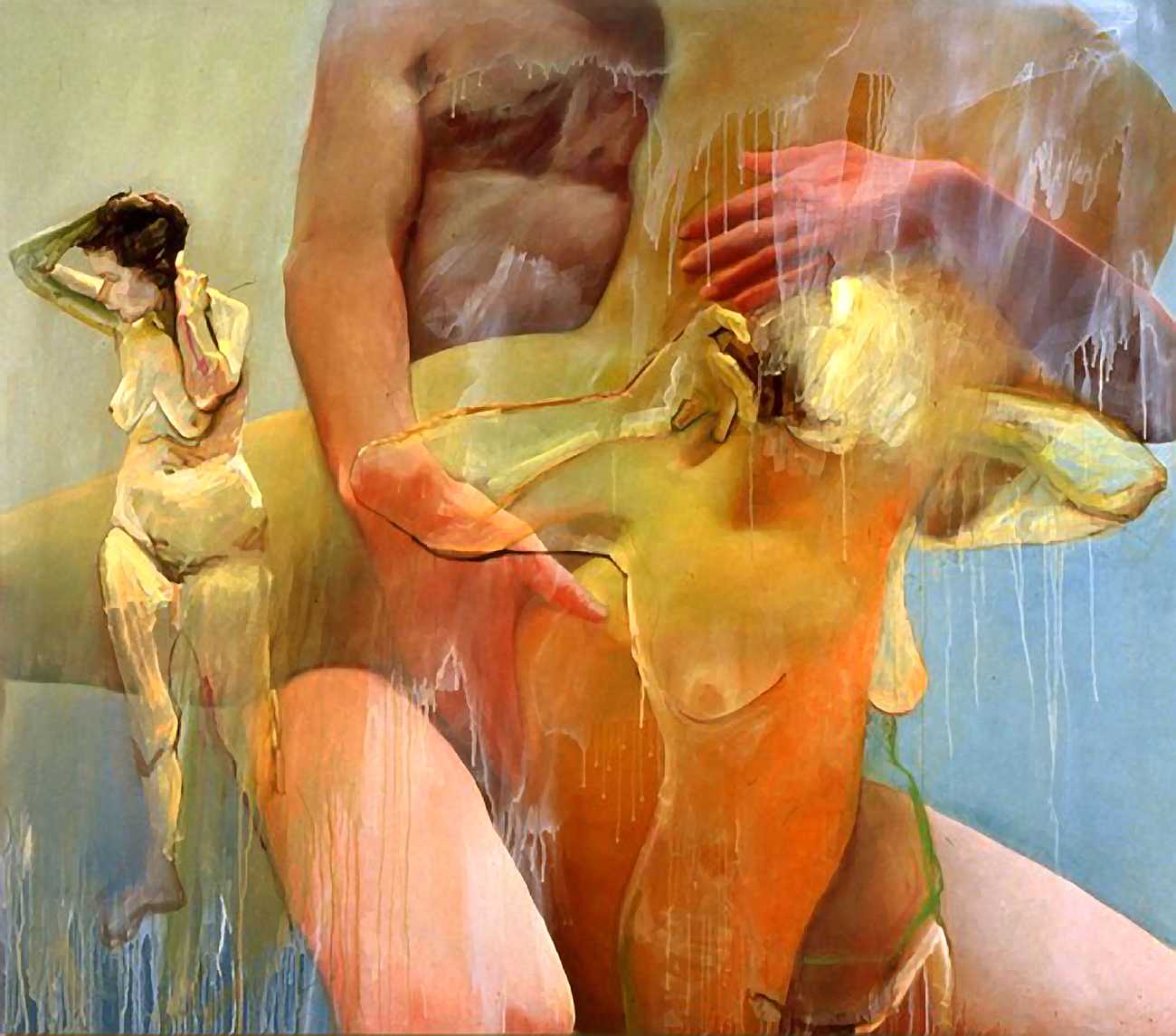 Starting in the 1980s she stopped painting men and started using herself as a model, reinventing her own naked body as she aged. She made a series of paintings in locker rooms and gymnasiums where people were looking at themselves in mirrors, and took pictures of herself in the mirror holding her camera. Years later she used drawings from the locker room series and superimposed them over earlier sex paintings, layering one image over the other. The figures seem to be in motion as if they are moving through time.