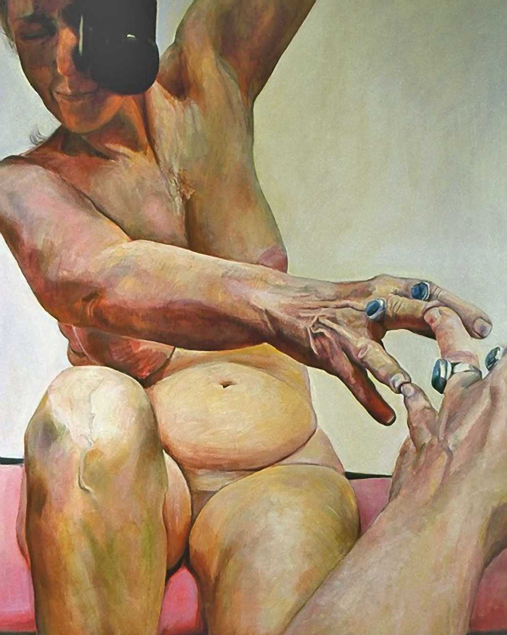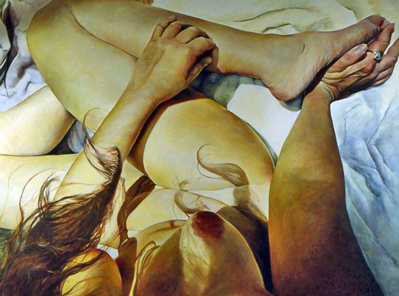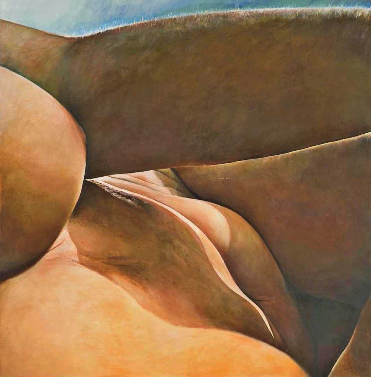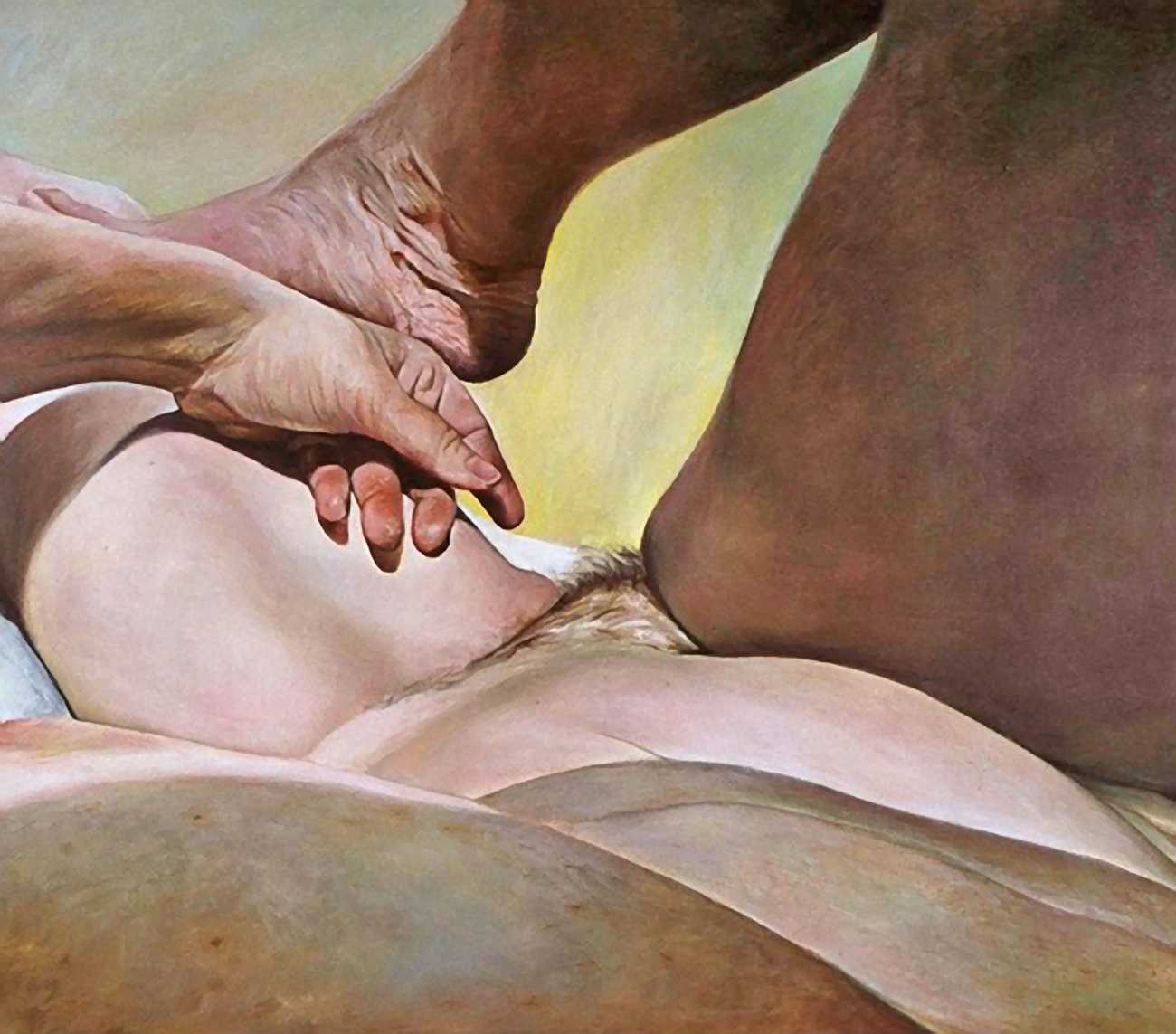 Joan Semmel, who has been painting naked bodies for more than half a century, is best known for her large hyper-realistic works which still shock many viewers. Her focus has brought her into conflict with historic messages about women’s sexual passivity and women’s value as a seductive lure. As she explains, ‘Women are essentially a chattel in so much of the history of western art, and that’s what I have always rebelled against.’