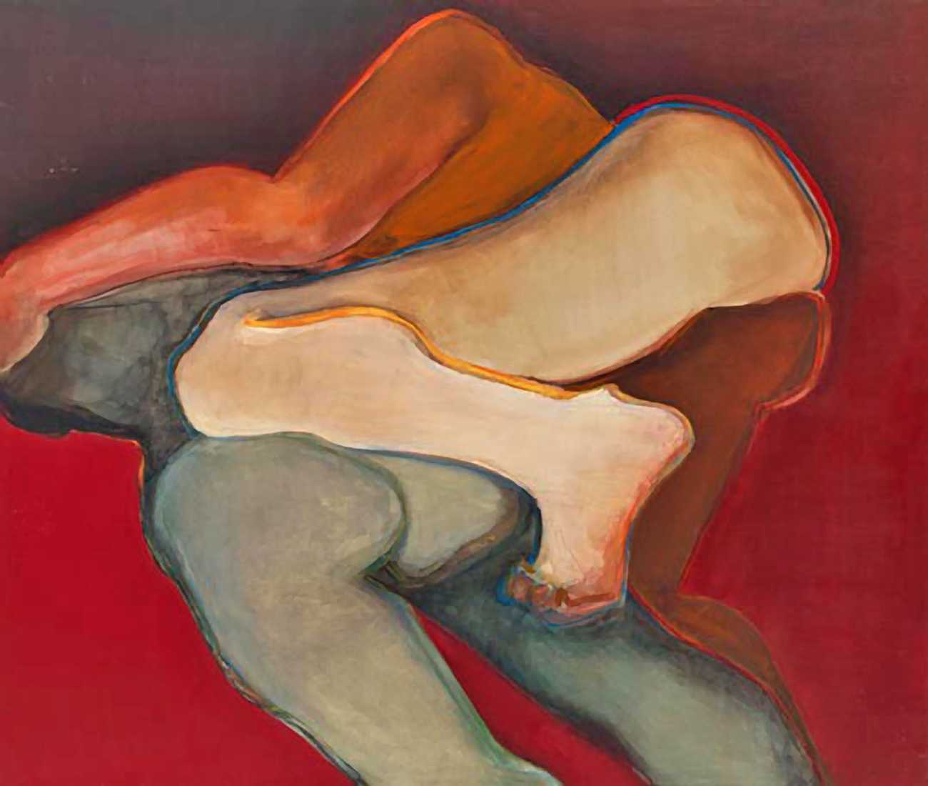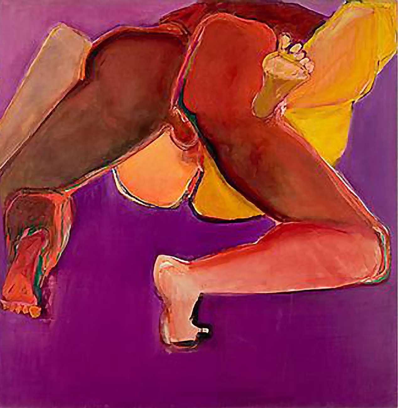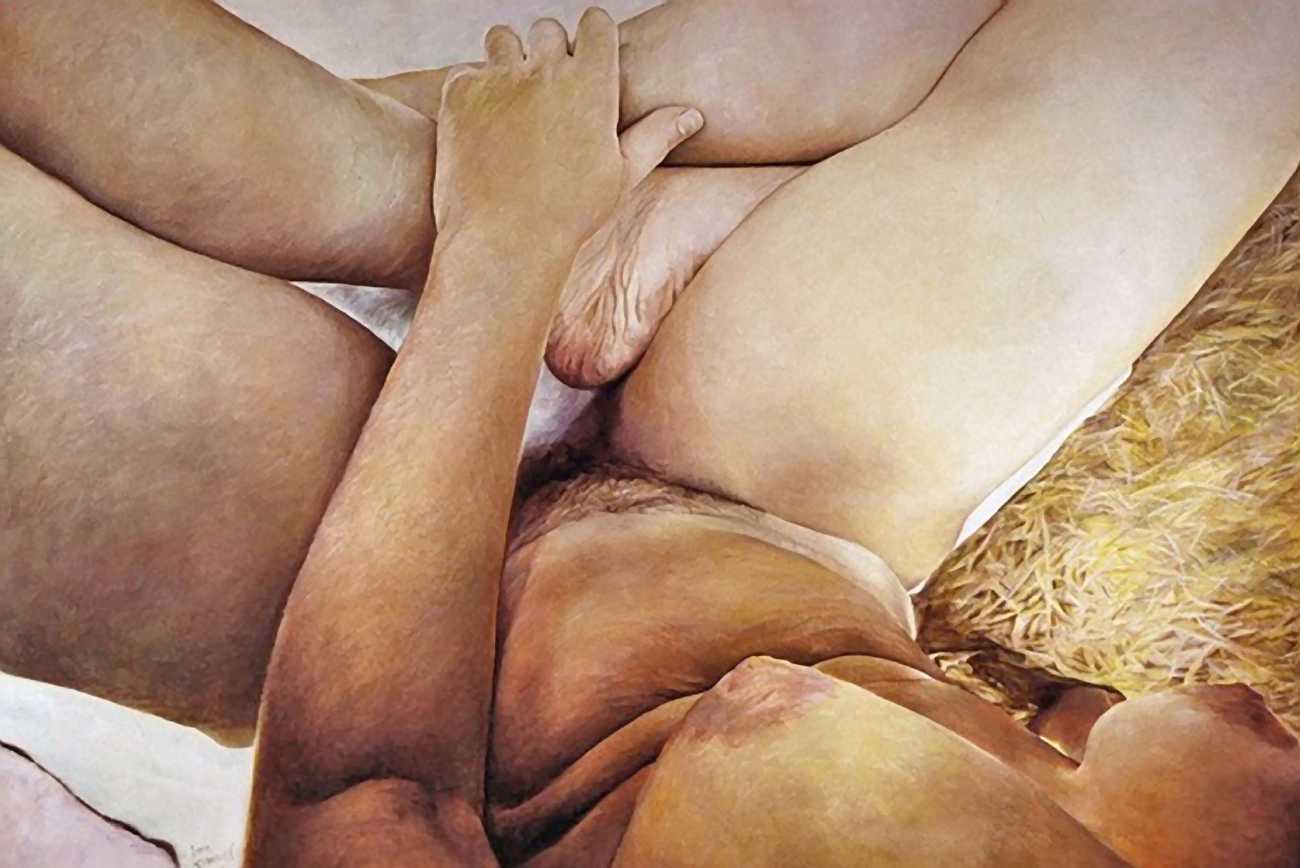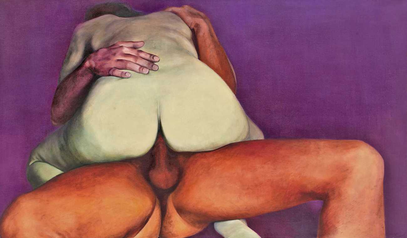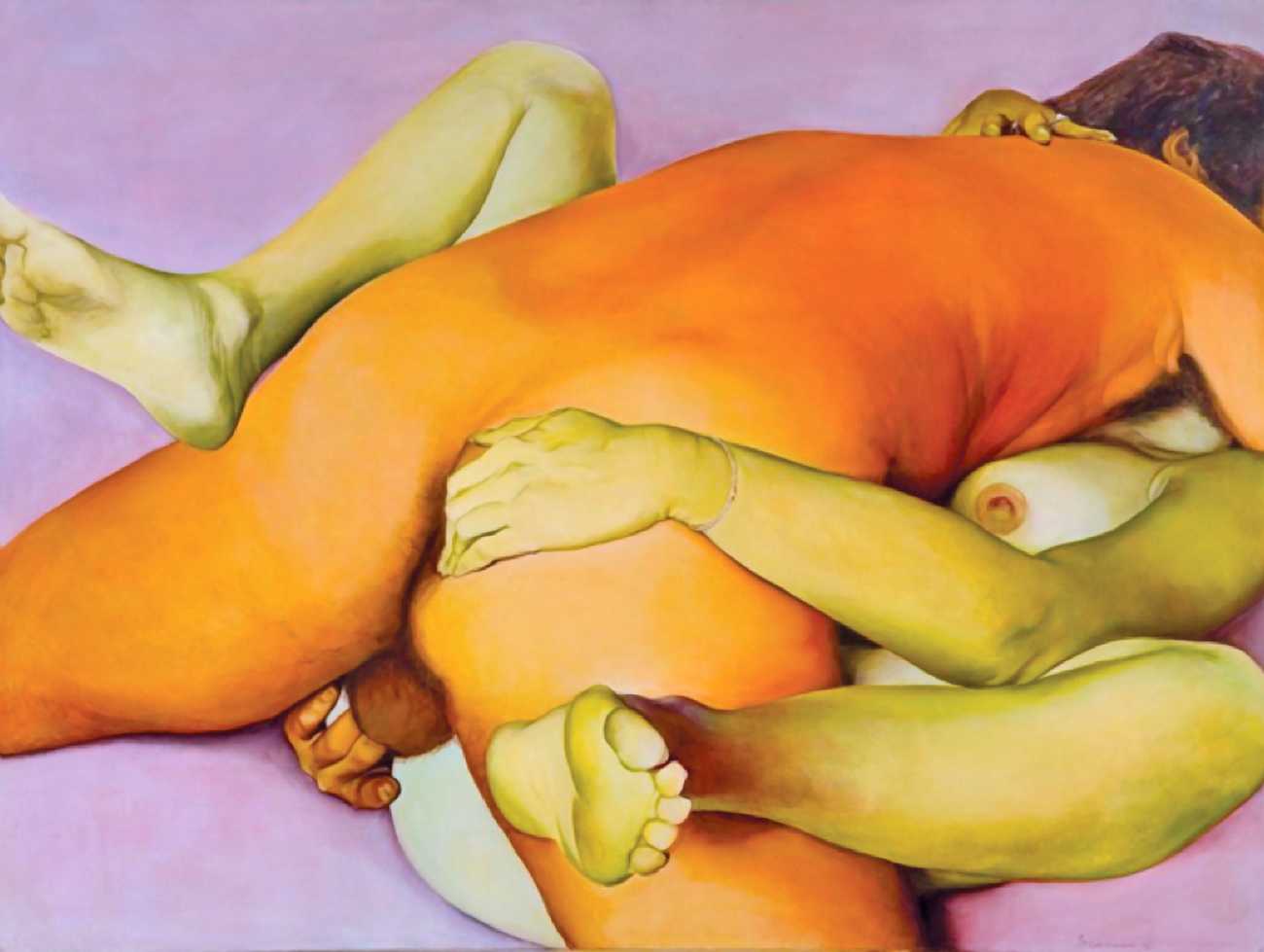 For the next eight years in Spain she painted in an abstract expressionist style, but felt sidelined in the genre since abstraction was the style of privileged white men. In 1970 she returned to New York and started working on her ‘sex paintings’, large-scale oils of people having sex. While their bodies were realistically rendered, they were painted in vivid colours of red, purple, yellow and green. Her 1972 ‘erotic series’ featured models sharing sex in her studio. Again the sexual scenes were realistic, but the unreal hues served as a reminder of her early years of painting abstract art.