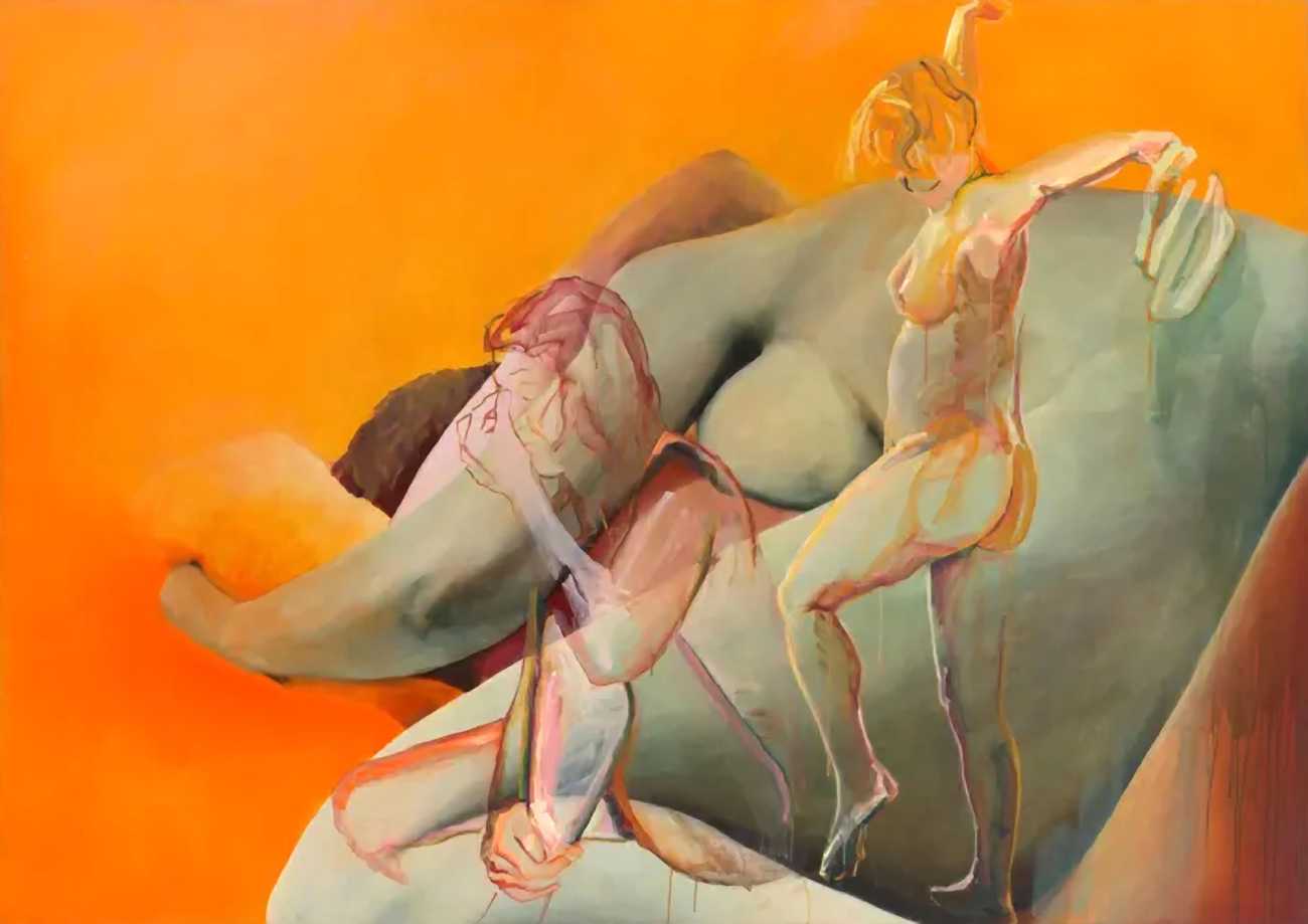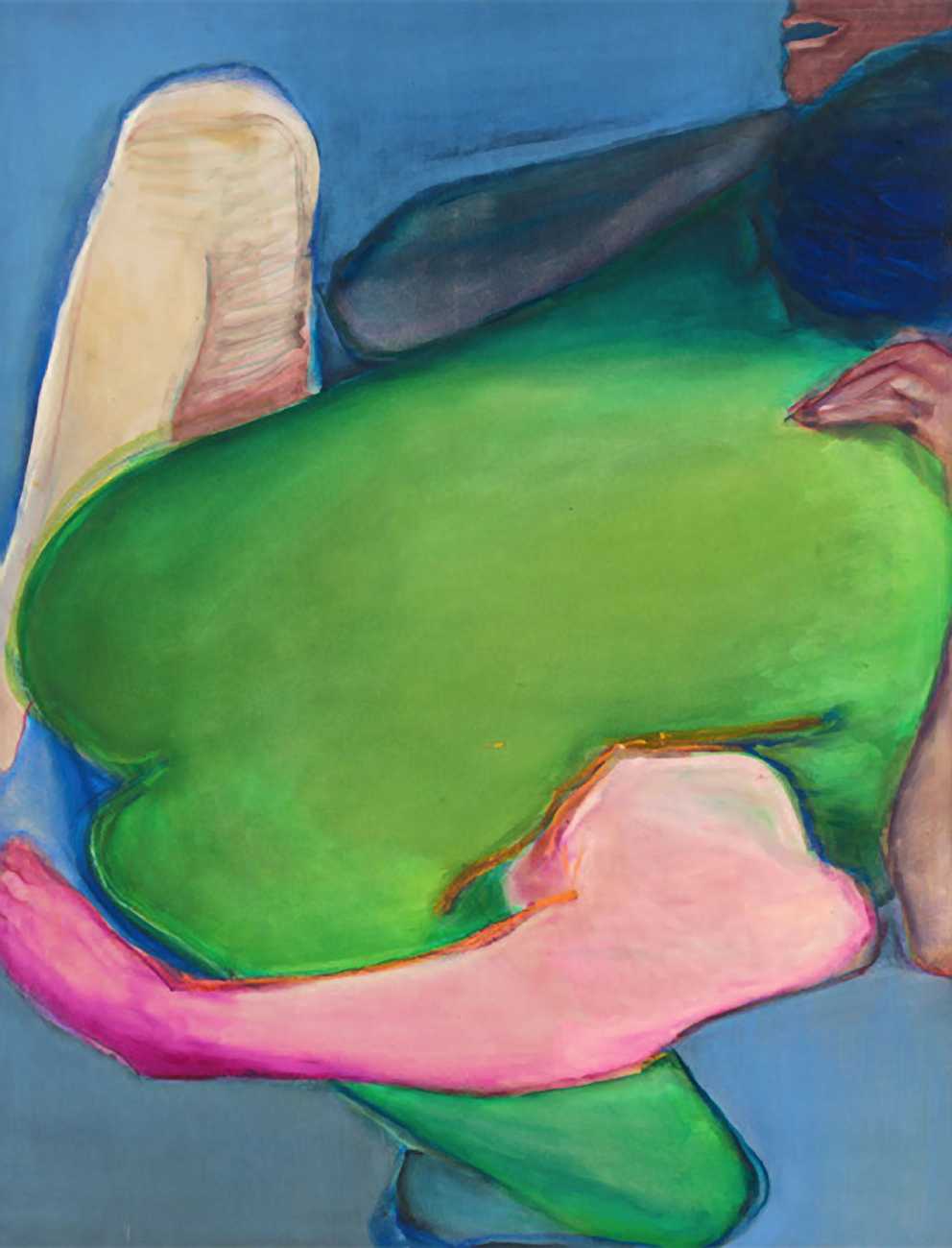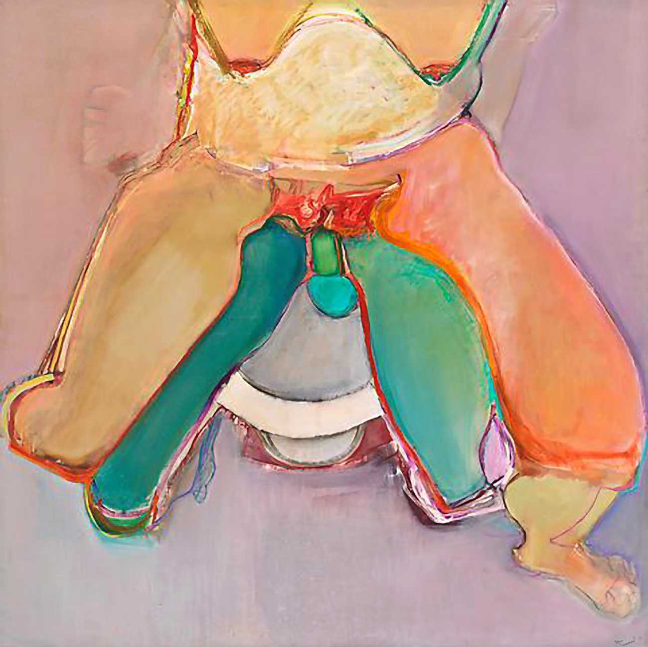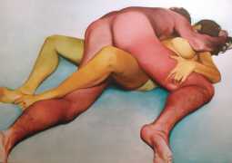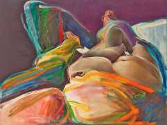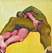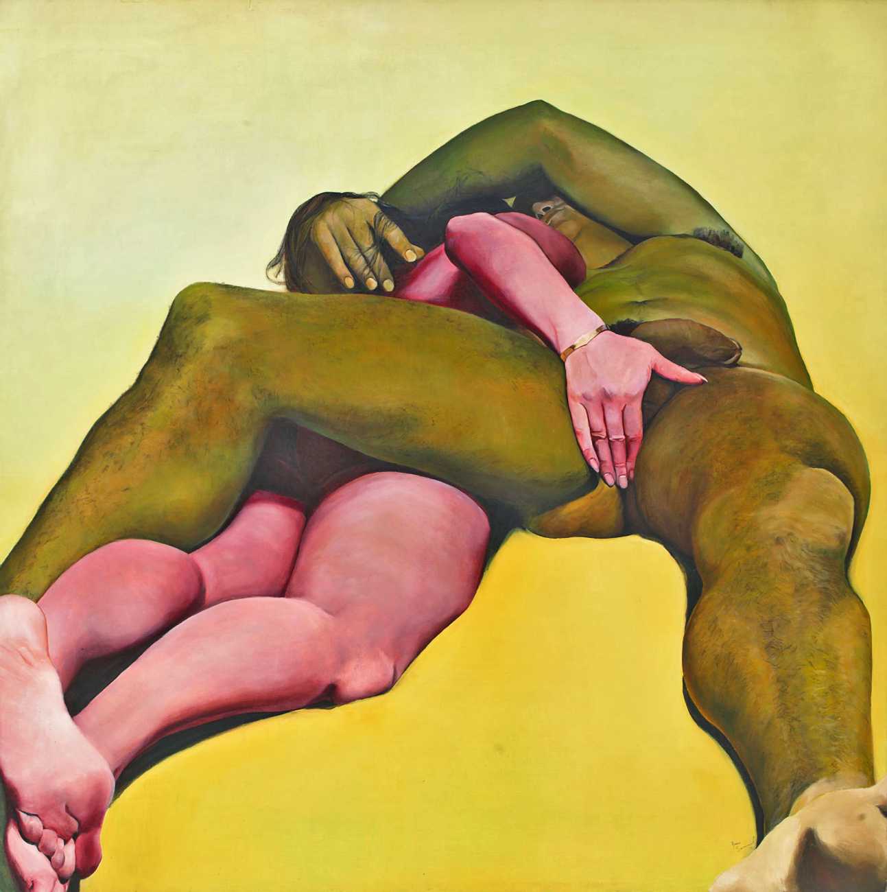 For the next eight years in Spain she painted in an abstract expressionist style, but felt sidelined in the genre since abstraction was the style of privileged white men. In 1970 she returned to New York and started working on her ‘sex paintings’, large-scale oils of people having sex. While their bodies were realistically rendered, they were painted in vivid colours of red, purple, yellow and green. Her 1972 ‘erotic series’ featured models sharing sex in her studio. Again the sexual scenes were realistic, but the unreal hues served as a reminder of her early years of painting abstract art.