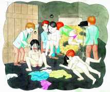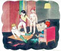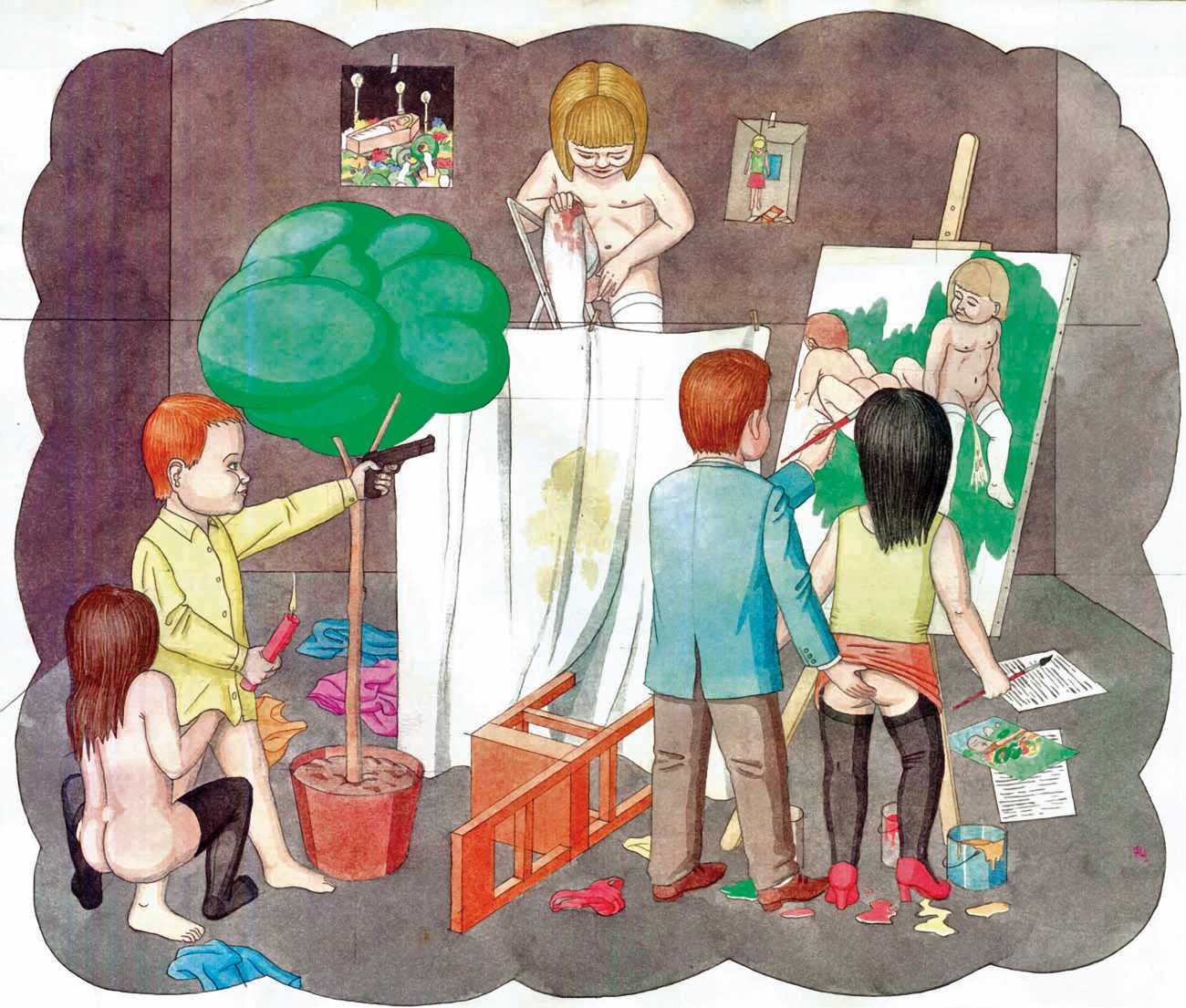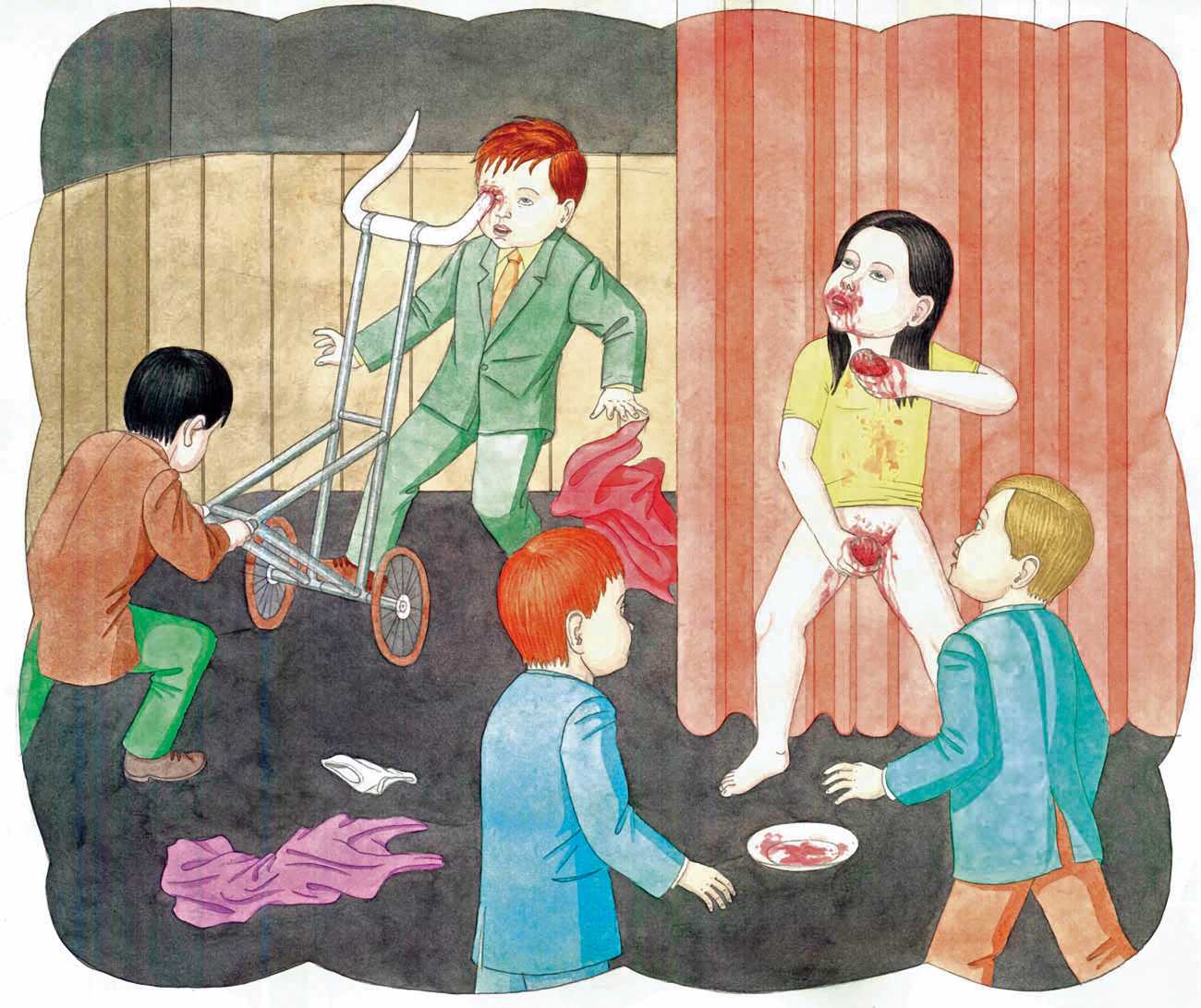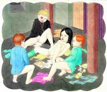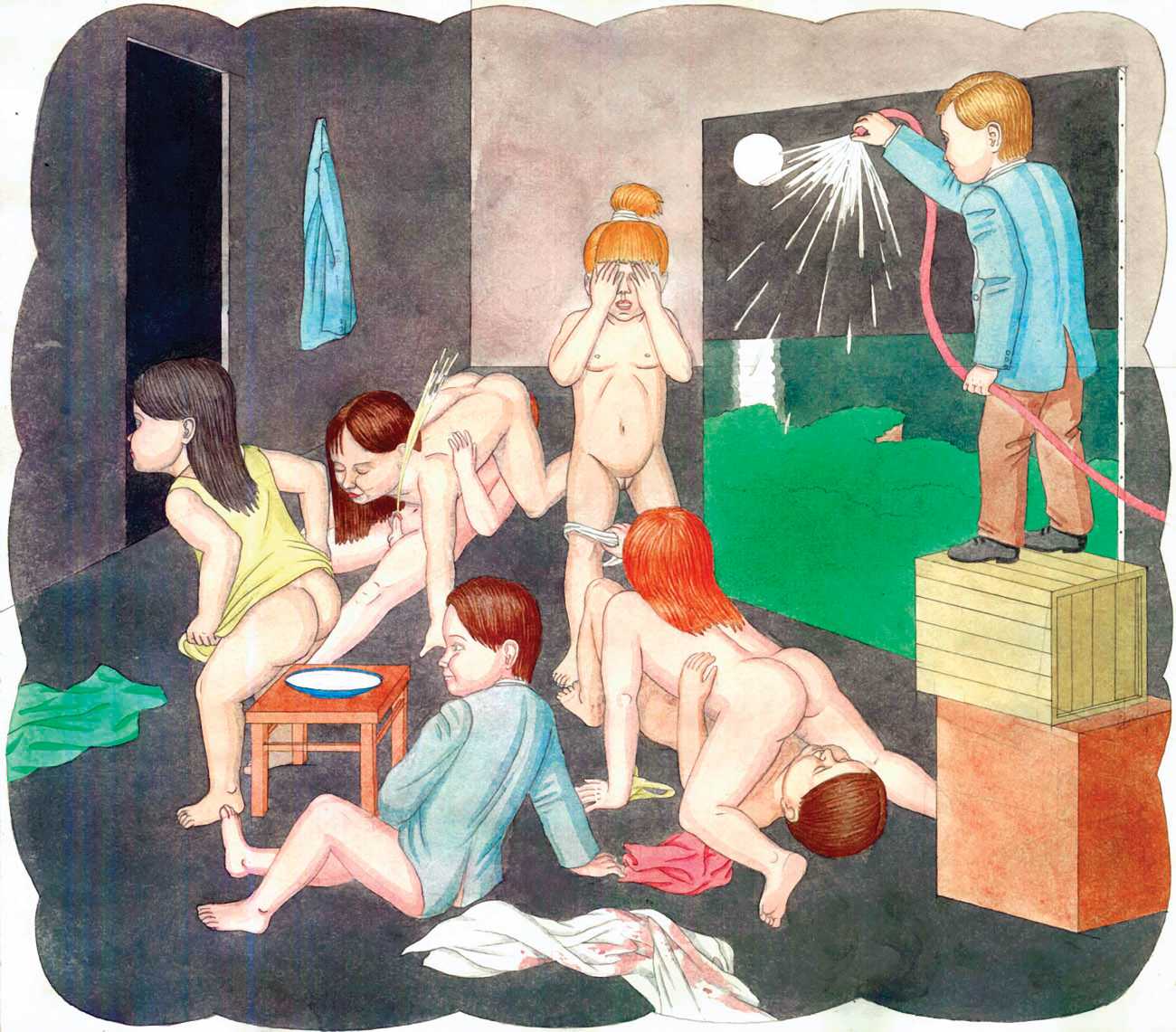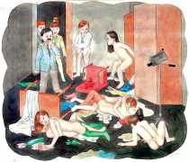 In Spehr’s colourful compositions the most diverse and chaotic group scenes are depicted, which often have neither a temporal nor a content-related context, but offer us experimental arrangements of people mixing together. What is this strange community that builds its living quarters under the earth? And what is that masked group fighting for? Are the children taking over power in this city of ruins? Spehr is an enthusiastic storyteller who tells of a world that has gone off the rails, confused and disturbed, a world in which we find important links to our own world, with all its ruptures, crises and incomprehensibility. In exaggerating different aspects of human behaviour, Spehr succeeds in sharpening and questioning our sense of our own hopes, fears and anxieties.