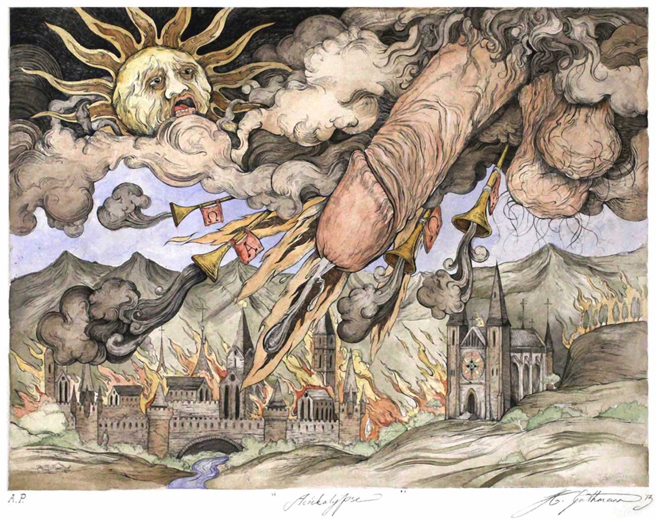 To live a life without a sense of humour would make for a pretty dull experience, and probably also one that’s pretty depressing given the way a lot of the world is these days. Usually I would keep my ‘serious’ work quite separate from the humorous stuff, although my recent series on the Book of Revelation is replete with giant phalluses, and they’re mostly instruments of wrath. It’s a funny thing to take something so serious as the cataclysmic end of the world and saturate it with grotesque genitalia. It was really quite satisfying.