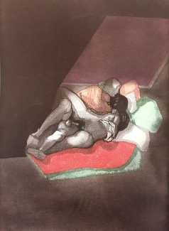 In the early 1960s Castillo moved to Barcelona, followed by a two-year sojourn in Paris. With a move to Geneva in 1966 he had the opportunity to work with printed graphics, and his work in Geneva was interrupted by long summer sojourns to Boissano on the Ligurian coast. His most important etching sequences such as ‘El Mundo de Frederico García Lorca’ (1972) and ‘Grands Amants’ (1973) were produced during the subsequent years. After an incident with an American nuclear bomb above the Spanish village of Palomares, the artist was inspired to produce a monumental triptych composition, which brought him international recognition. Since the early 1980s Castillo has lived in New York.