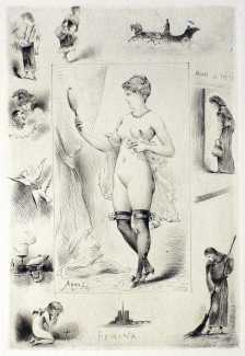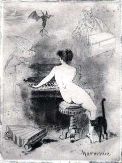 His most popular suites of engravings were tinged with a macabre eroticism, including images of witches, vampires and death masks. He was also a good painter, but unfortunately many of his best canvases depicting scenes of family life were destroyed by him just before he died, quite probably because it would have made clear that his household consisted of his first cousin Clarisse Camus and their three children.