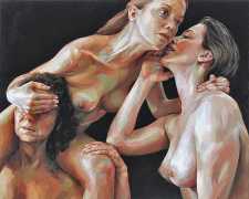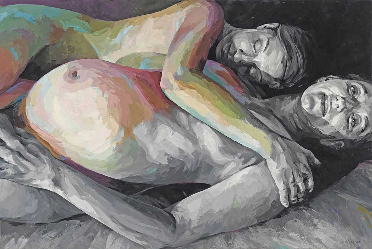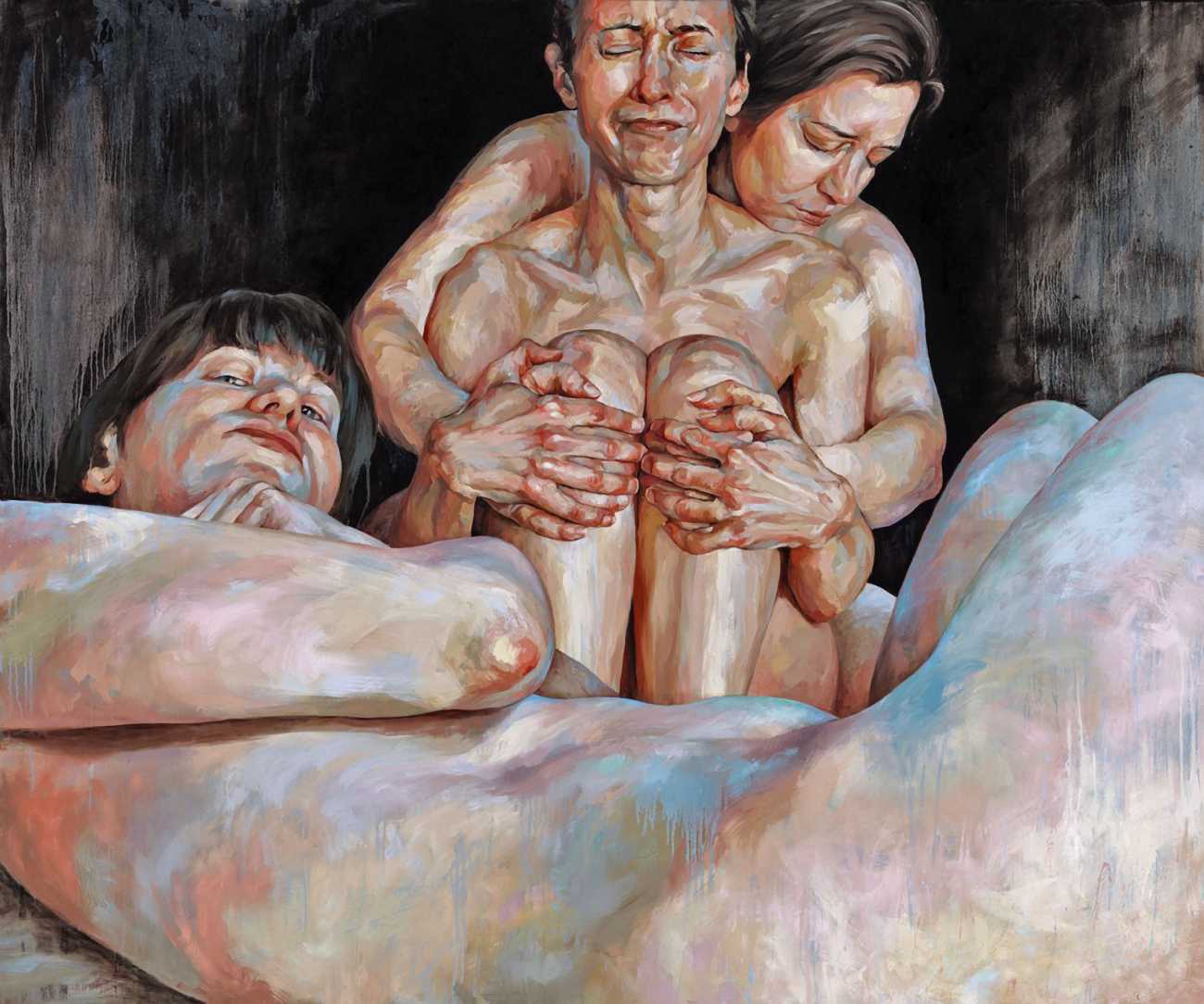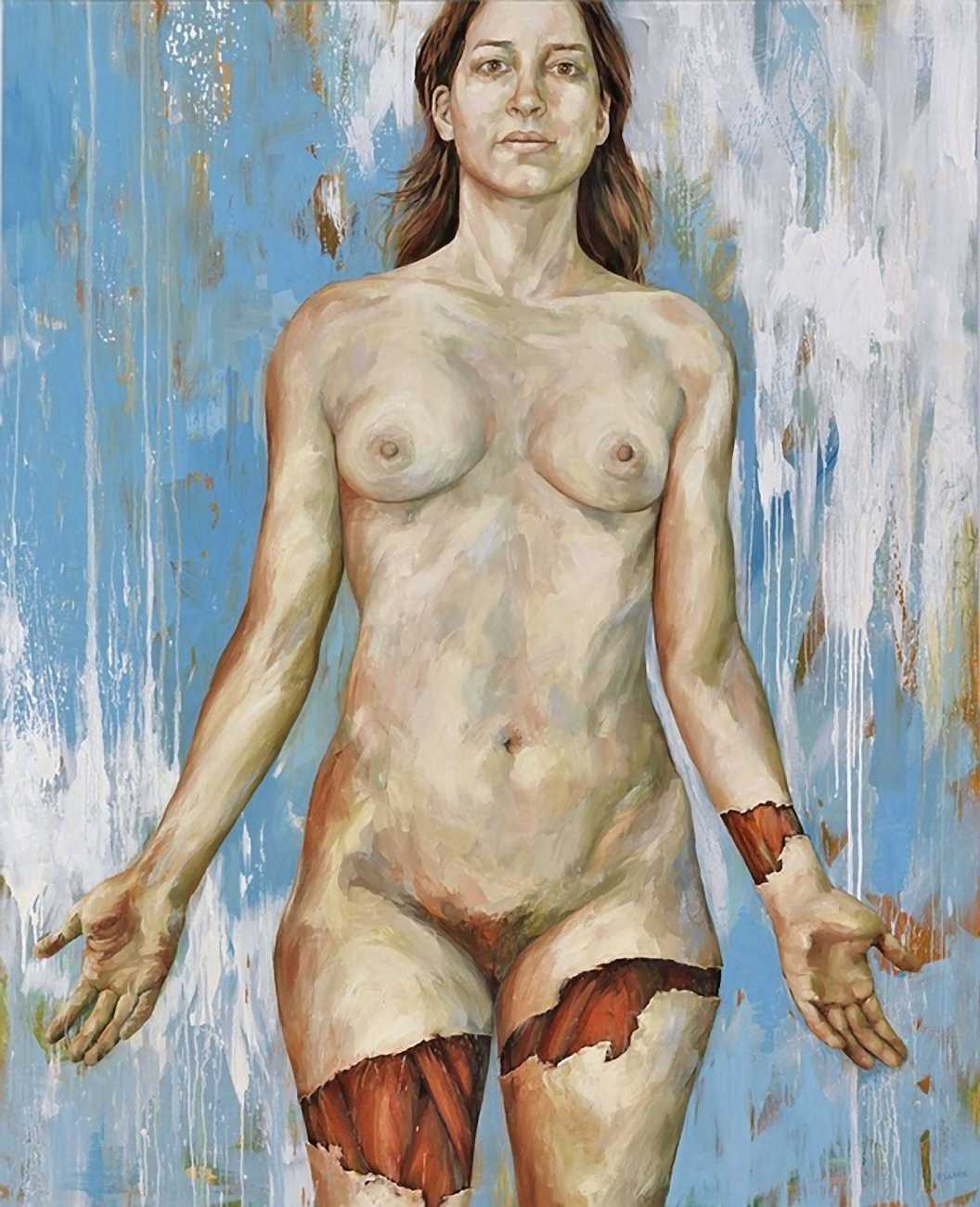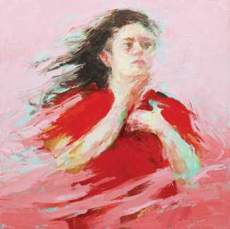 She writes of her work, ‘In our current political climate of amplified voices and vehement certainties of belief, I explore what happens when things aren’t so definite. My paintings blur the definitions of figures and landscapes. Trees and mountains scream, dissolving into creatures, churning with inner turmoil. Figures branch into abstracted scenery and spaces. I begin a painting with a specific reference, but once the image is initially laid in I cease looking at it. Instead, I engage in dialogue with the painting, letting it lead me to unknown places. I throw myself into the work with abandon, covering up or breaking apart surfaces I have just created. In becoming willing to destroy my work, I allow for something entirely new to emerge. My use of thick impasto paint, gouges, intense colour, and expressive brushwork all contribute to obscuring the specific features of my subject while revealing previously hidden emotional qualities. For me, it is in these emotions where the truth lies.’