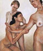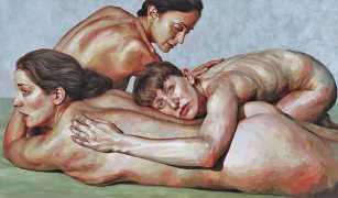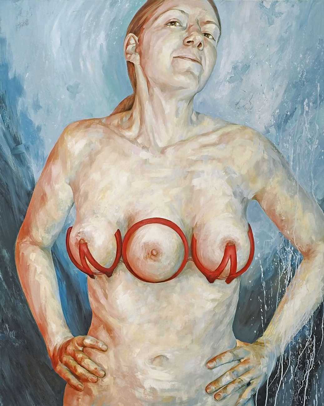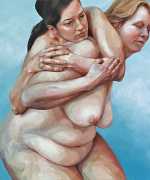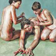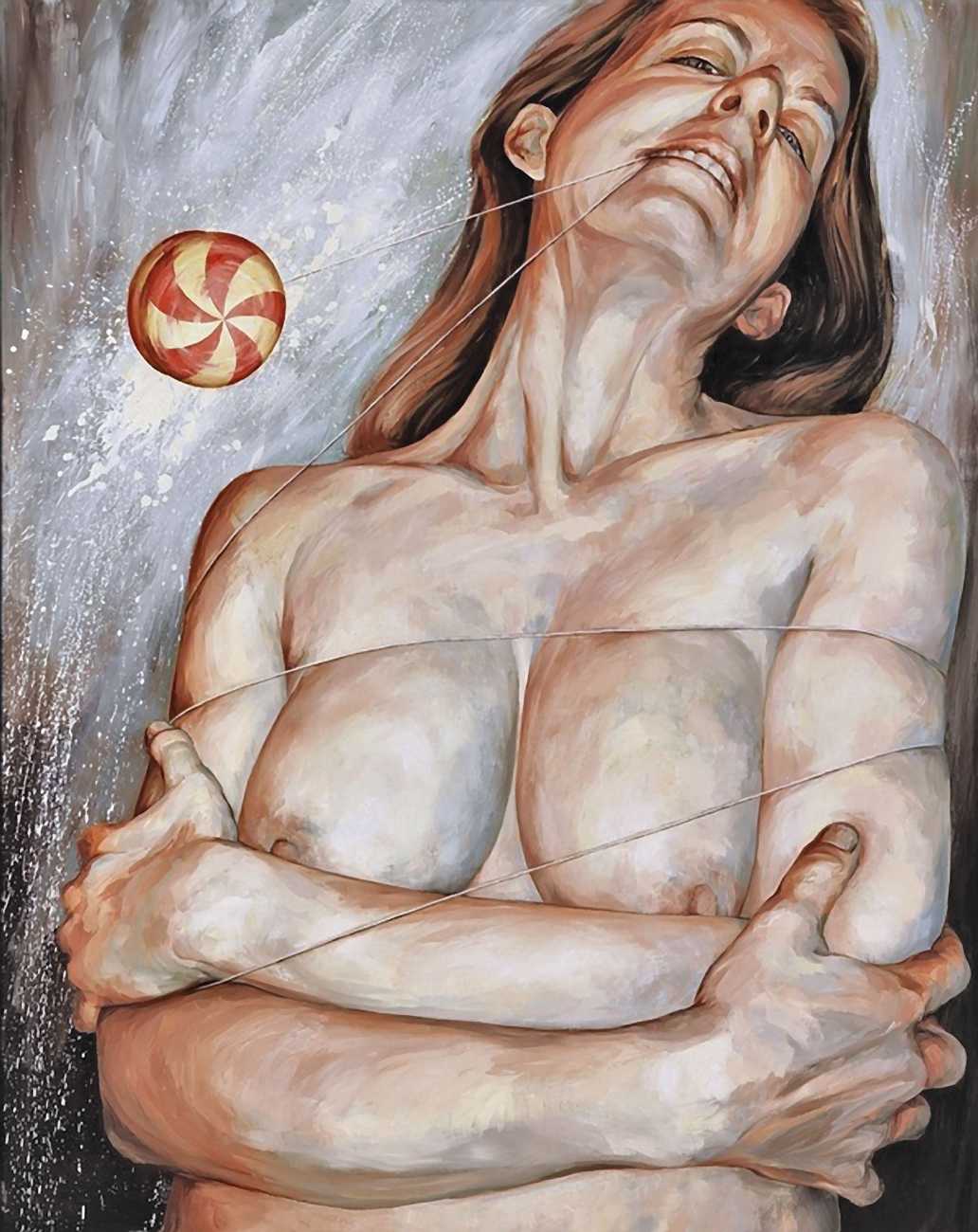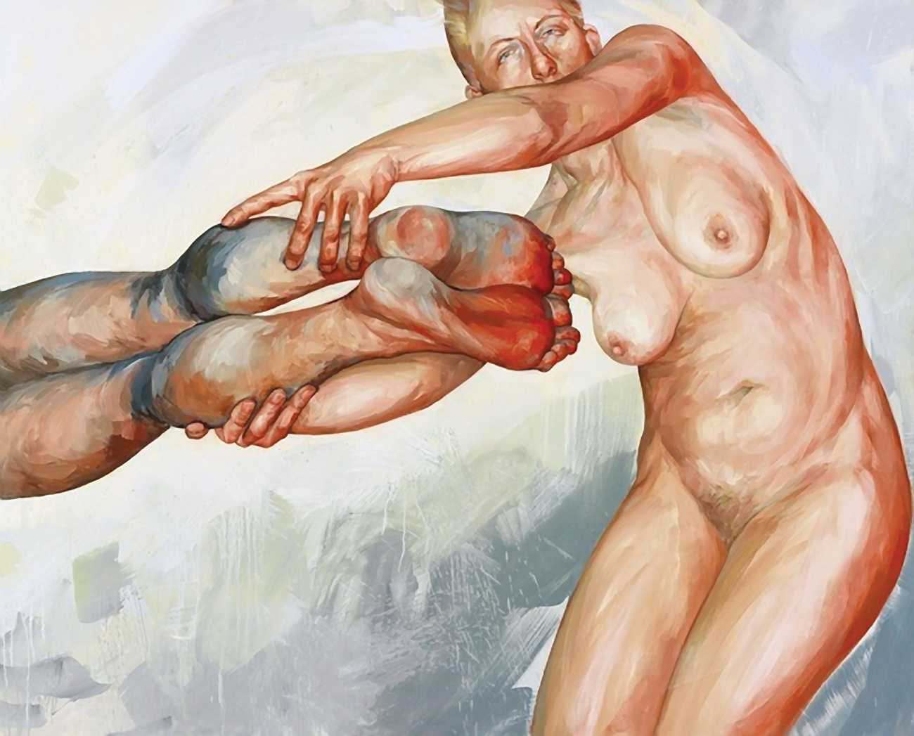 She writes of her work, ‘In our current political climate of amplified voices and vehement certainties of belief, I explore what happens when things aren’t so definite. My paintings blur the definitions of figures and landscapes. Trees and mountains scream, dissolving into creatures, churning with inner turmoil. Figures branch into abstracted scenery and spaces. I begin a painting with a specific reference, but once the image is initially laid in I cease looking at it. Instead, I engage in dialogue with the painting, letting it lead me to unknown places. I throw myself into the work with abandon, covering up or breaking apart surfaces I have just created. In becoming willing to destroy my work, I allow for something entirely new to emerge. My use of thick impasto paint, gouges, intense colour, and expressive brushwork all contribute to obscuring the specific features of my subject while revealing previously hidden emotional qualities. For me, it is in these emotions where the truth lies.’