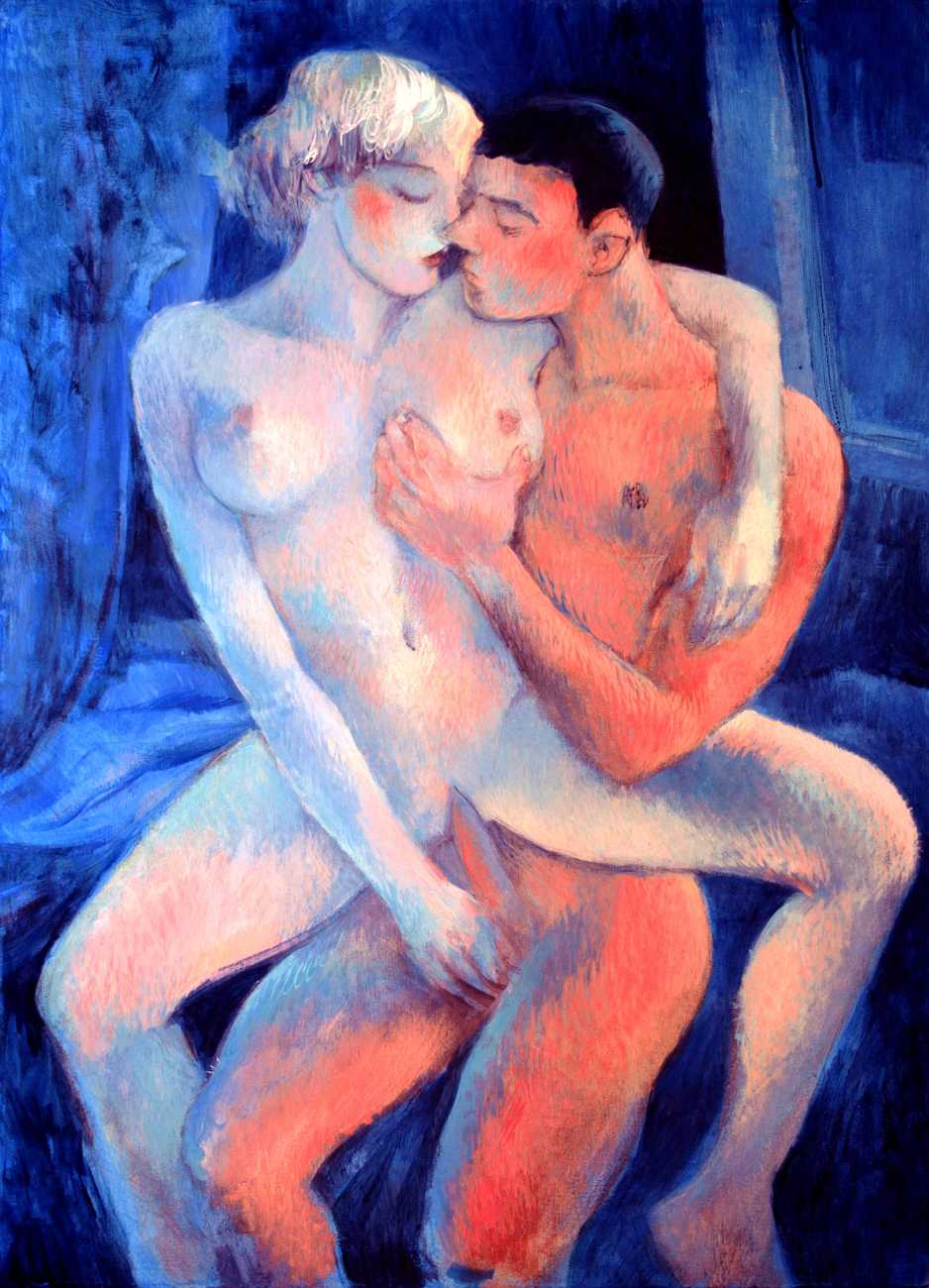 As an openly queer trans painter, Lewandowski has succeeded in creating a body of work in which naked lovers of every gender intertwine and embrace one another in an intimate encounter of shared desire. An ex-girlfriend, a trans woman, was his long-time muse, and it is clear that many of the faces in his colourful paintings are indeed variations of the same person, a beautiful woman with just the slightest hint of a male past.