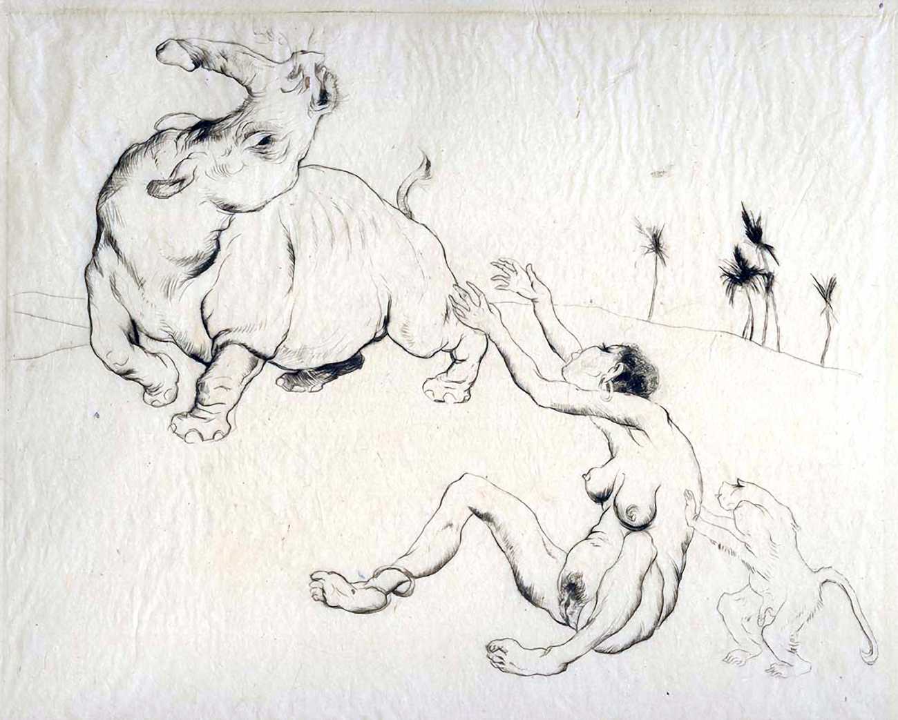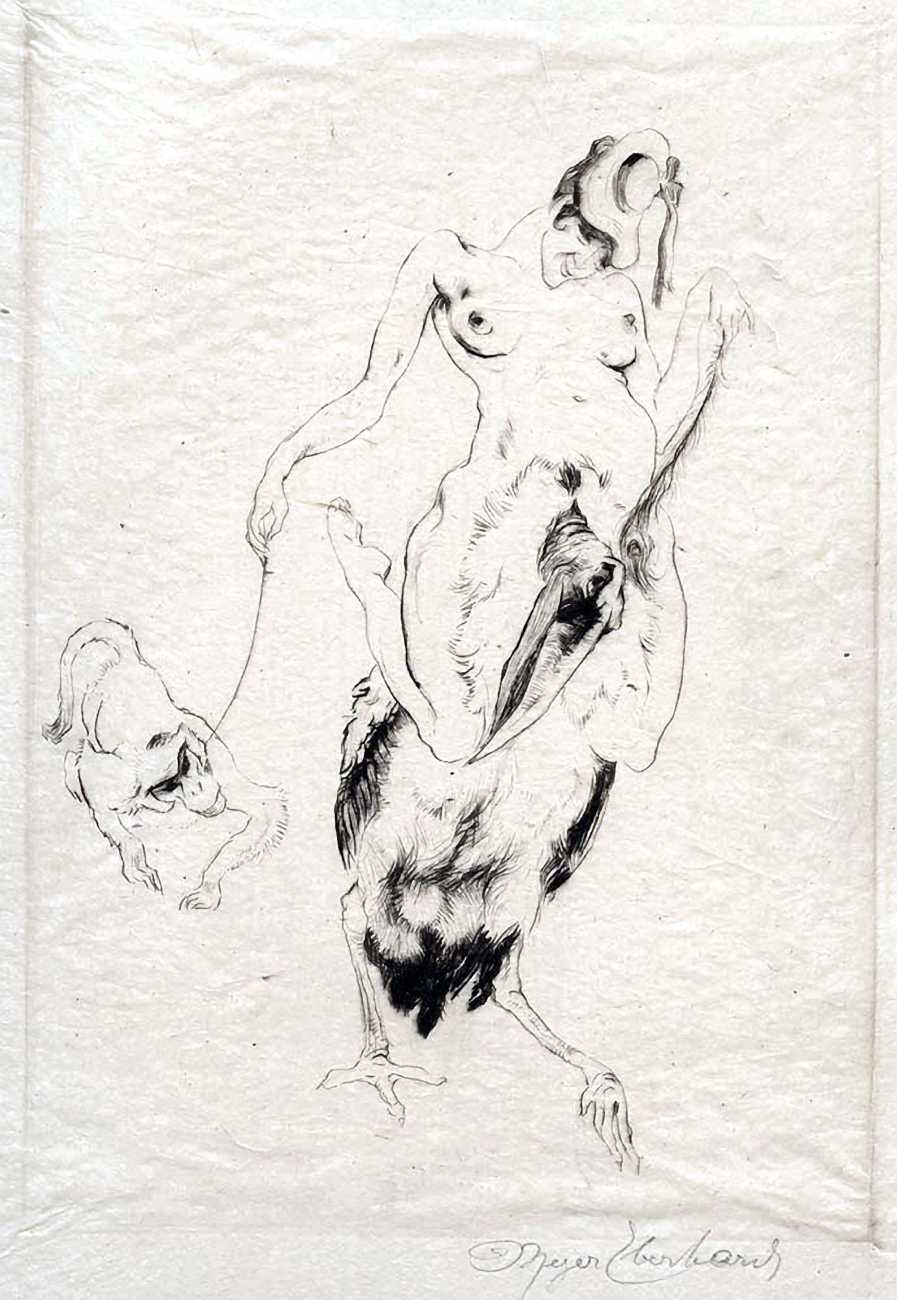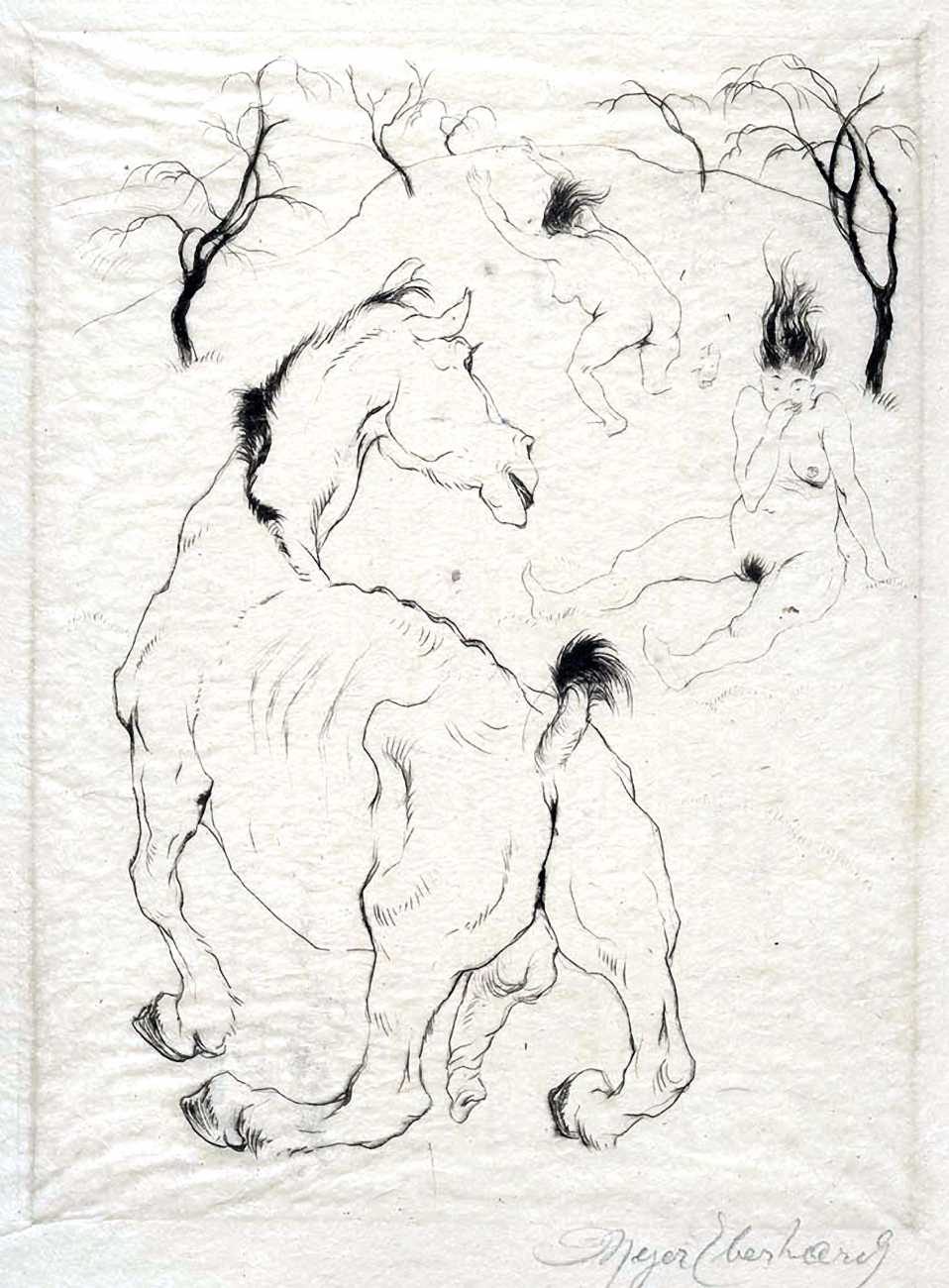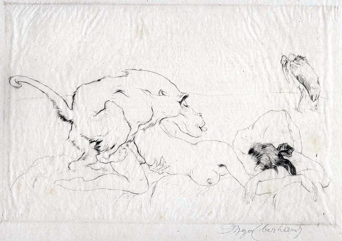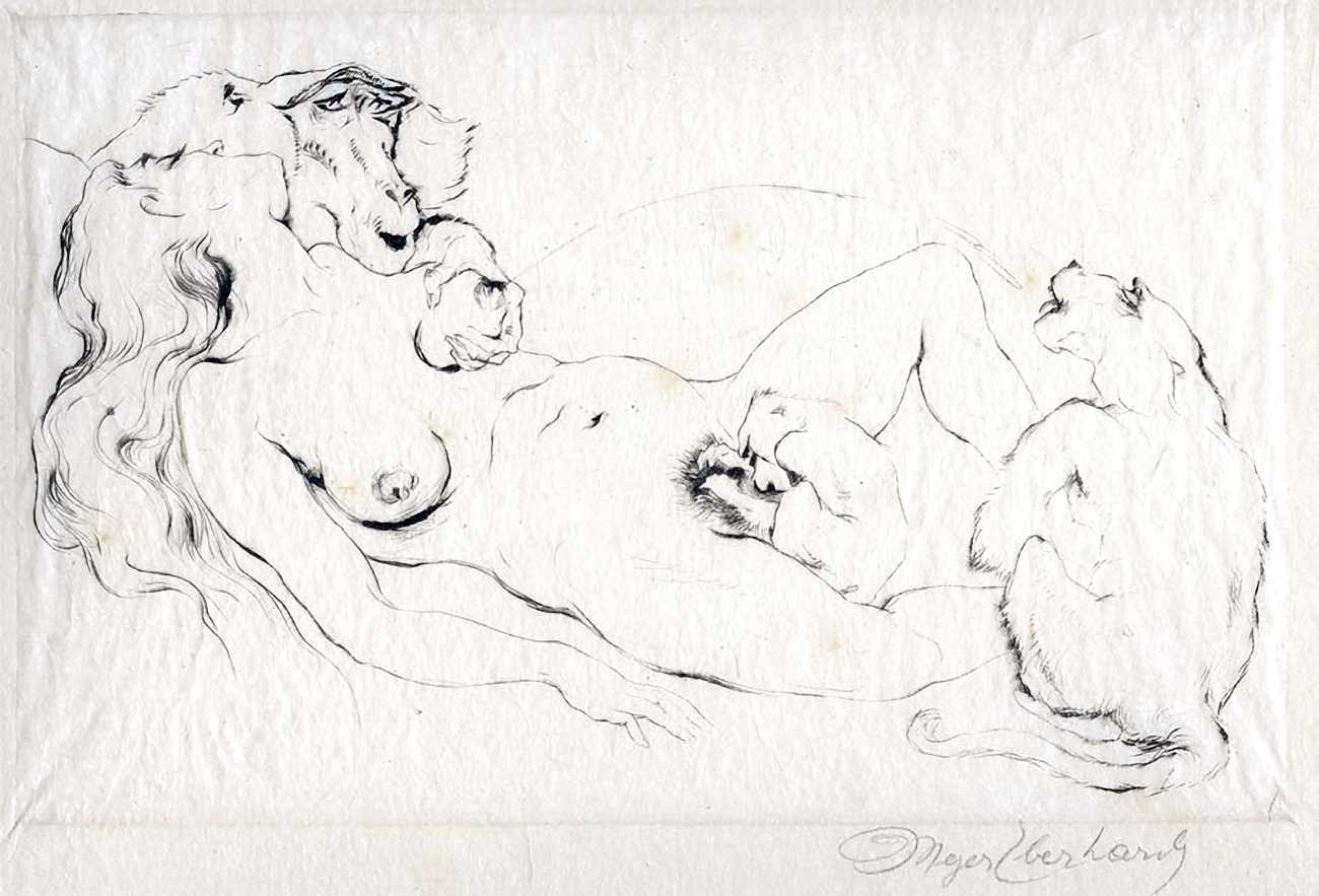 For a few years Meyer-Eberhardt experimented with different styles and media, including Expressionism and Cubism, but he was most comfortable with drypoint etchings of animals, which unsurprisingly found a ready market, so from the early 1920s he concentrated on naturalistic art, mostly drypoints but with some oil paintings. He regularly worked on commissions for animal portraits and hunting scenes.