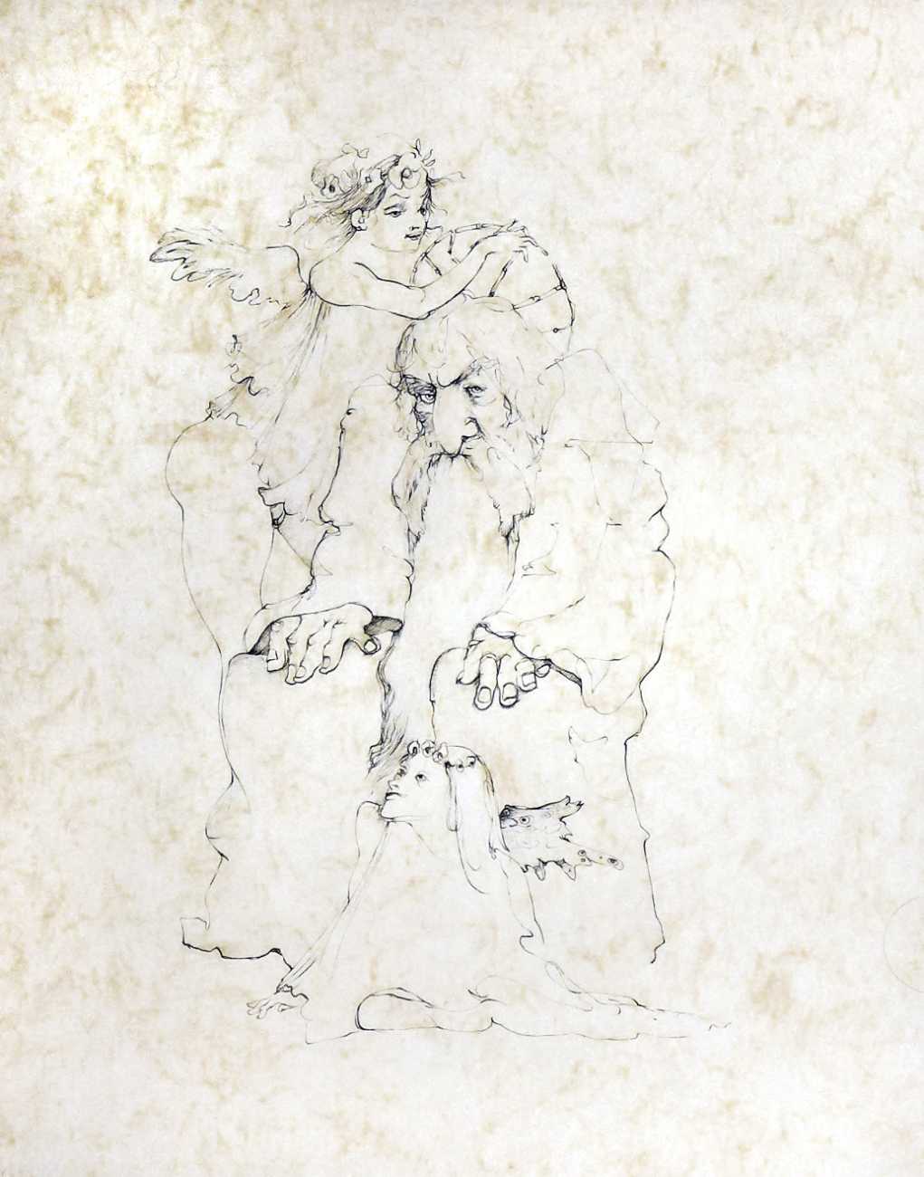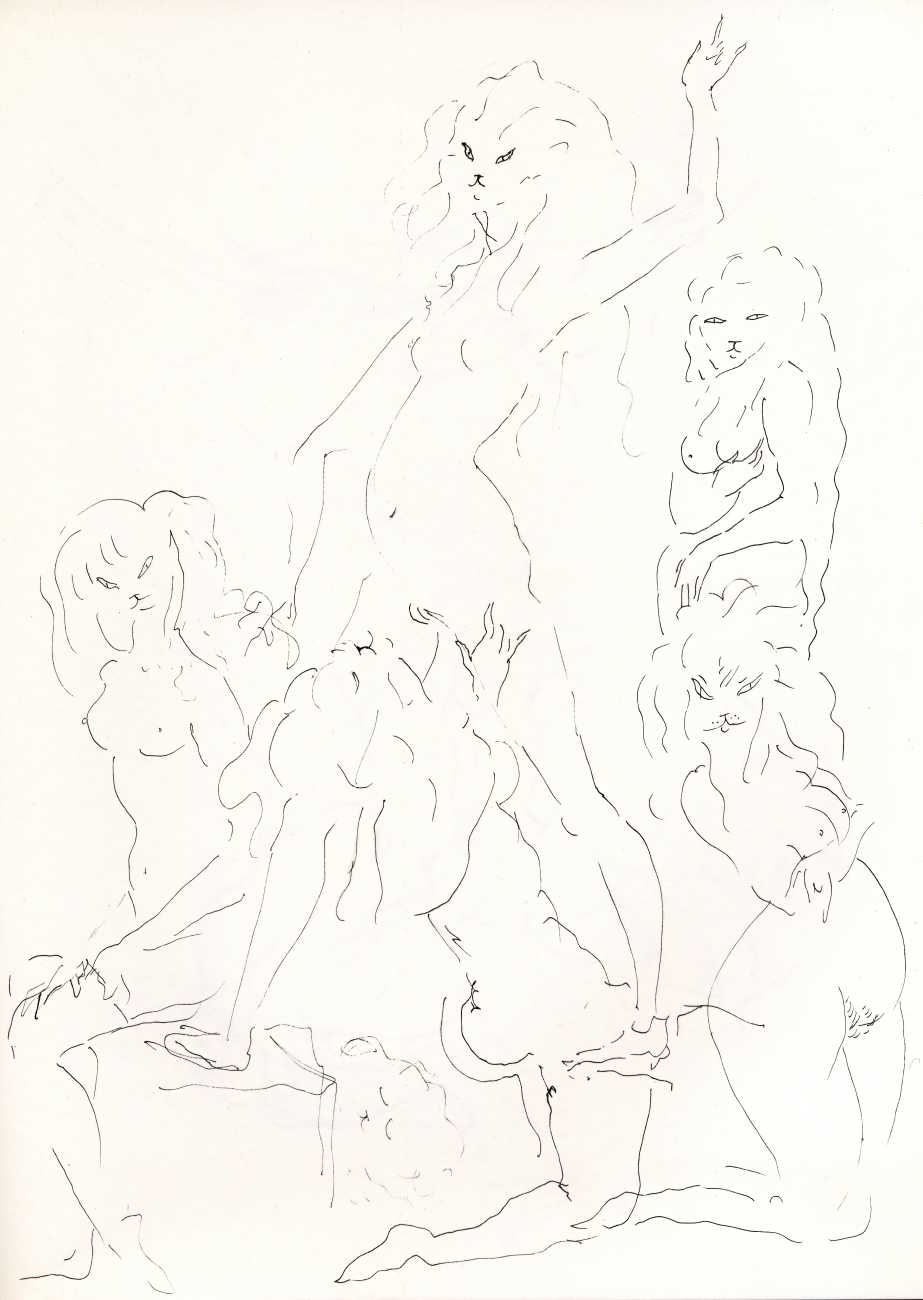 A predominant theme of Leonor Fini’s art is the complex relationship between the sexes, primarily the interplay between the dominant female and the passive, androgynous male. In many of her most powerful paintings, the female takes the form of a sphinx, often with the face of the artist. Complex intimate relationships were also a feature of her personal life. As she wrote of herself, ‘Marriage never appealed to me, and I’ve never lived with just one person. Since I was eighteen I’ve always preferred to live in a sort of community, a big house with my atelier and cats and friends, one a man who was rather a lover and another who was rather a friend. And it has always worked.’ In fact she was married, for a few months in 1938, to Fedrico Veneziani, but he was soon replaced by more permanent intimates, by far the two most important being Italian count Stanislao Lepri, who abandoned his diplomatic career shortly after meeting Fini, and the Polish writer Konstanty Jeleński, known as Kot, who Leonor was delighted to discover was the illegitimate half-brother of Sforzino Sforza, one of her favourite lovers. Kot joined Fini and Lepri in their Paris apartment in October 1952 and the three remained inseparable until their deaths. And then there were the cats, mostly Persian and at their height twenty-three in number; they often shared her bed and her dining table.