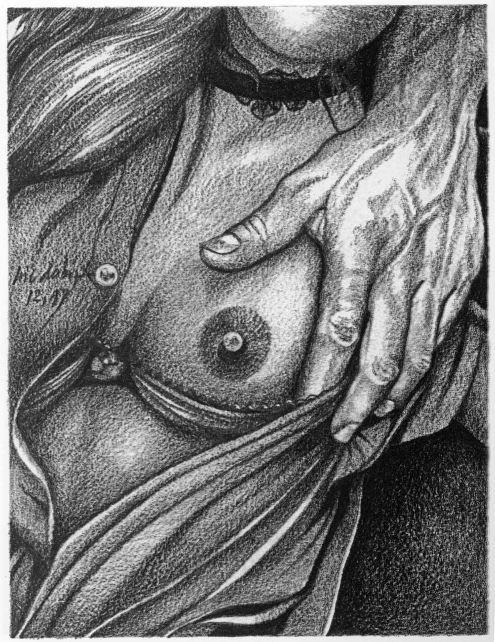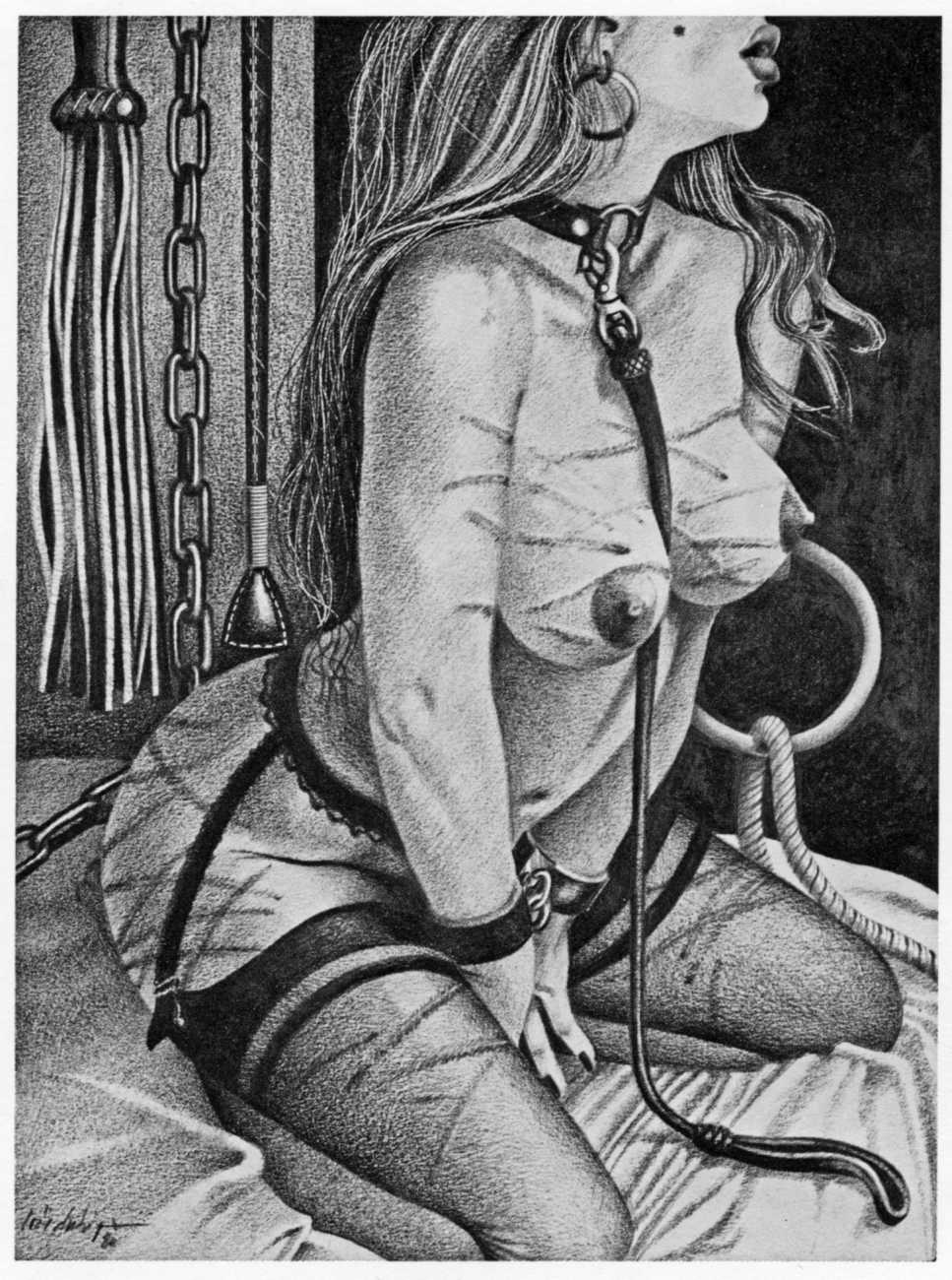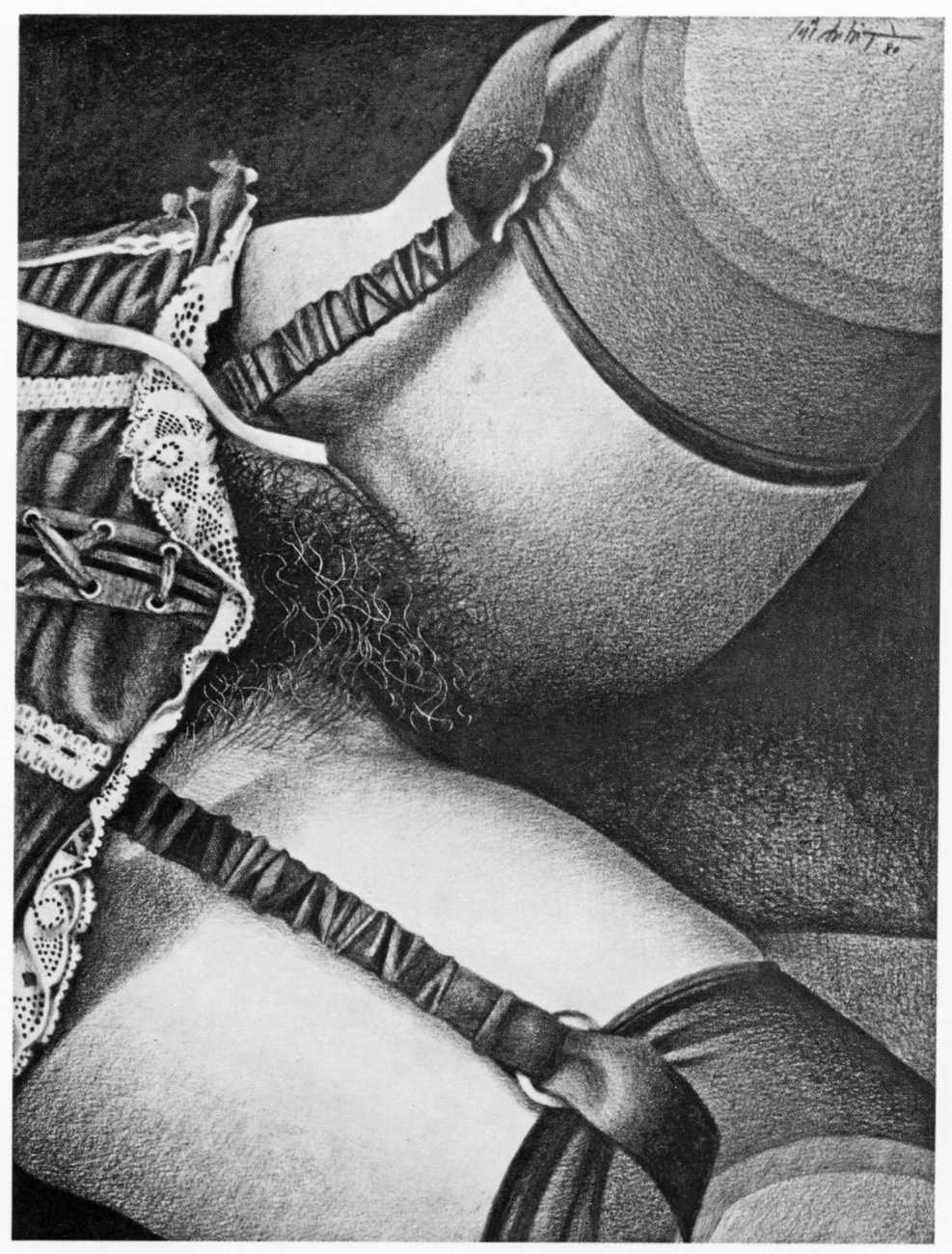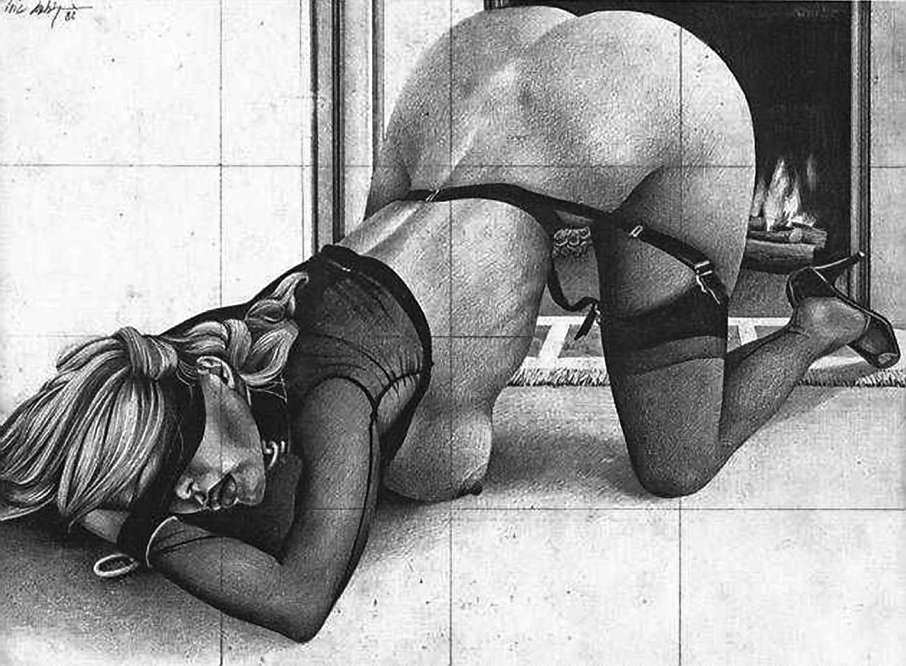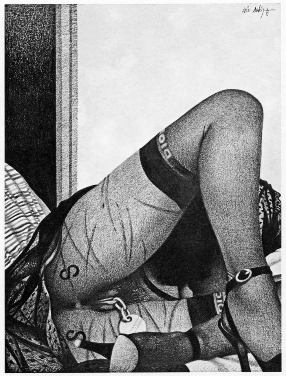 In the late 1970s, Loïc Dubigeon started to draw naked figures from life, first in charcoal and later in soft pencil. An acute observer of detail, composition, and the interplay of light and darkness, he used his architectural skills to create drawings of the human body which set him apart from most artists. In 1979 he exhibited some of his nudes alongside other works at an exhibition in Munich, which attracted the attention of the publisher Editions Borderie, who commissioned a series of illustrations inspired by Pauline Réage’s novel Histoire d’O.