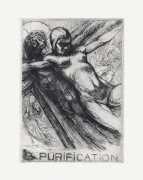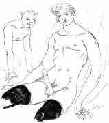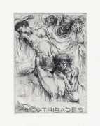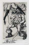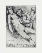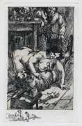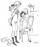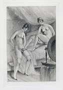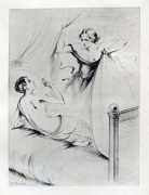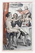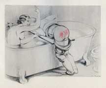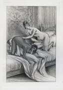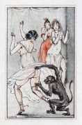 Luc Lafnet started producing book illustrations in the early 1920s, in a style clearly influenced by Heironymus Bosch and Martin van der Maele, often with grotesque and risqué comic elements. By 1927 he had been discovered by several well-known Parisian erotic publishers, including Georges Briffaut, Jean Fort and Maurice Duflou, but carefully distanced himself from immediate recognition by using a variety of pseudonyms, including ‘Jim Black’, ‘Viset’, ‘O. Lucas’, ‘Pol’, ‘Grim’, and ‘Luc’. His ability to produce quality work quickly was conducive to his success and popularity, and by the early 1930s he was producing engravings, paintings and comic strips in a flurry of creativity. As with his pioneering comic strip work, where he worked with Blanche Demoulin and Robert Velter to develop characters like the well-known Spirou, Lafnet’s erotic work was mostly known only to the select audience who recognised and valued his imaginative work. By the time he produced the illustrations to Lettres à la présidente, Zoloé et ses deux acolytes, and Les stations de l’amour, his unique erotic style was fully-formed. The fact that he was not averse to illustrating BDSM classics like Dresseuses d’hommes, Les geôles de dentelles and L’école des biches only added to his popularity in appreciative Parisian circles.
