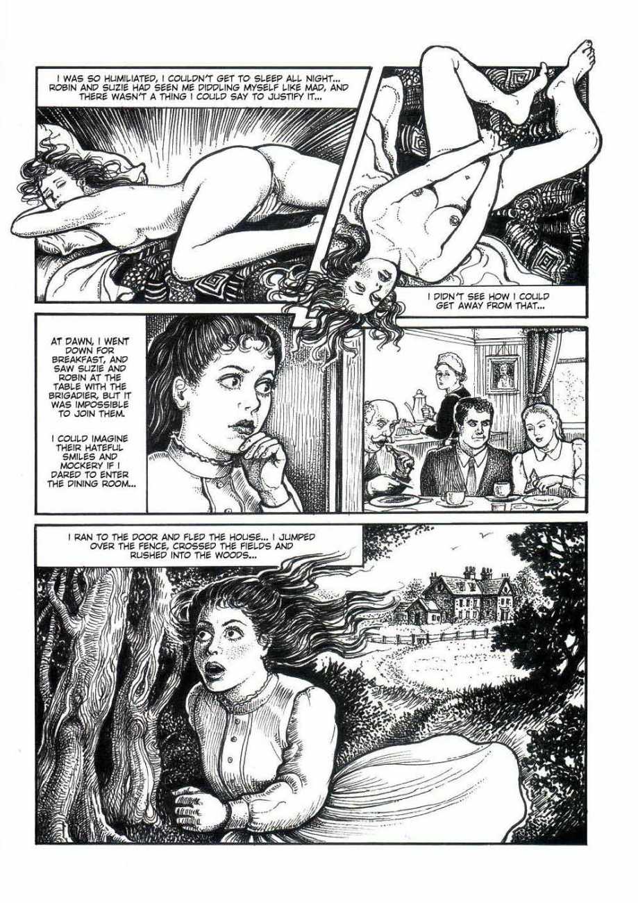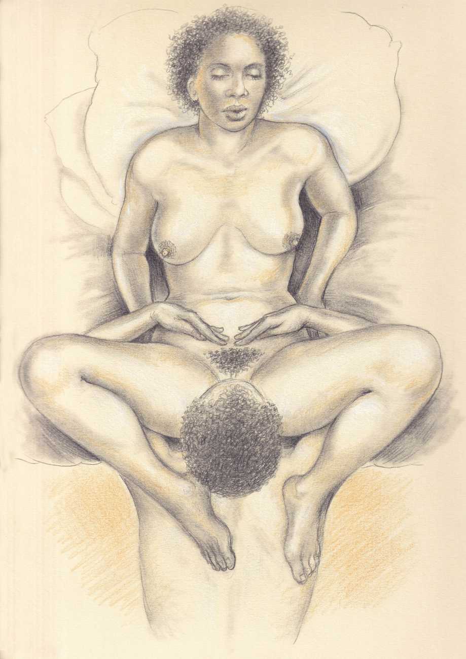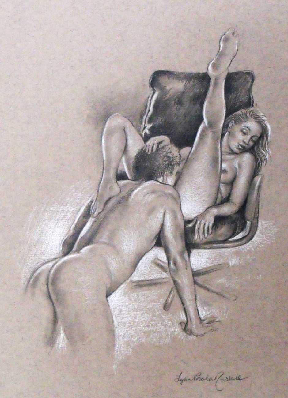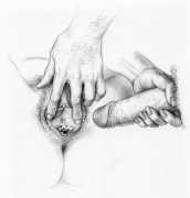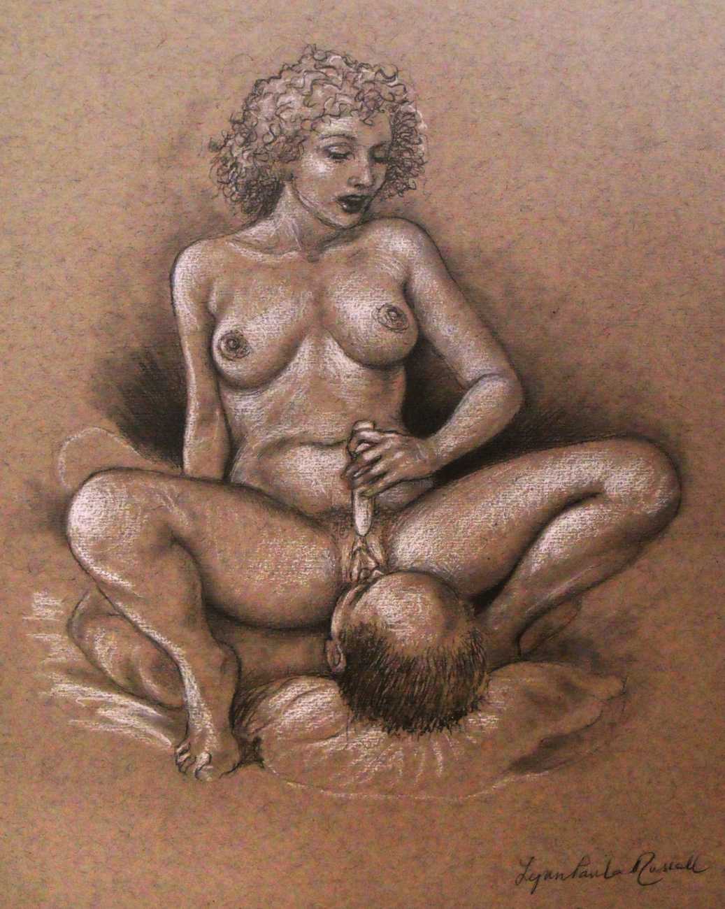 Russell’s drawing style is realistic, carefully-drawn detailed drawings in pencil and ink. In her coloured works she uses crayons and occasionally pastels, as in a series of fantastic body landscapes (‘bodyscapes’), probably her most ambitious works, in which female bodies are seen as part of landscapes. In her drawings she often appears as self-portraits, and some of her picture stories have an autobiographical background. In How I discovered CP she describes how she first encountered the world of the BDSM in the style of The Story of O, and a similar scenario appears in Sophisticated Ladies.