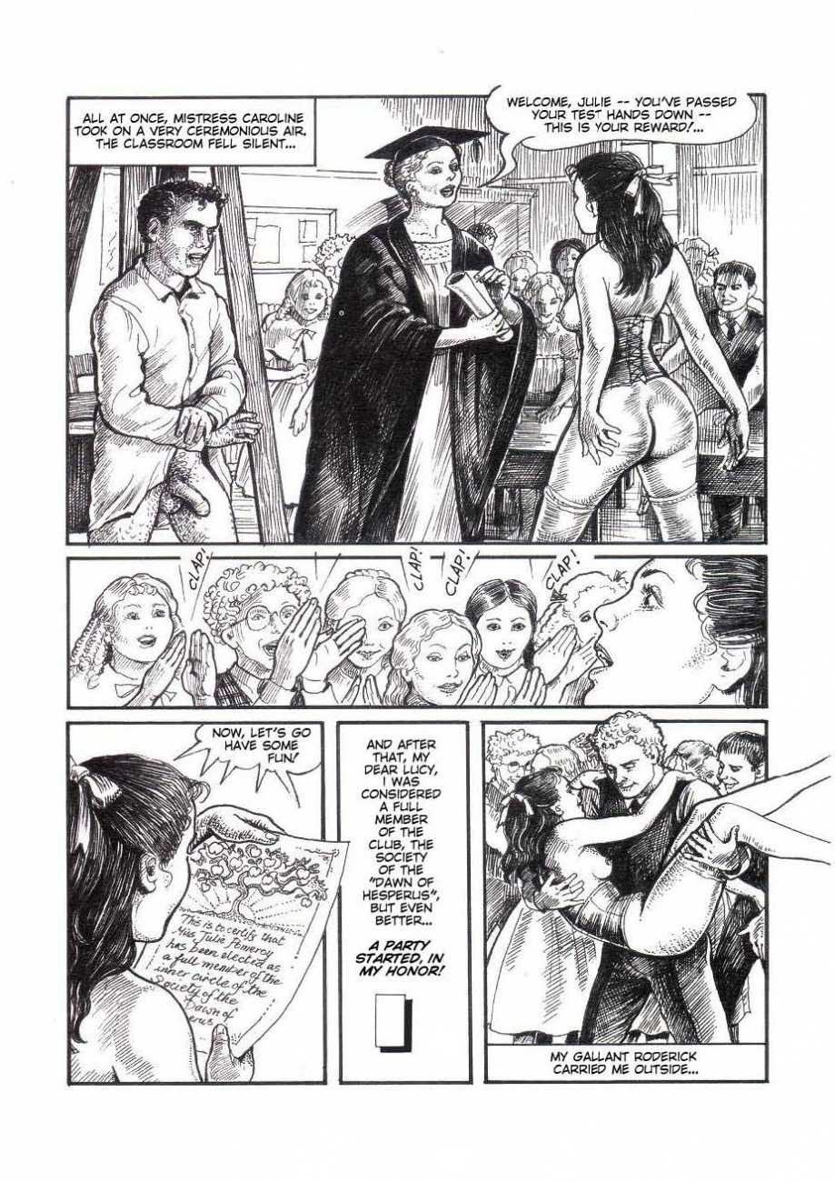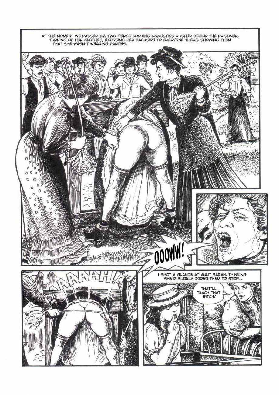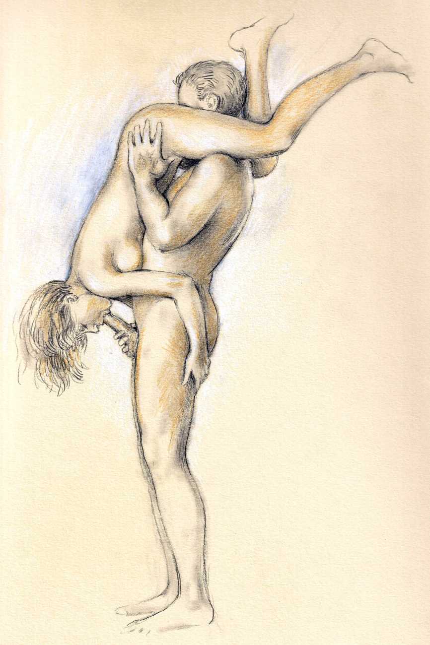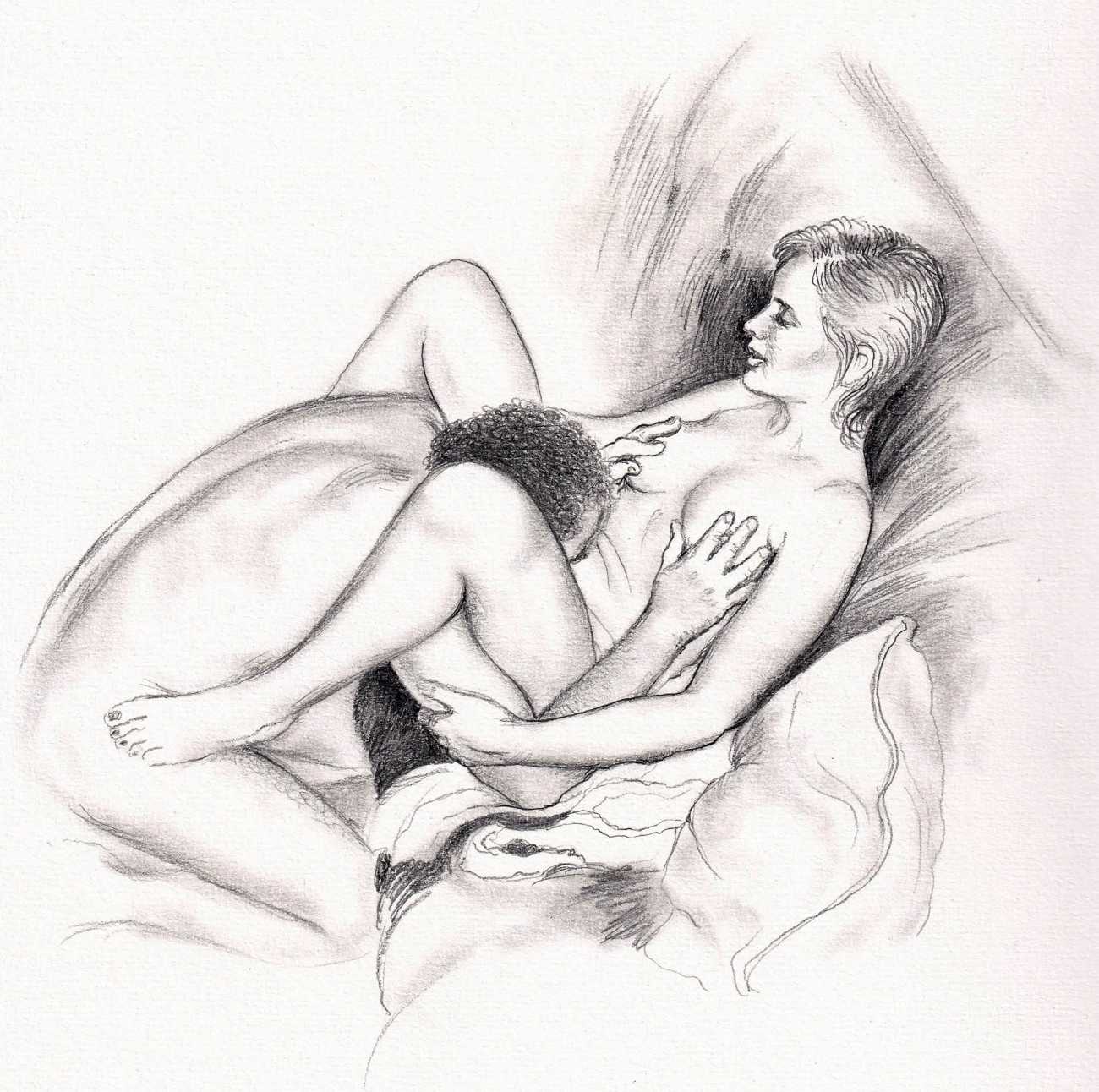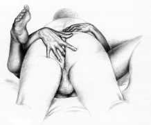 Russell’s drawing style is realistic, carefully-drawn detailed drawings in pencil and ink. In her coloured works she uses crayons and occasionally pastels, as in a series of fantastic body landscapes (‘bodyscapes’), probably her most ambitious works, in which female bodies are seen as part of landscapes. In her drawings she often appears as self-portraits, and some of her picture stories have an autobiographical background. In How I discovered CP she describes how she first encountered the world of the BDSM in the style of The Story of O, and a similar scenario appears in Sophisticated Ladies.
