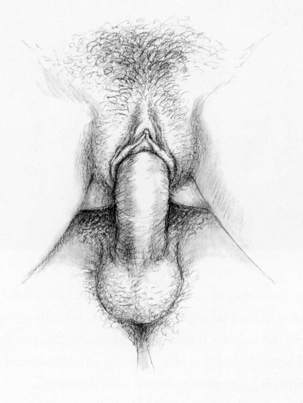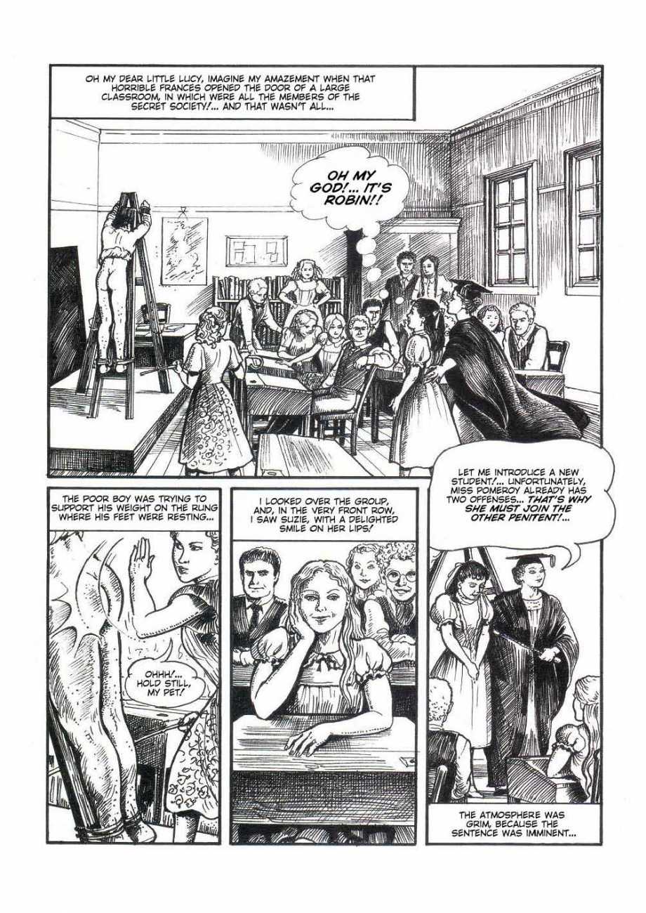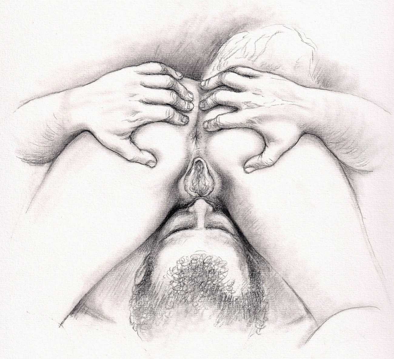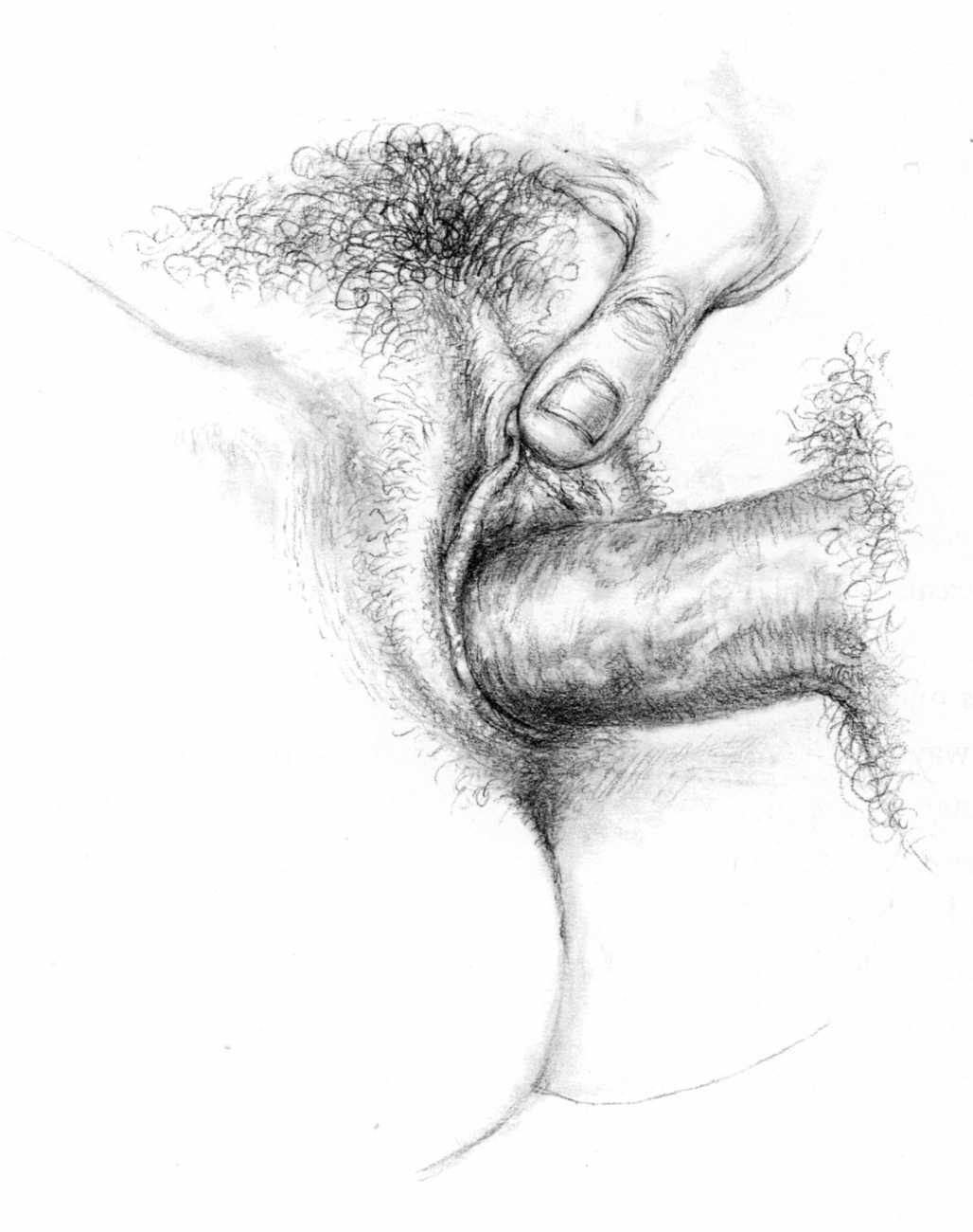 Russell’s drawing style is realistic, carefully-drawn detailed drawings in pencil and ink. In her coloured works she uses crayons and occasionally pastels, as in a series of fantastic body landscapes (‘bodyscapes’), probably her most ambitious works, in which female bodies are seen as part of landscapes. In her drawings she often appears as self-portraits, and some of her picture stories have an autobiographical background. In How I discovered CP she describes how she first encountered the world of the BDSM in the style of The Story of O, and a similar scenario appears in Sophisticated Ladies.