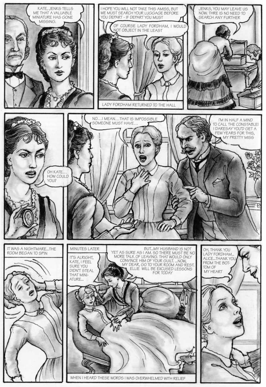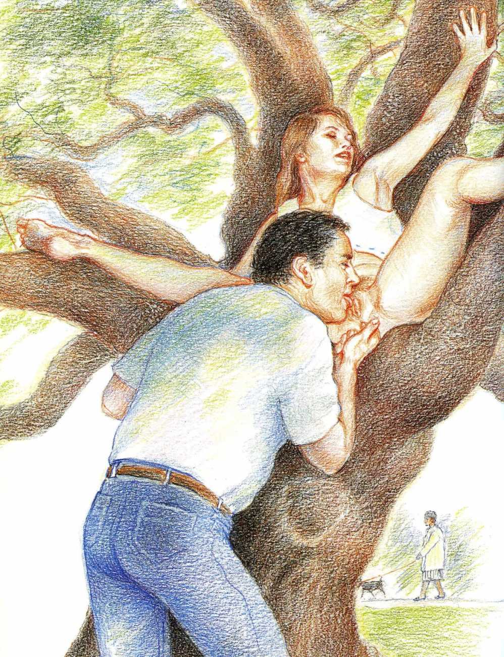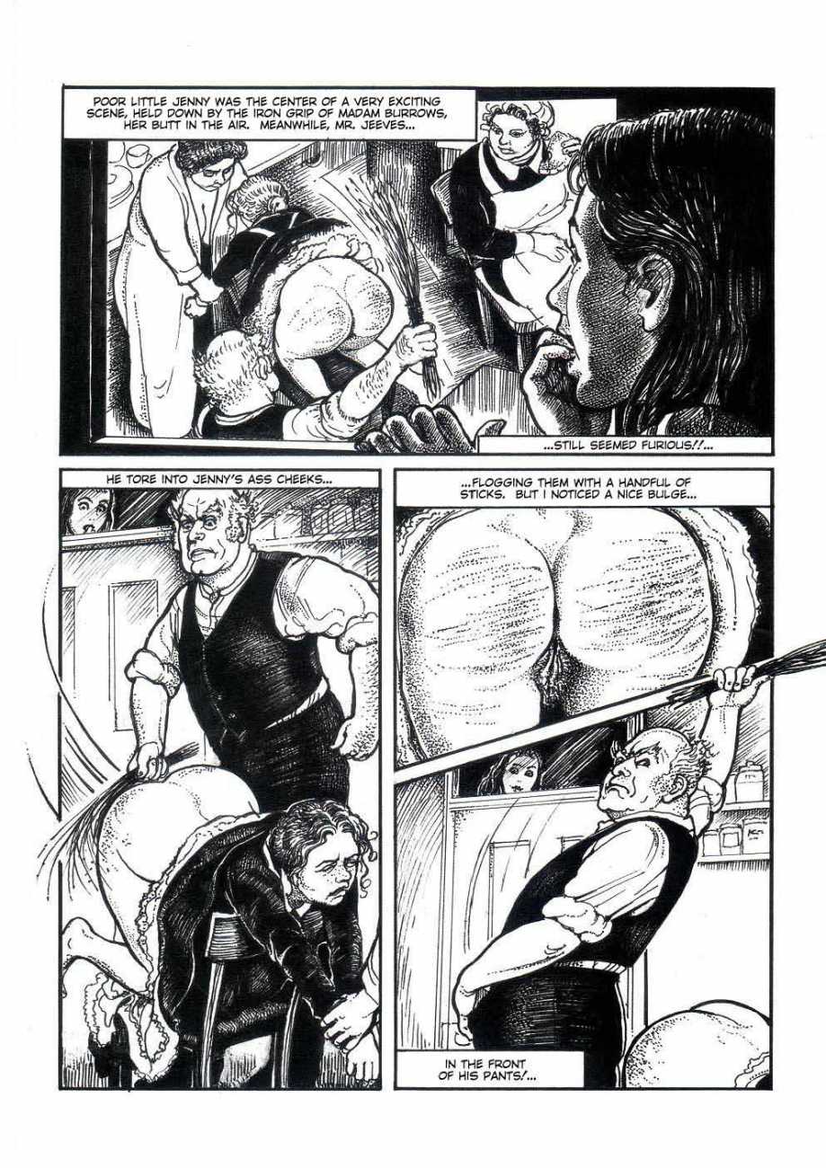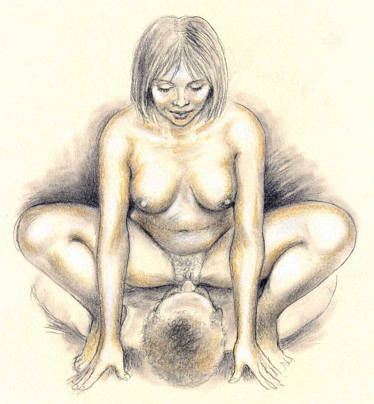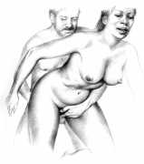 Russell’s drawing style is realistic, carefully-drawn detailed drawings in pencil and ink. In her coloured works she uses crayons and occasionally pastels, as in a series of fantastic body landscapes (‘bodyscapes’), probably her most ambitious works, in which female bodies are seen as part of landscapes. In her drawings she often appears as self-portraits, and some of her picture stories have an autobiographical background. In How I discovered CP she describes how she first encountered the world of the BDSM in the style of The Story of O, and a similar scenario appears in Sophisticated Ladies.