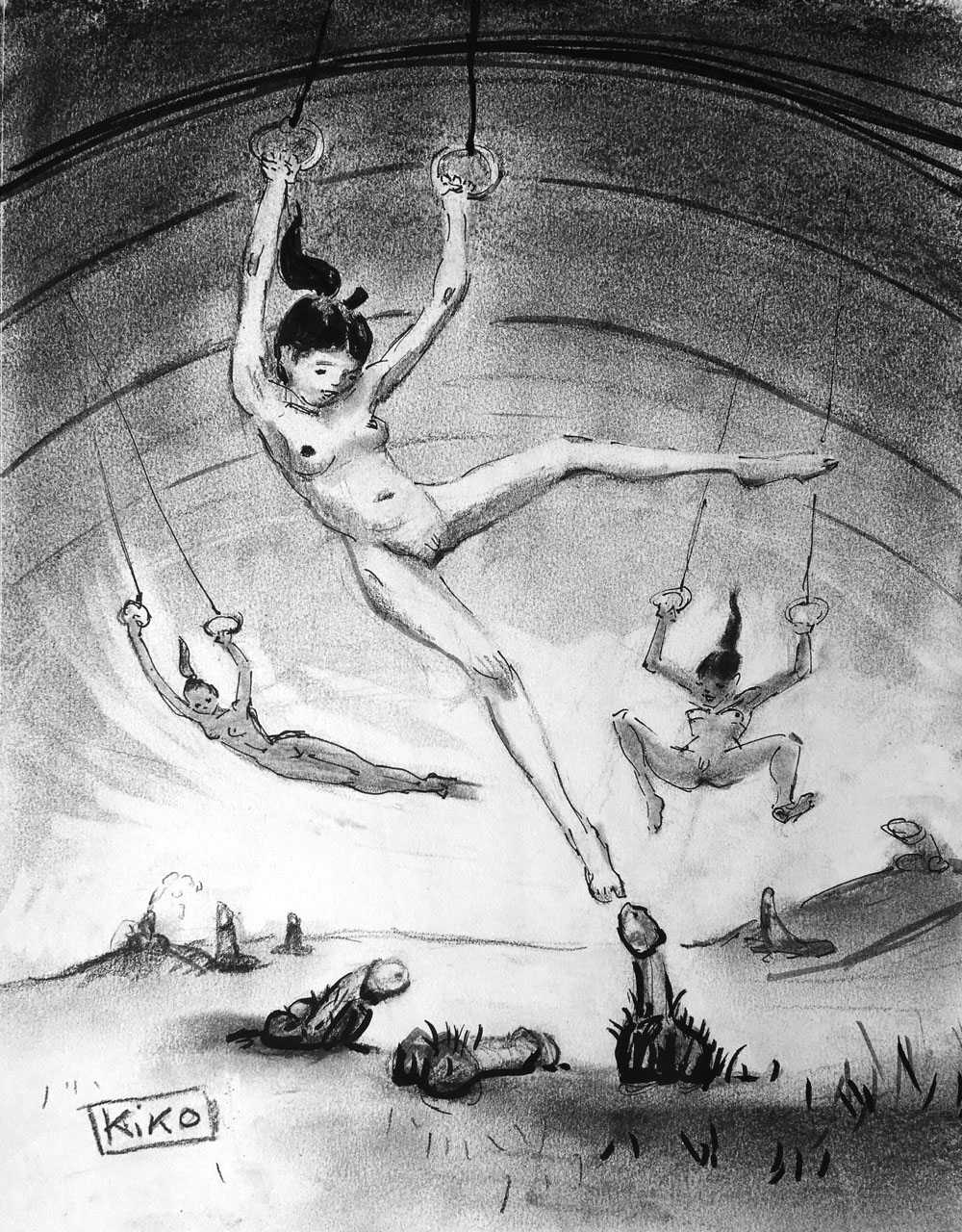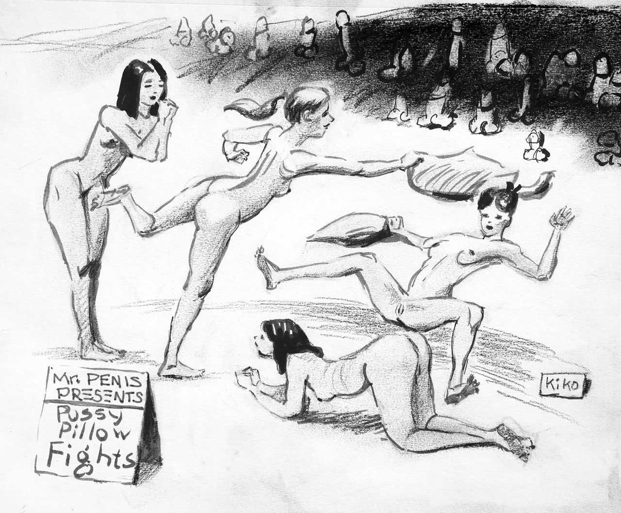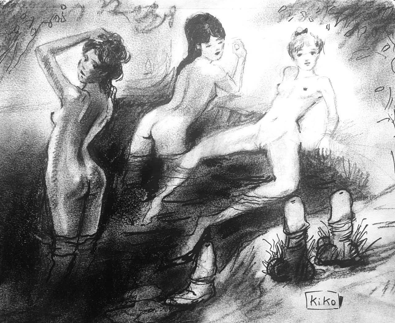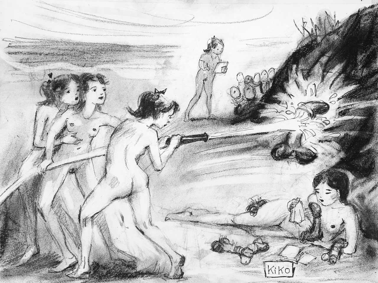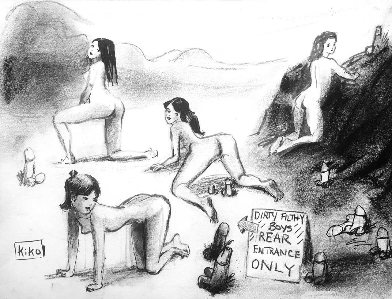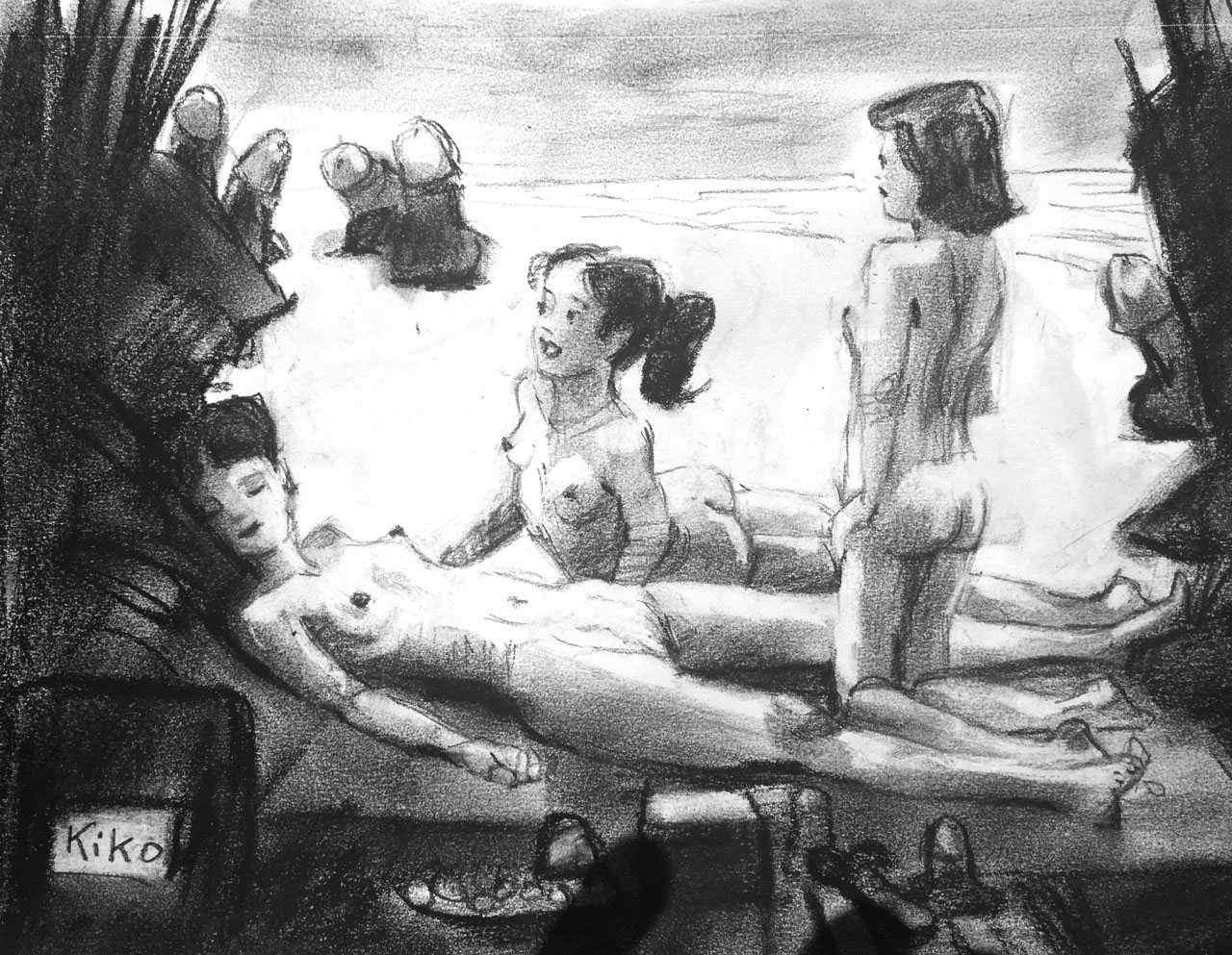 KiKo/Fernandez is best known for his brightly-coloured Indian ink paintings of children, dancers, teddy bears – and Charlie Chaplin. But he has also created street art, and – as in this series of erotic drawings – some witty and well-observed commentary on sexual relationships.