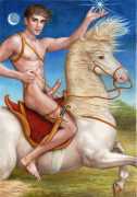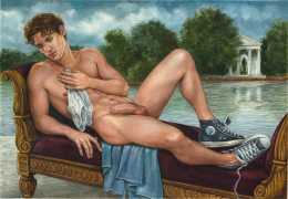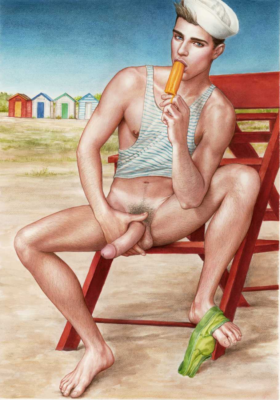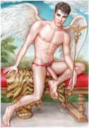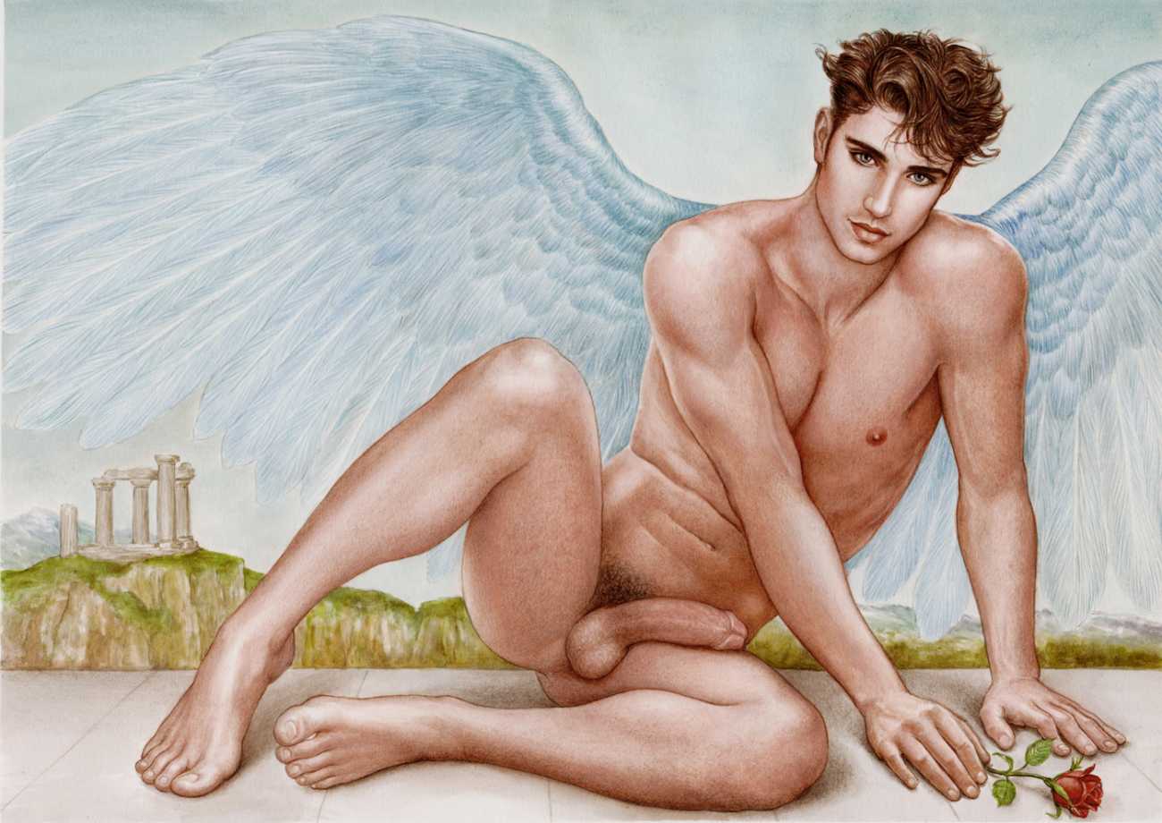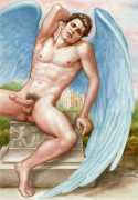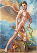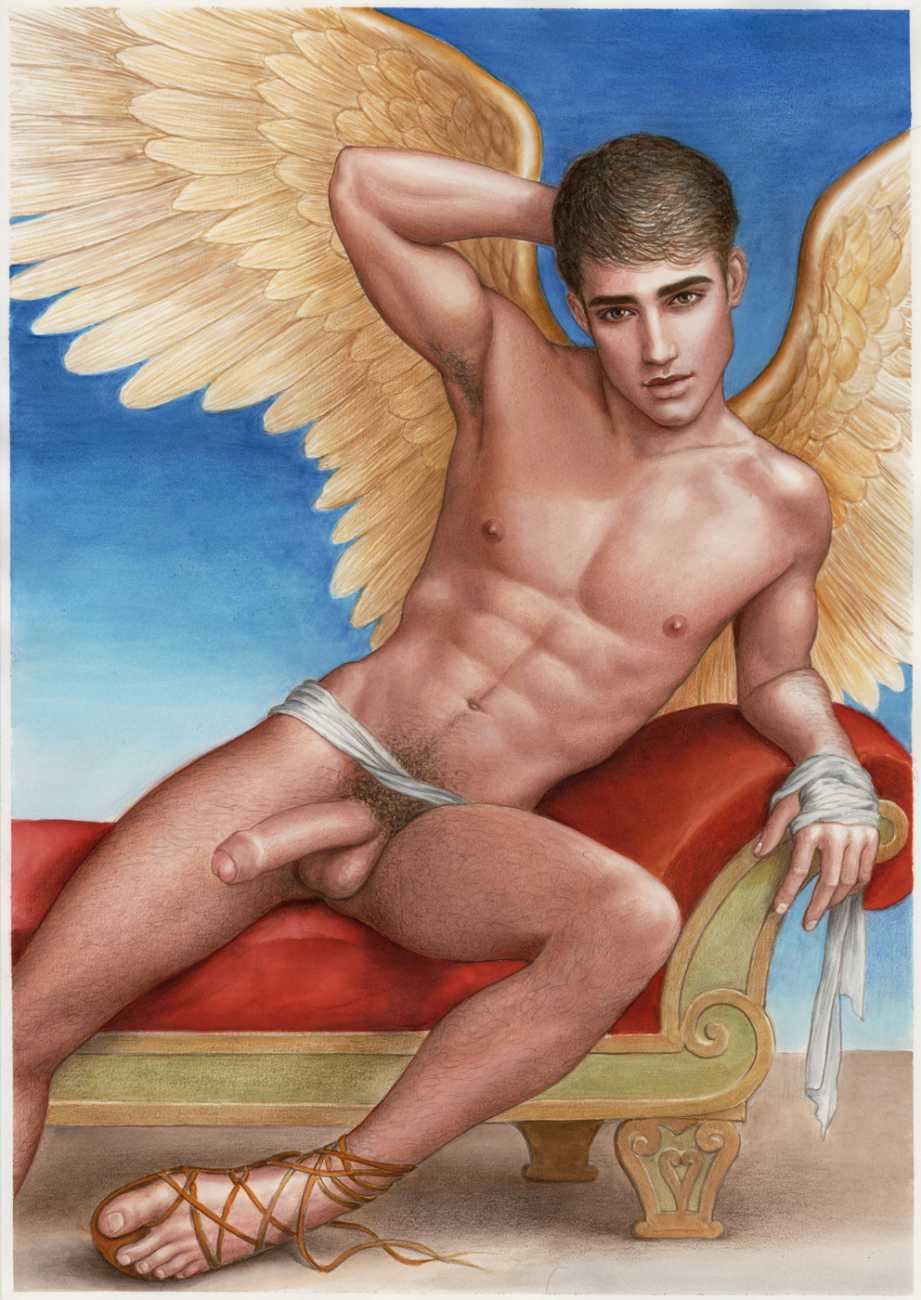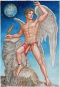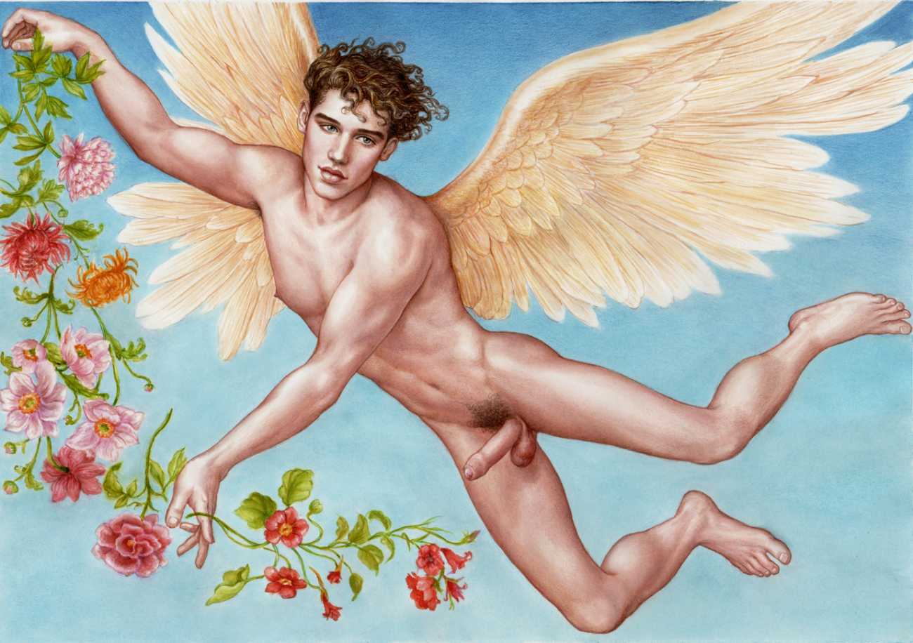 Another of his favourite themes is that of angels, archangels, fallen angels and winged myths – the divine, the ethereal and the fantastic are blended together in these magical characters. Then there are his ‘pin-up boys’, young mechanics, eye candy cowboys, winking lifeguards and cheeky motorcyclists.