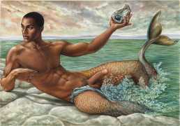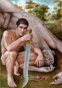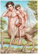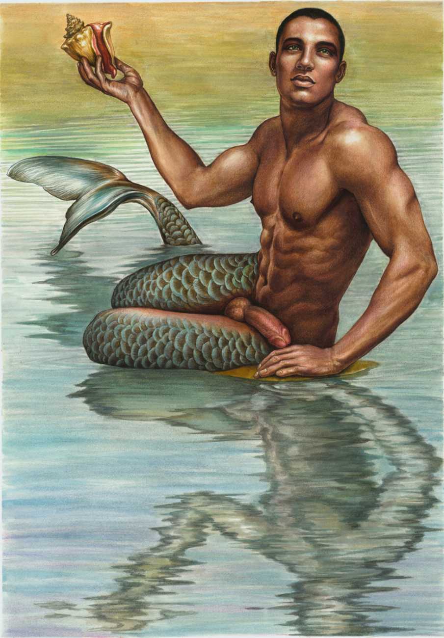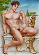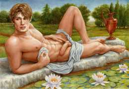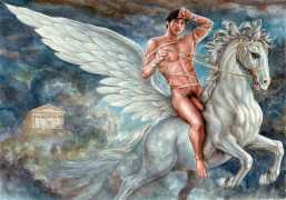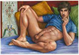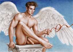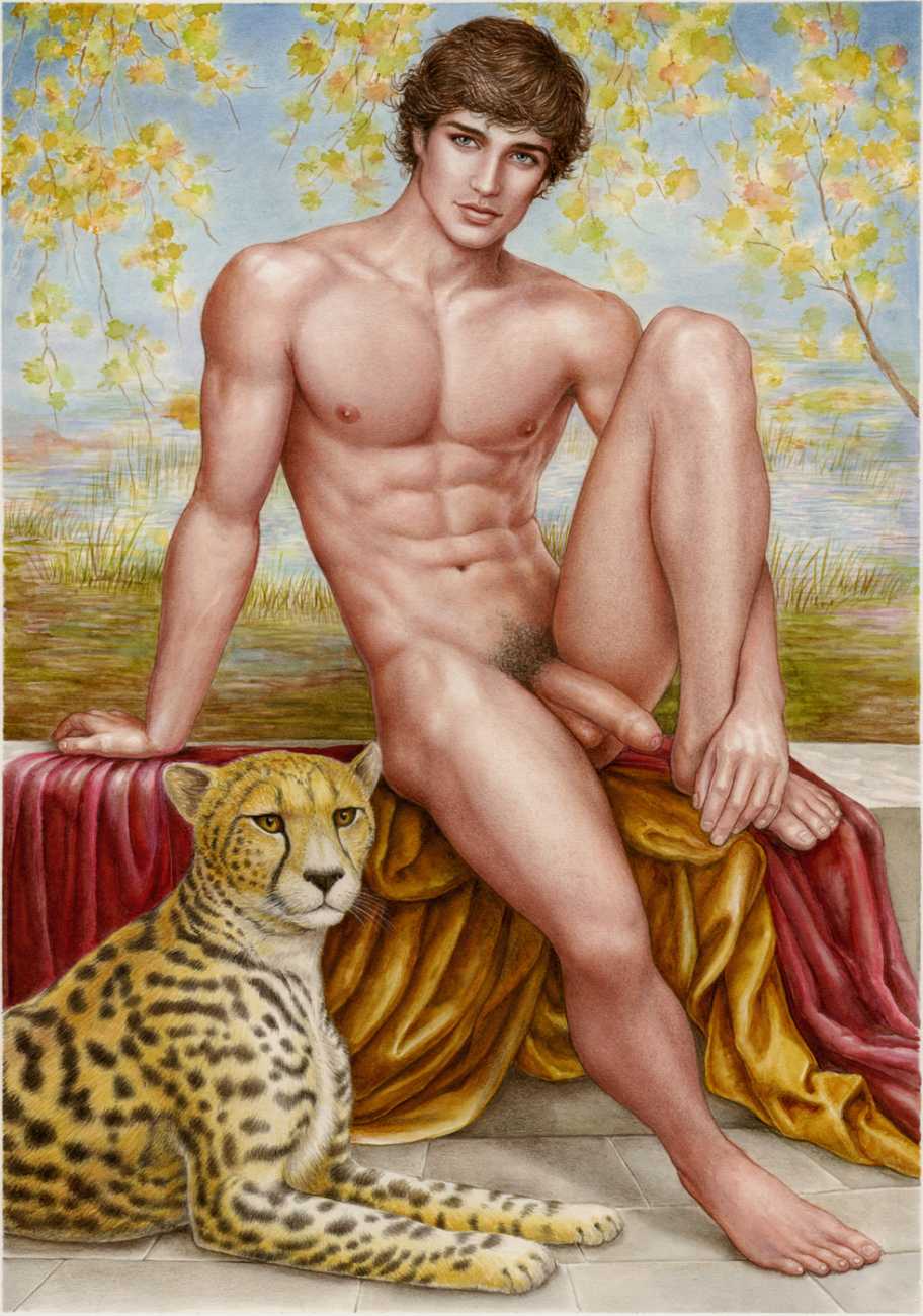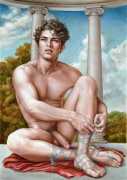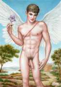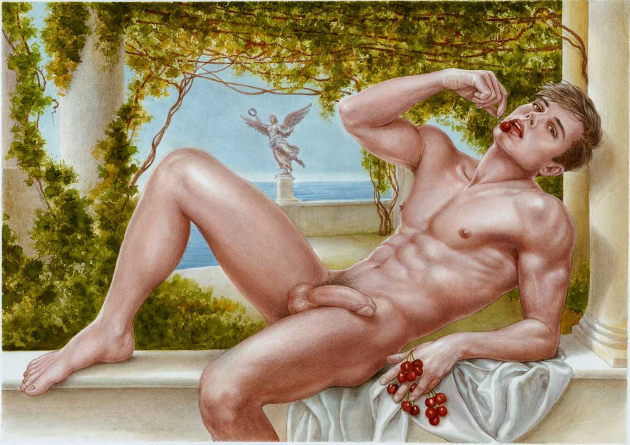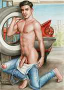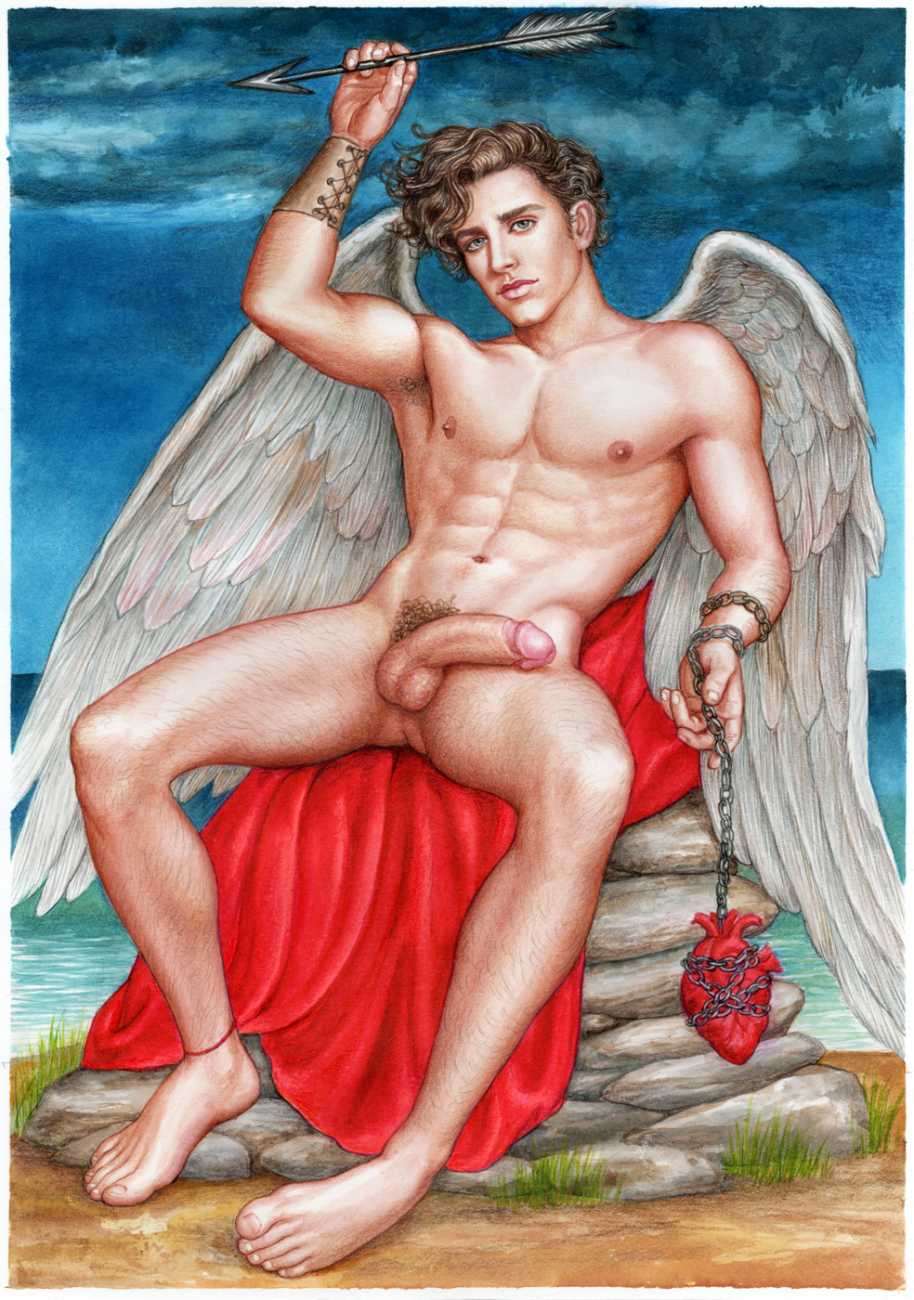 Another of his favourite themes is that of angels, archangels, fallen angels and winged myths – the divine, the ethereal and the fantastic are blended together in these magical characters. Then there are his ‘pin-up boys’, young mechanics, eye candy cowboys, winking lifeguards and cheeky motorcyclists.