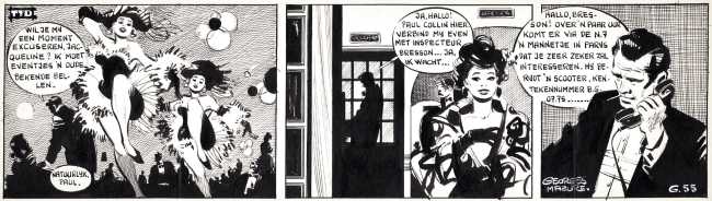 We can be sure that ‘Maurice Charroux’ is a pseudonym, as there is no record of any artist of that name. We have not been able to identify any particular illustrator working on similar material in the late 1960s, though it has been suggested that ‘Maurice Charroux’ is a pseudonym of the Dutch illustrator Georges (sometimes George) Laurent Mazure, who together with his better-known brother Alfred (who created the popular comic strip Dick Bos), worked on a variety of comics from the late 1940s to the mid-1950s. Georges Mazure also created his own newspaper strip about a sexy female criminologist called Myra van Dijk, whose adventures he drew for Het Vrije Volk, and another erotic heroine, Jacqueline, for several Dutch regional papers. Apart from the similarity in subject matter, however, we have no direct evidence that ‘Charroux’ and Mazure are the same artist.
