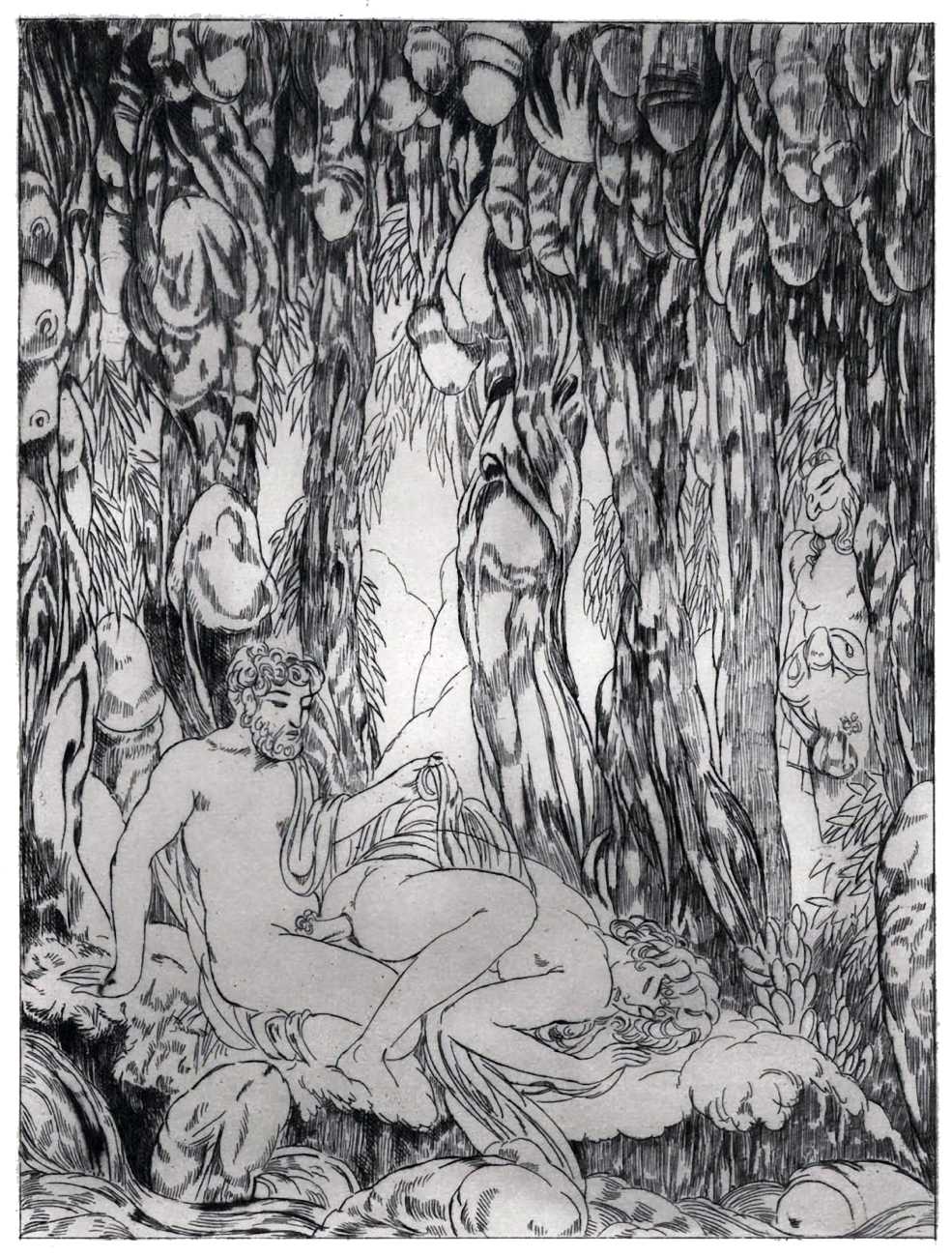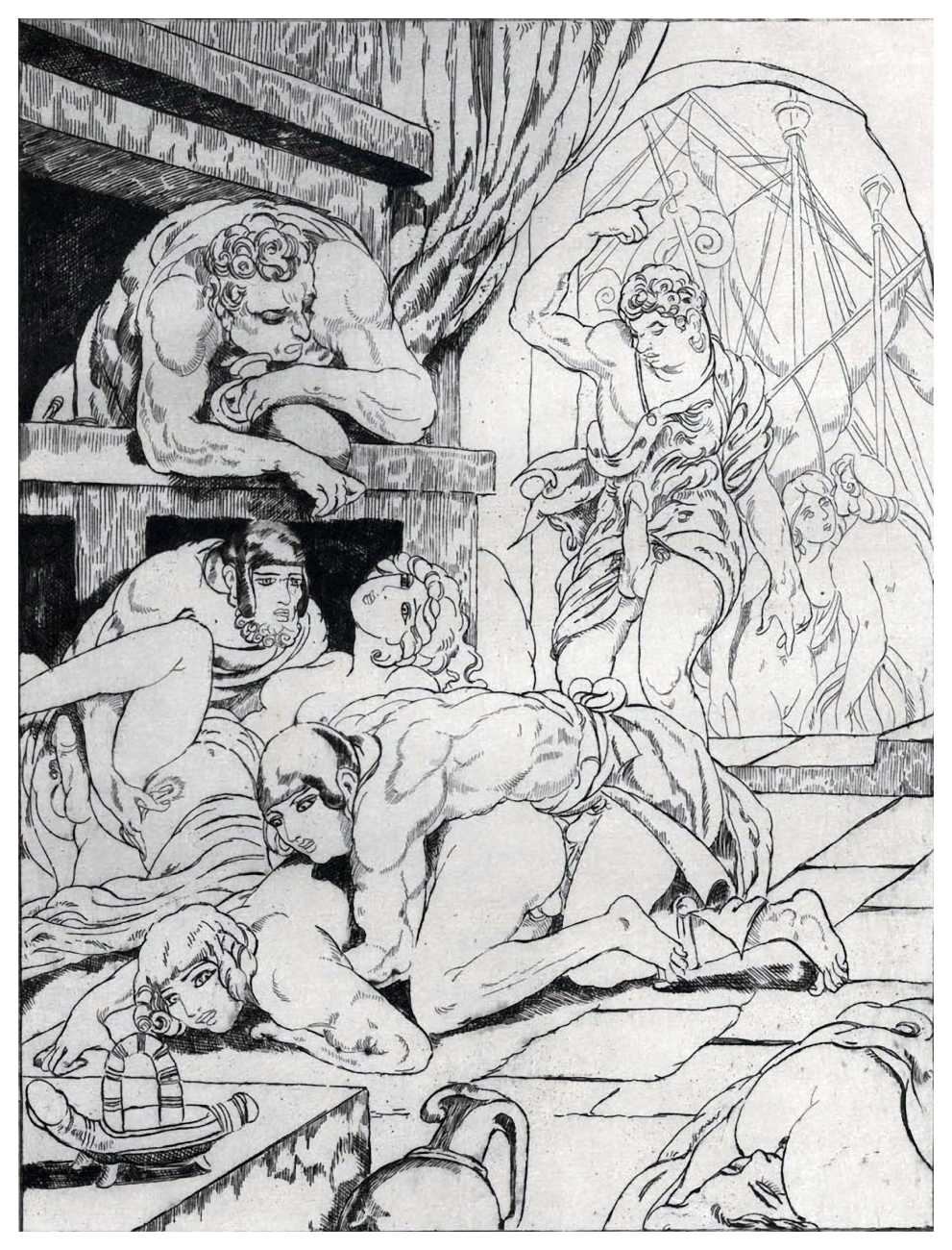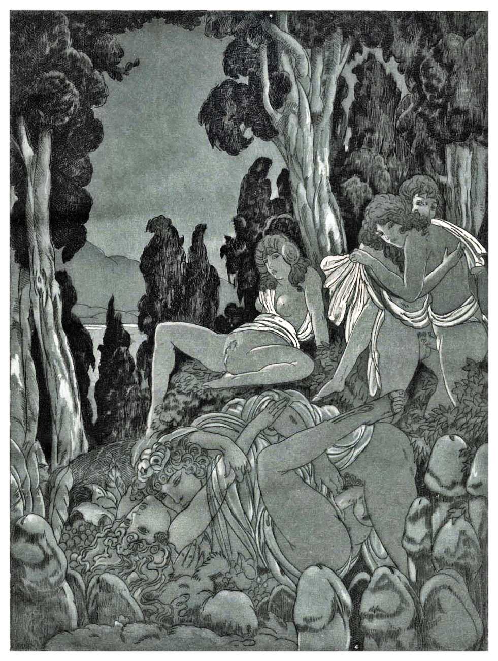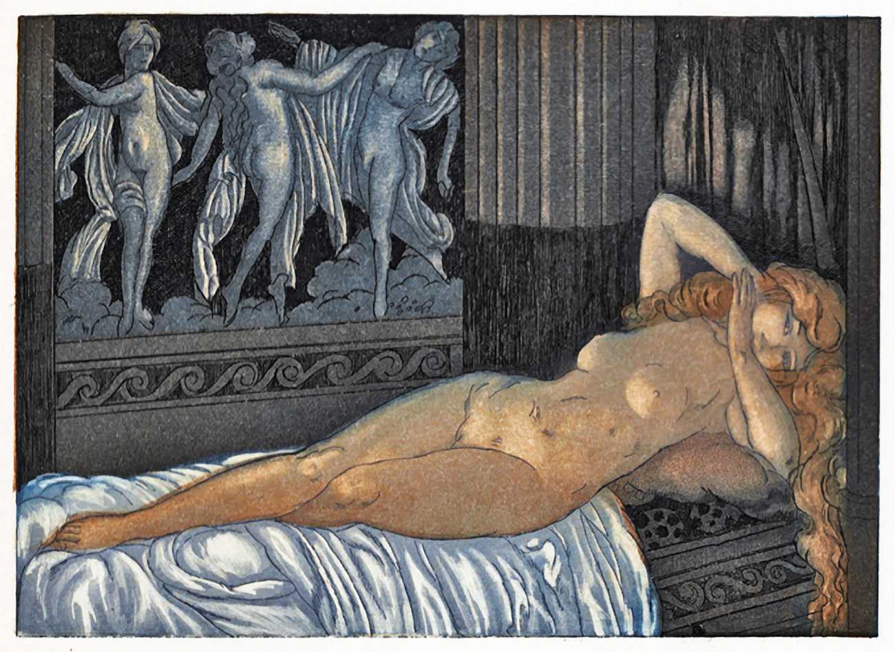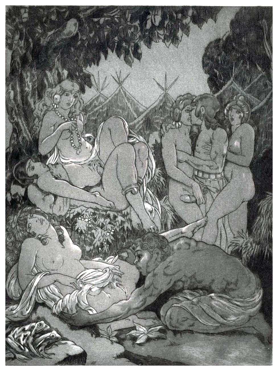 For his more erotic portfolios, starting with the privately-published Le moyen de parvenir in 1921, de Becque often signed his art with the pseudonym Maurice d’Attys, presumably related to the Greek and Phrygian god Attis, who through self-castration, death and resurrection represents the fruits of the earth which die in winter only to rise again in the spring.
